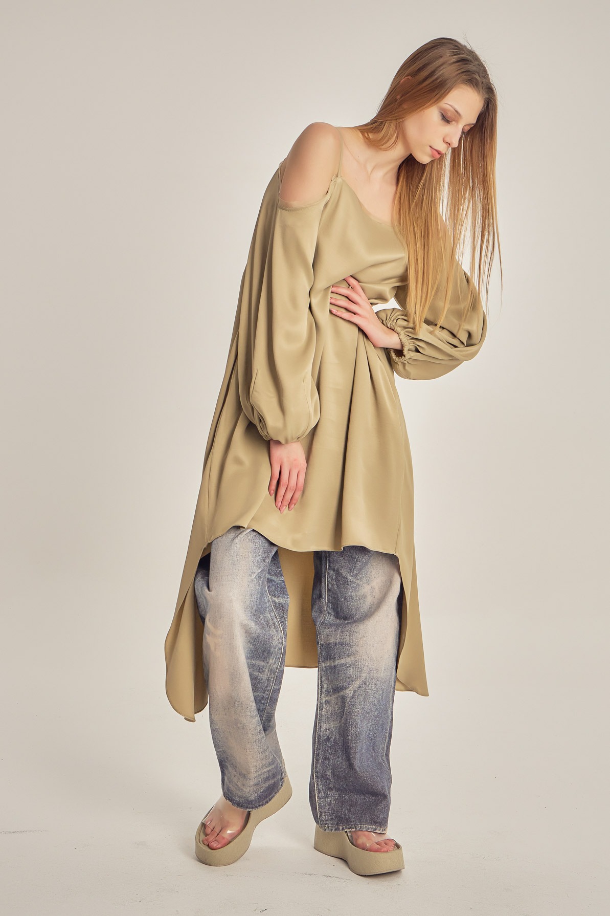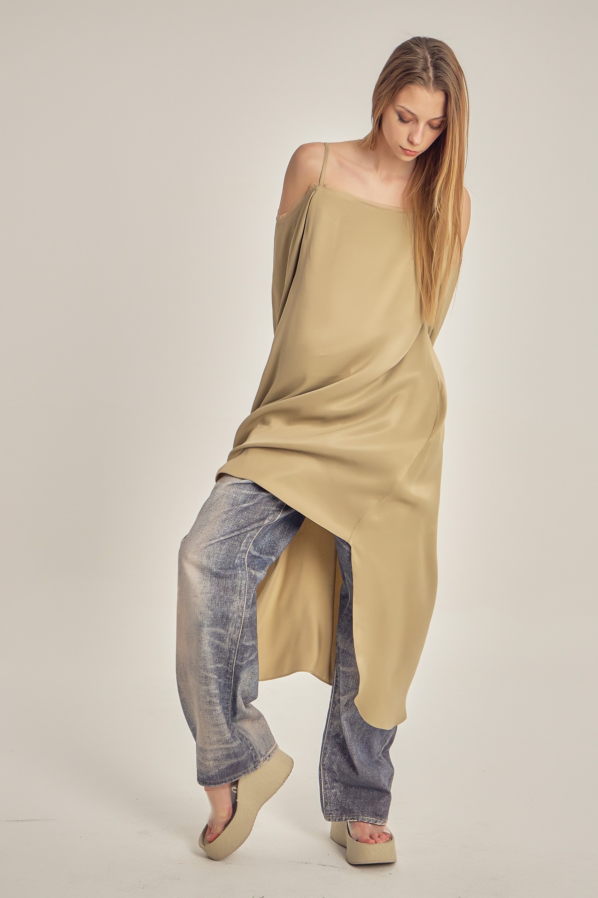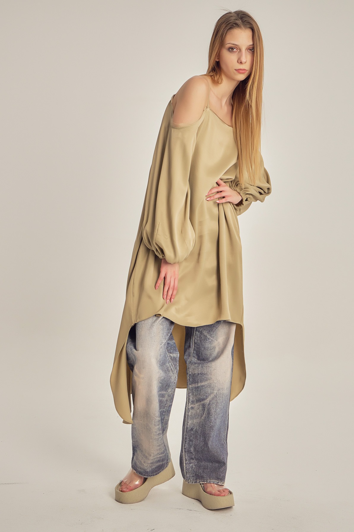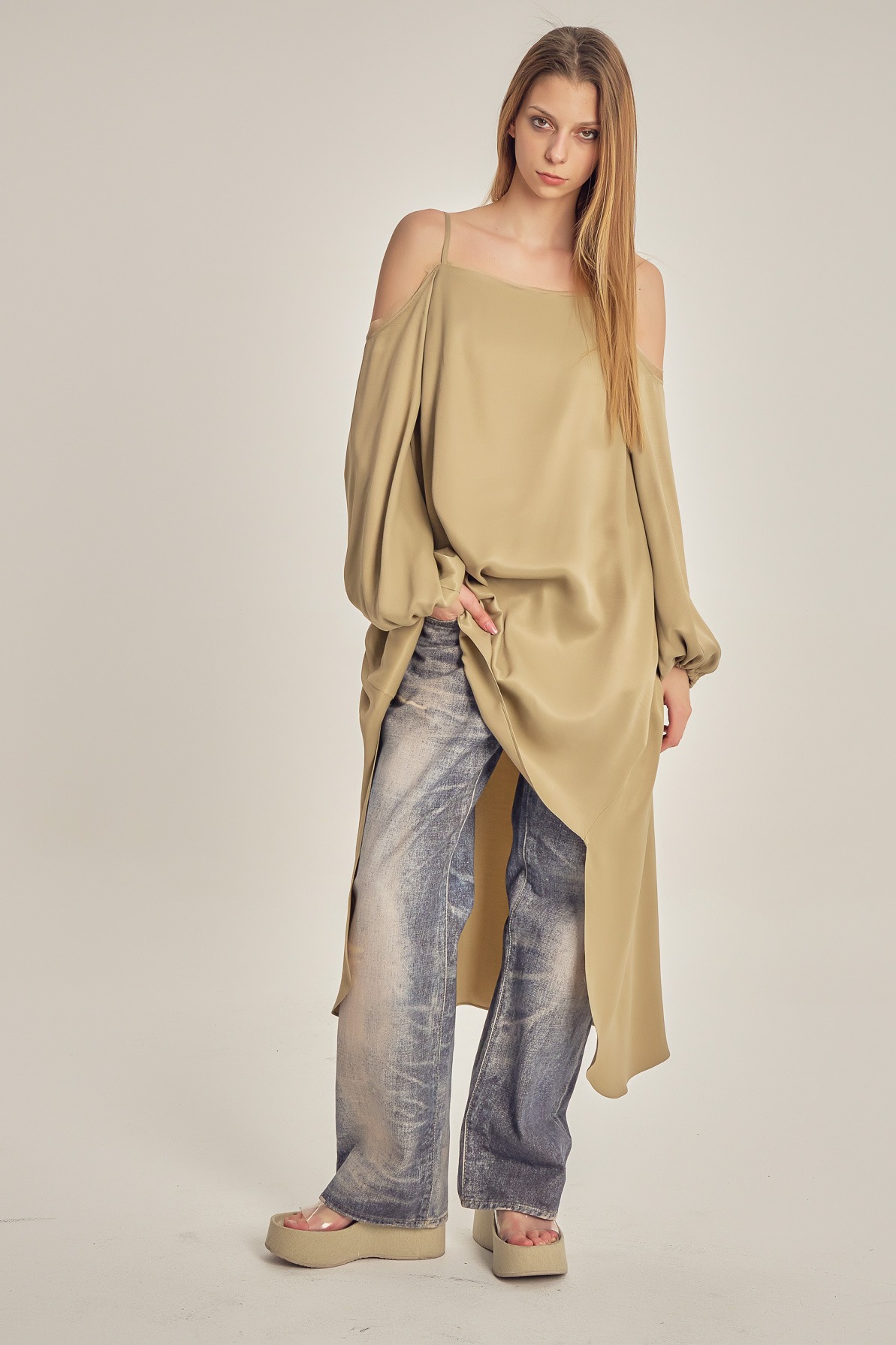 Satin-finish viscose dress with a fluid drape and subtle sheen. The relaxed silhouette and off-shoulder details create an effortlessly feminine look, perfect for both daytime and evening wear.
