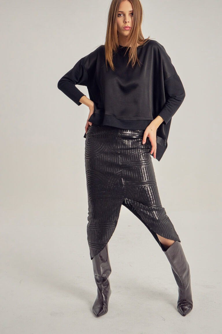 Loose lace blouse with jersey trimmings.