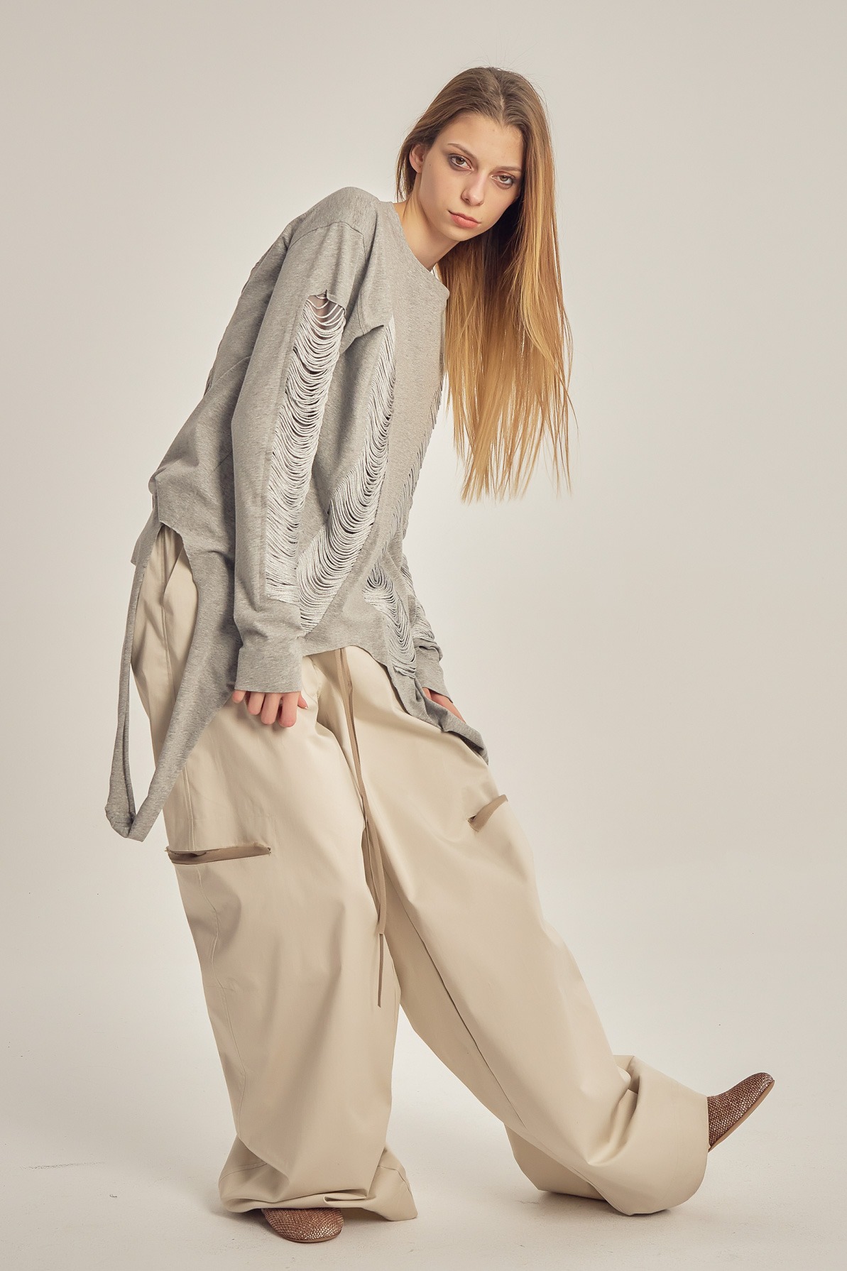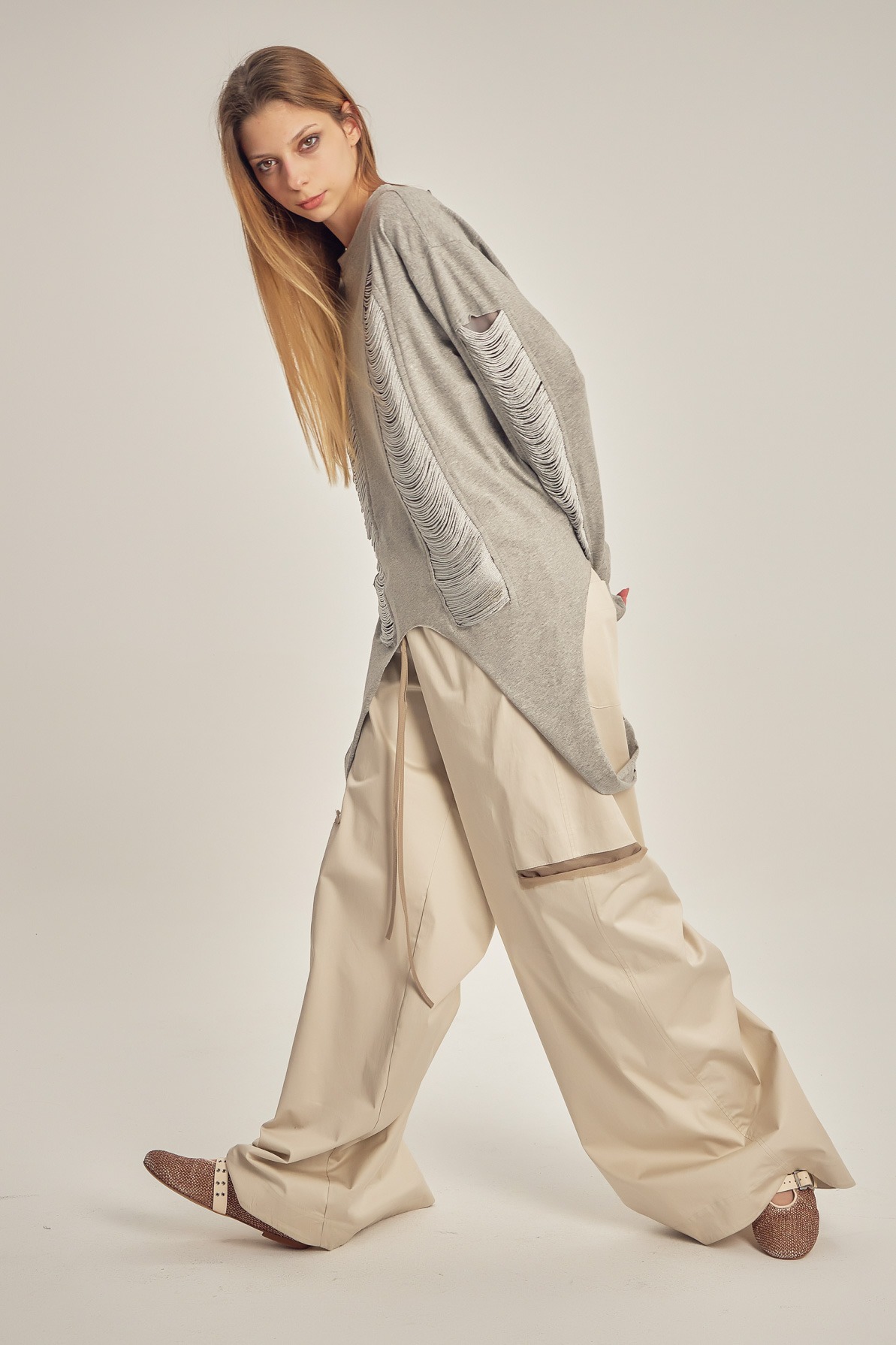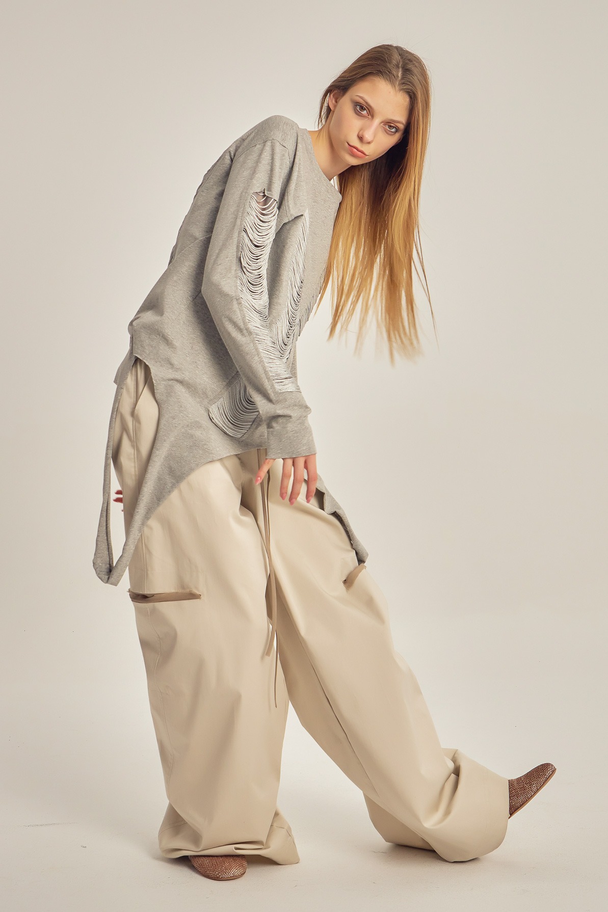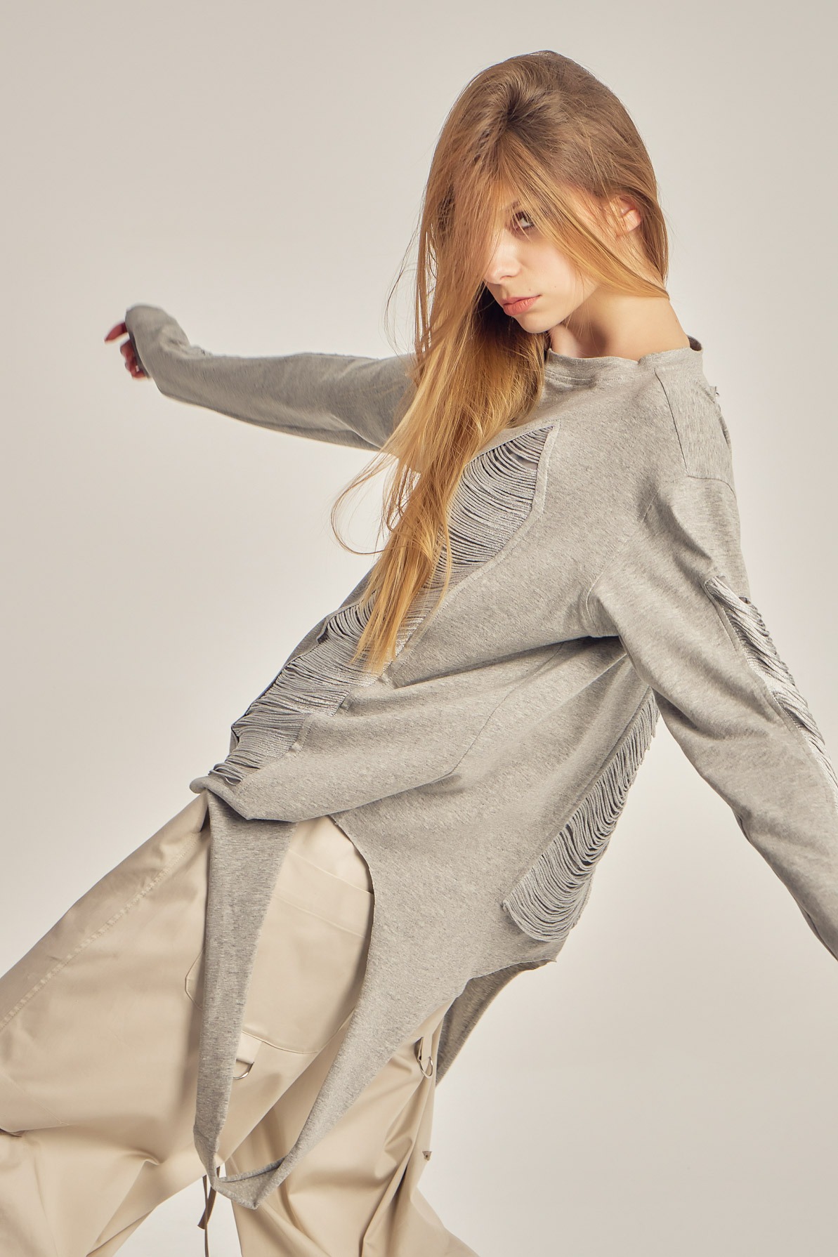Jersey top featuring decorative cut-outs and applied fringe details that add movement and a statement touch. The relaxed fit and fluid lines create a contemporary look, easy to style for casual outfits or more creative, fashion-forward combinations.