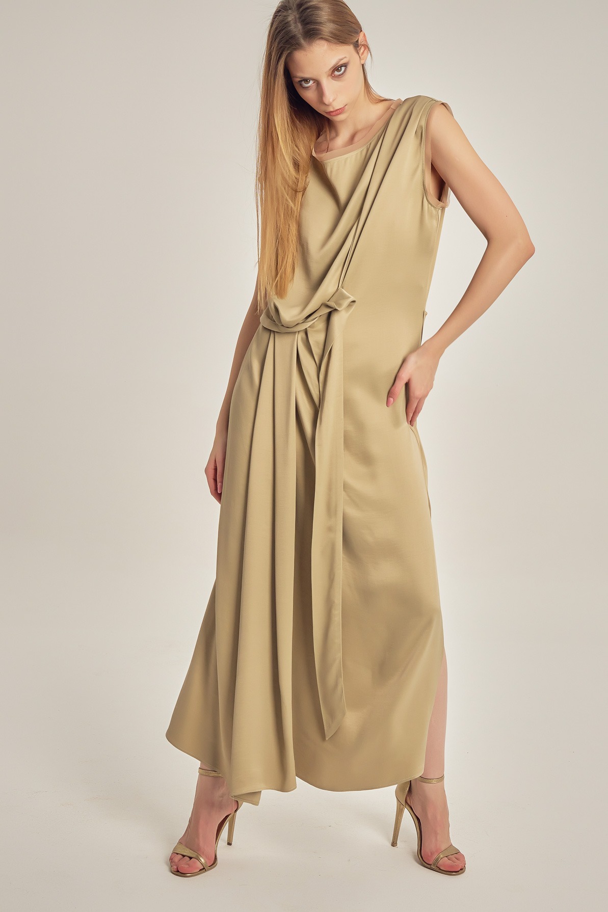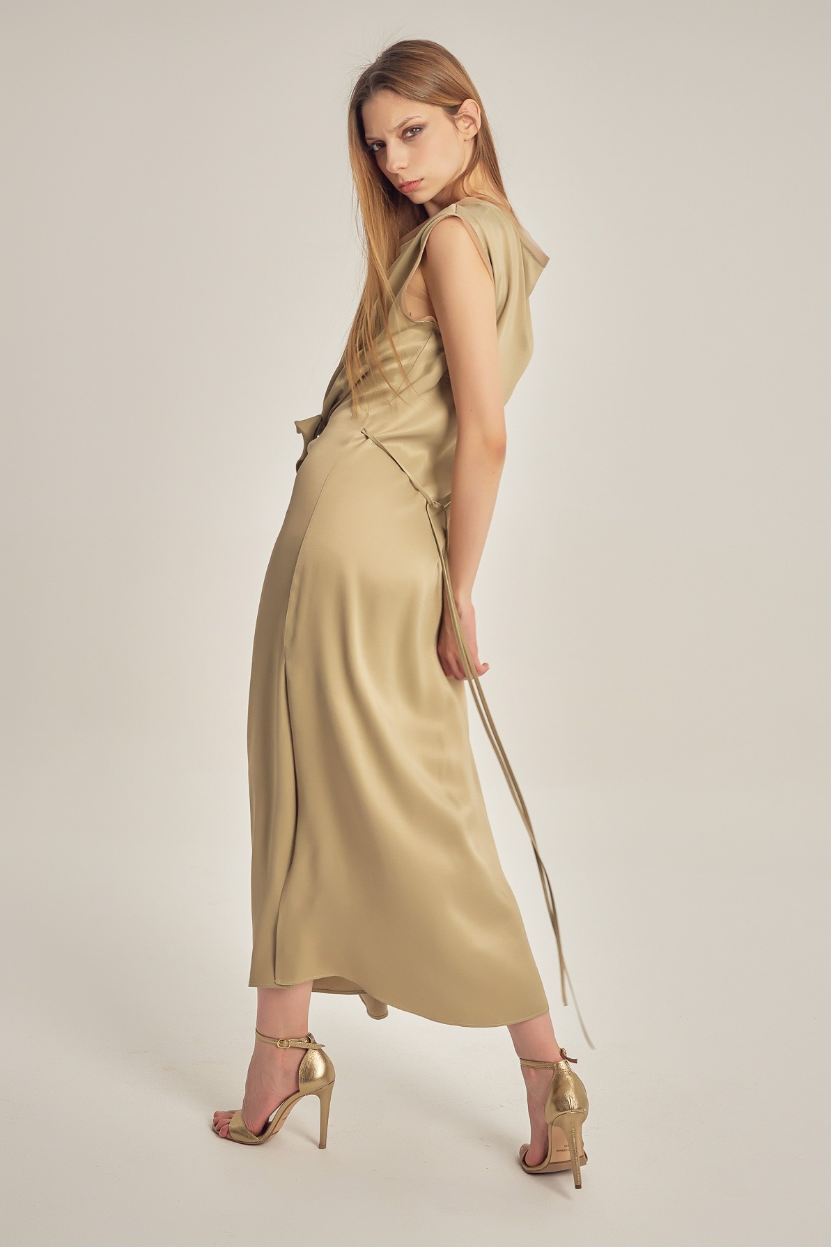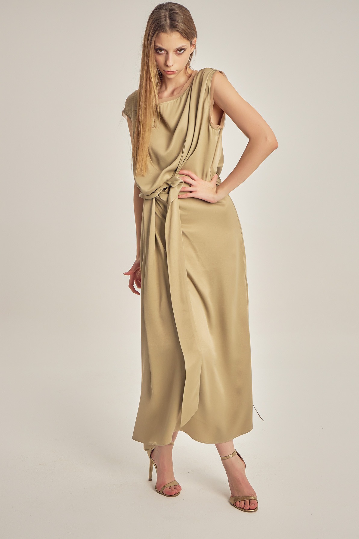 Satin-finish viscose dress with a fluid drape and subtle sheen. The asymmetrical design, featuring a one-shoulder cut and waist knot detail, elegantly enhances the silhouette for a refined, modern look.