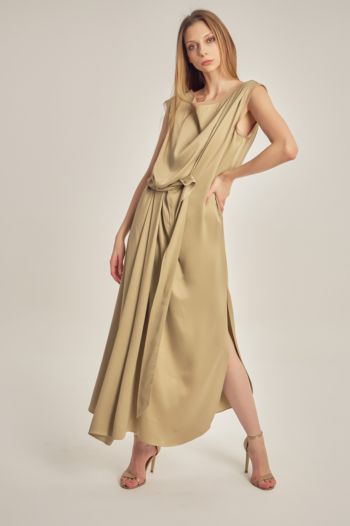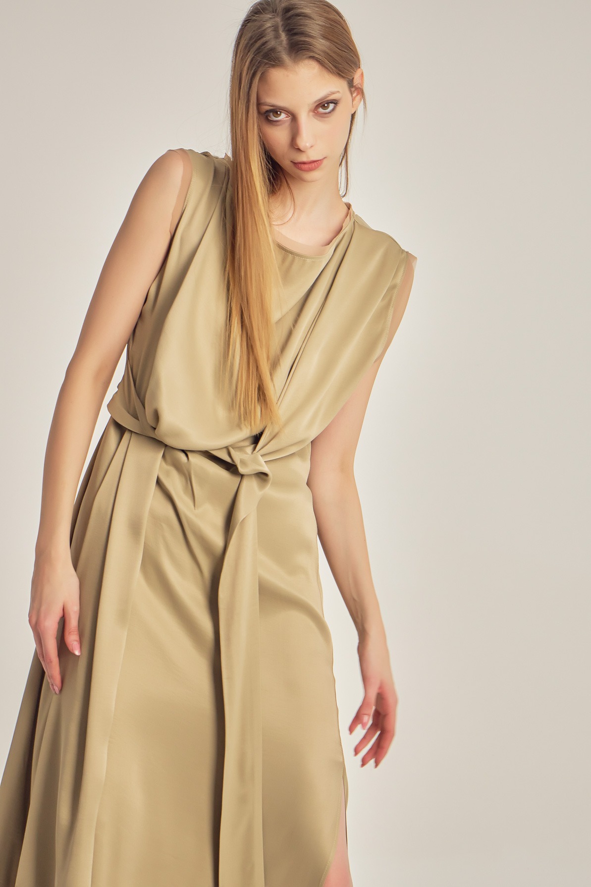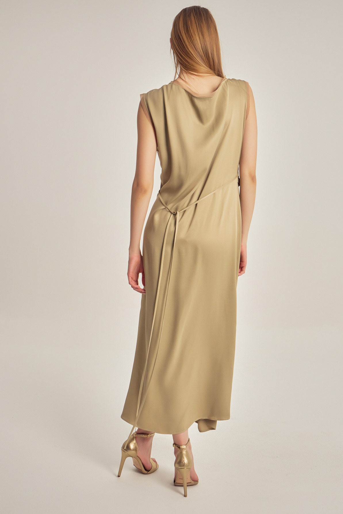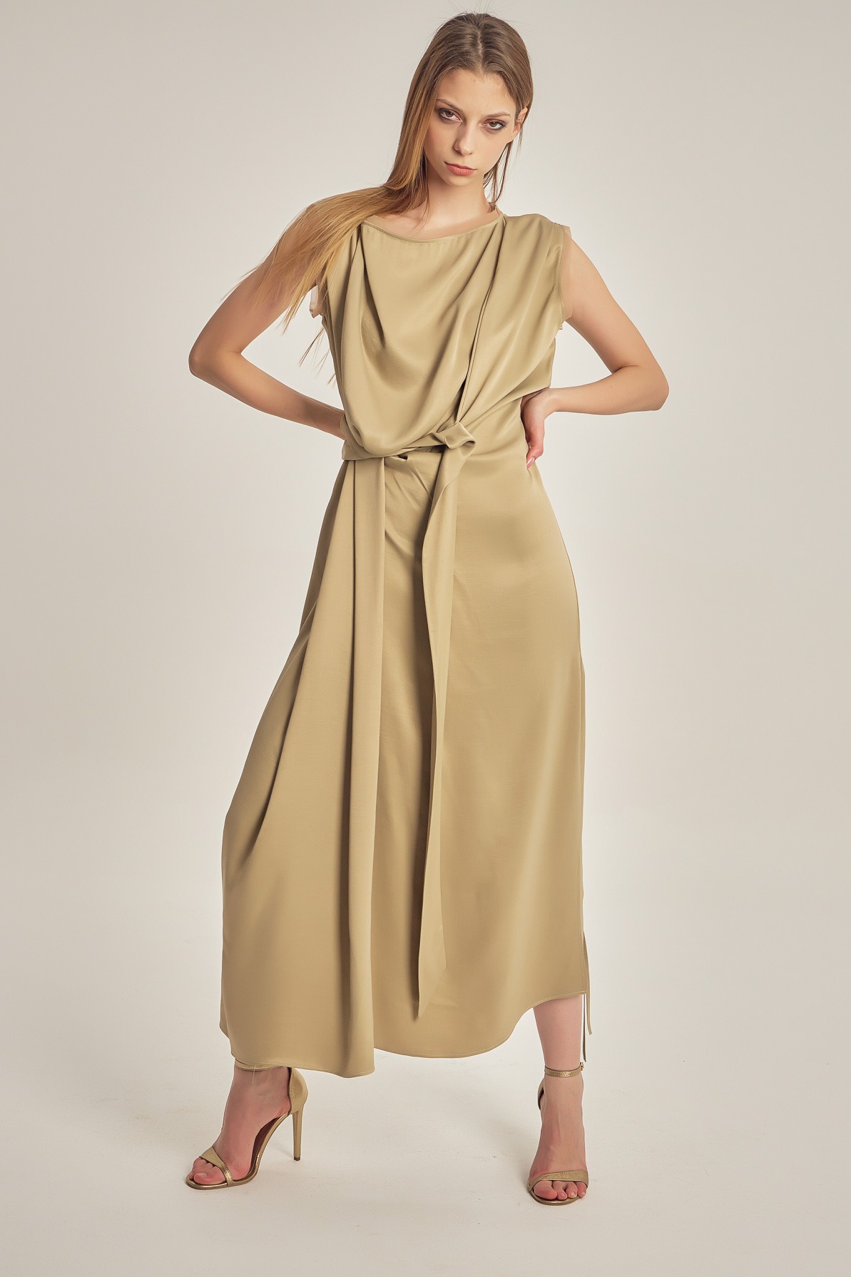 Satin-finish viscose dress with a fluid drape and subtle sheen. The asymmetrical design, featuring a one-shoulder cut and waist knot detail, elegantly enhances the silhouette for a refined, modern look.