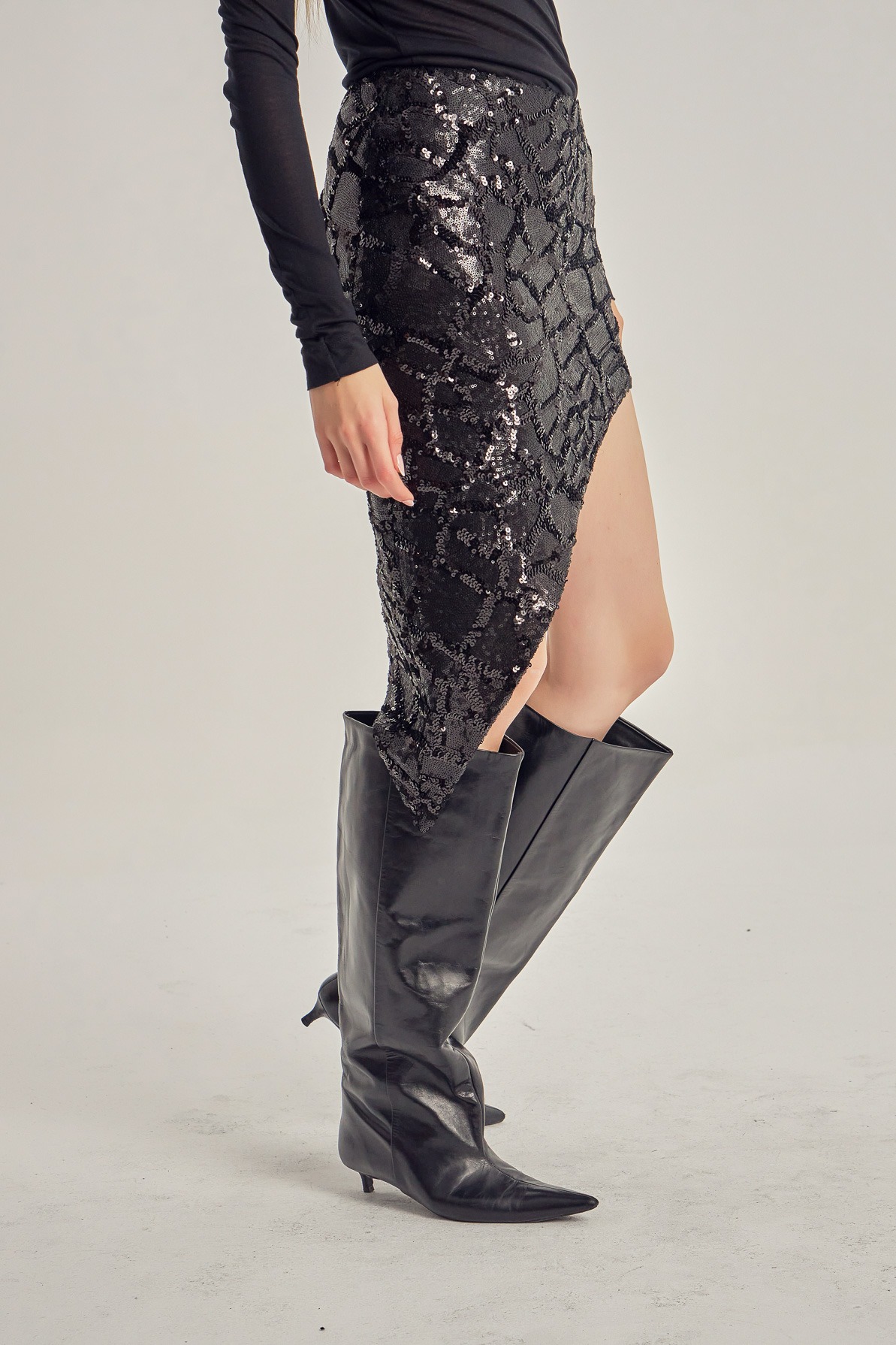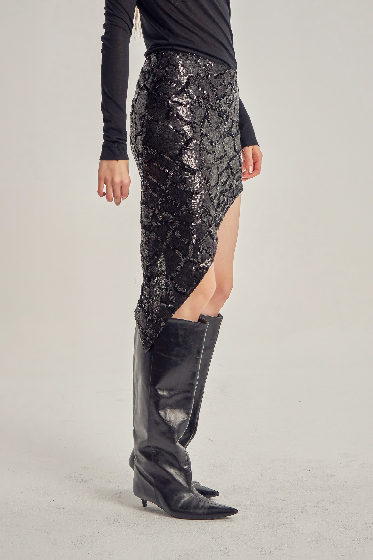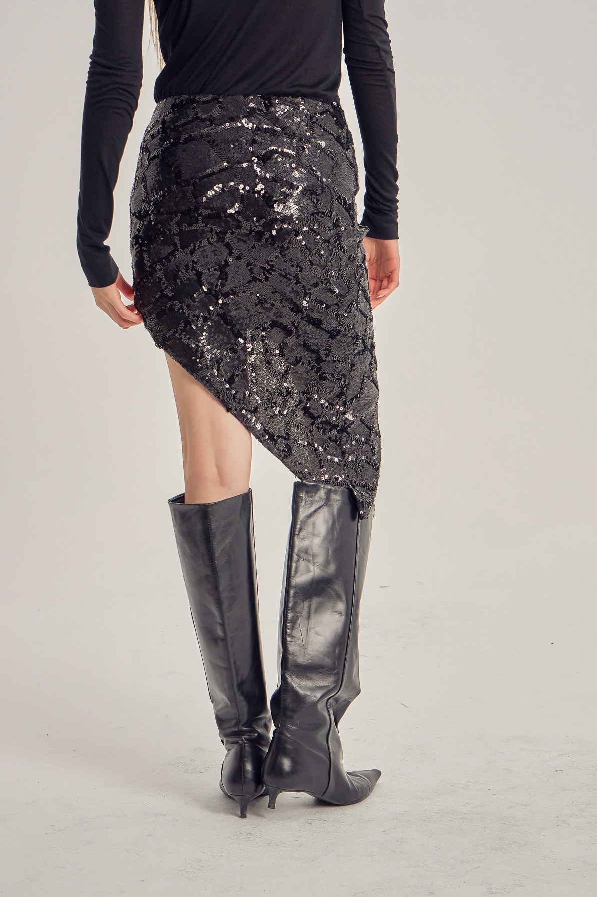 Mini skirt crafted from sequin-embellished fabric, defined by an asymmetrical cut that subtly highlights the silhouette. The contrast between the textured surface and the diagonal line creates a balance between controlled shine and contemporary attitude.