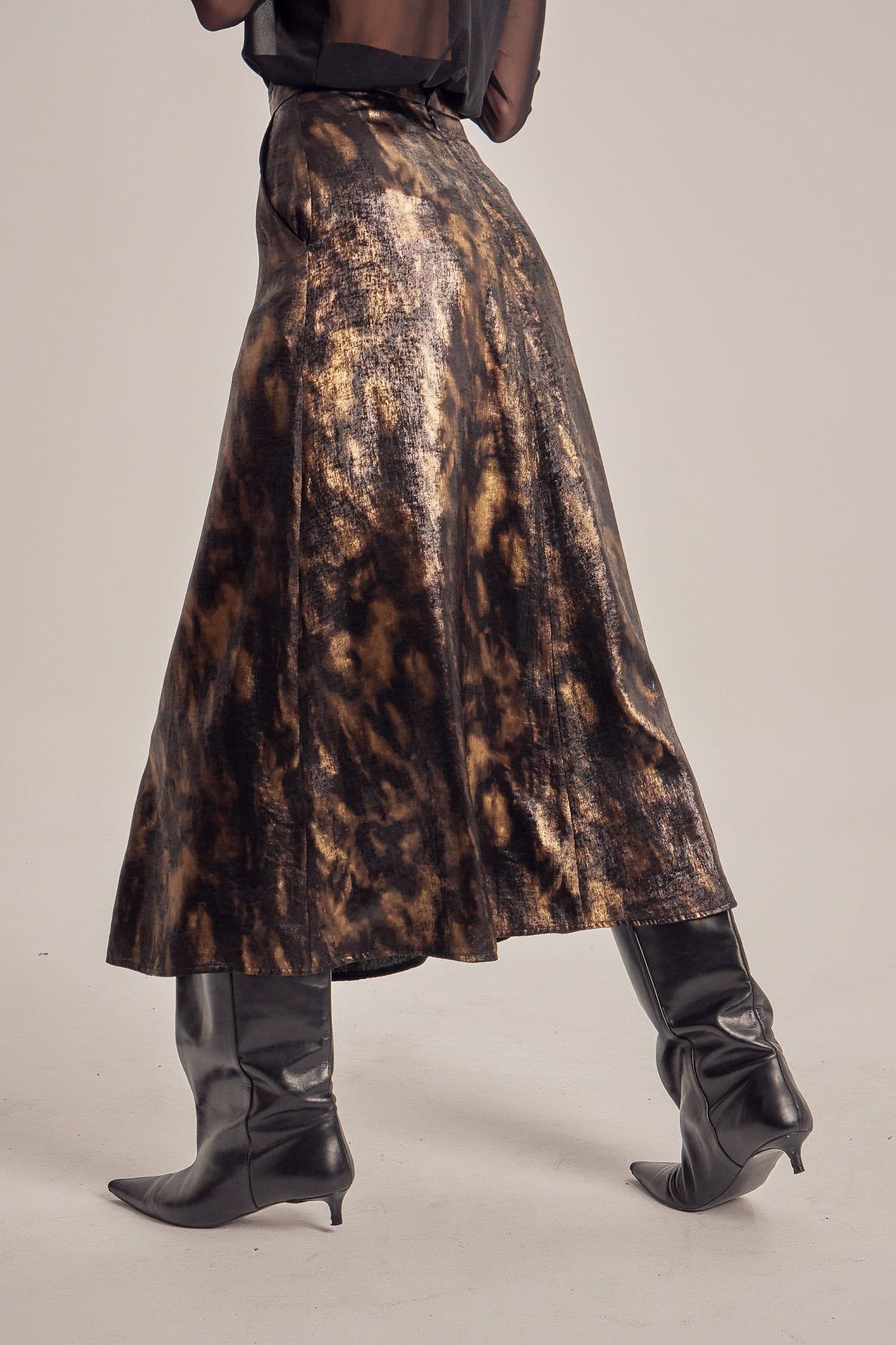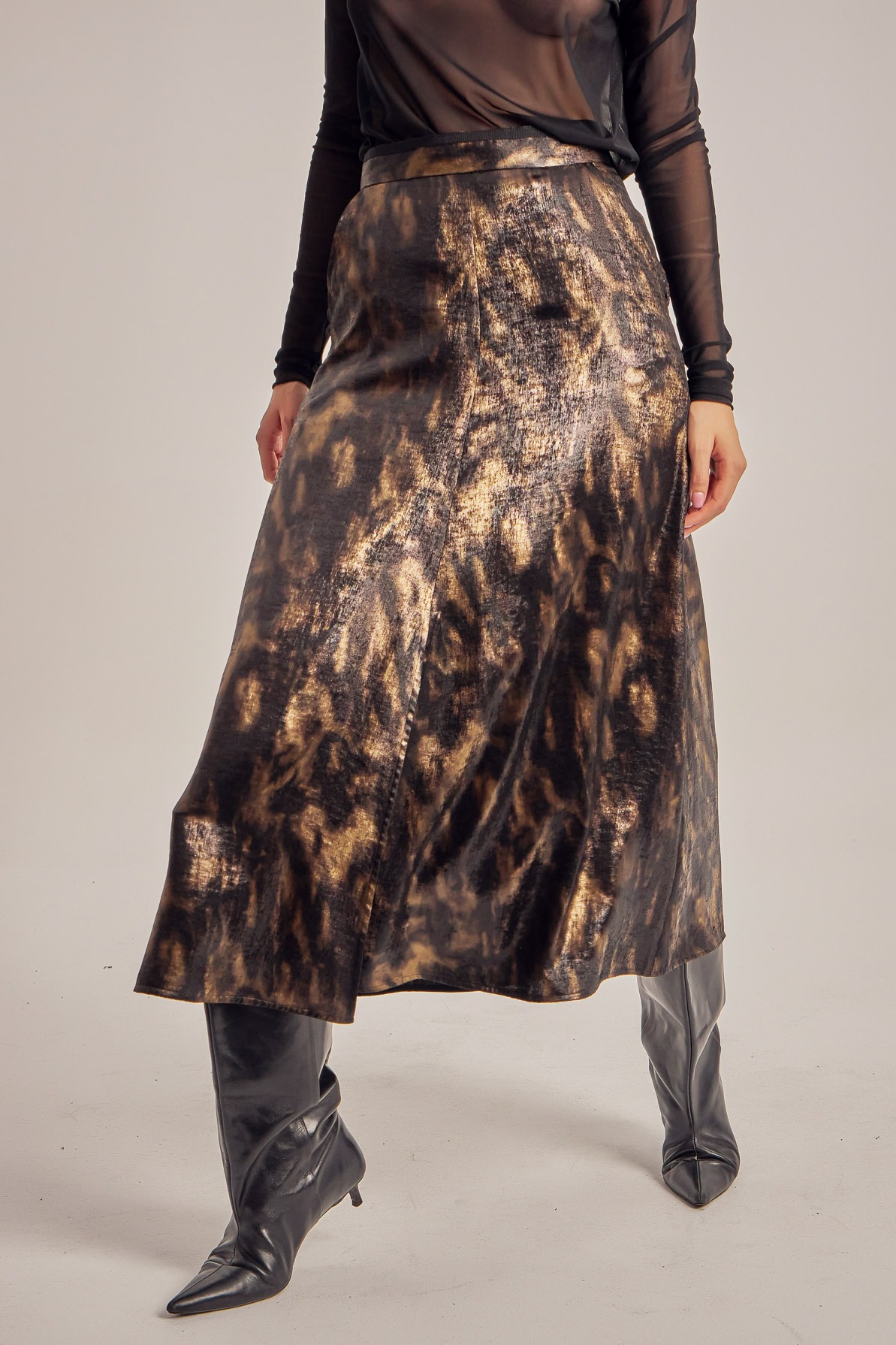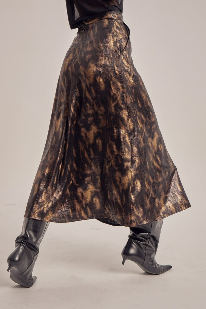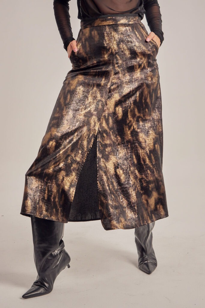 Printed satin flared midi skirt with high waist, side pockets, and a front slit.
