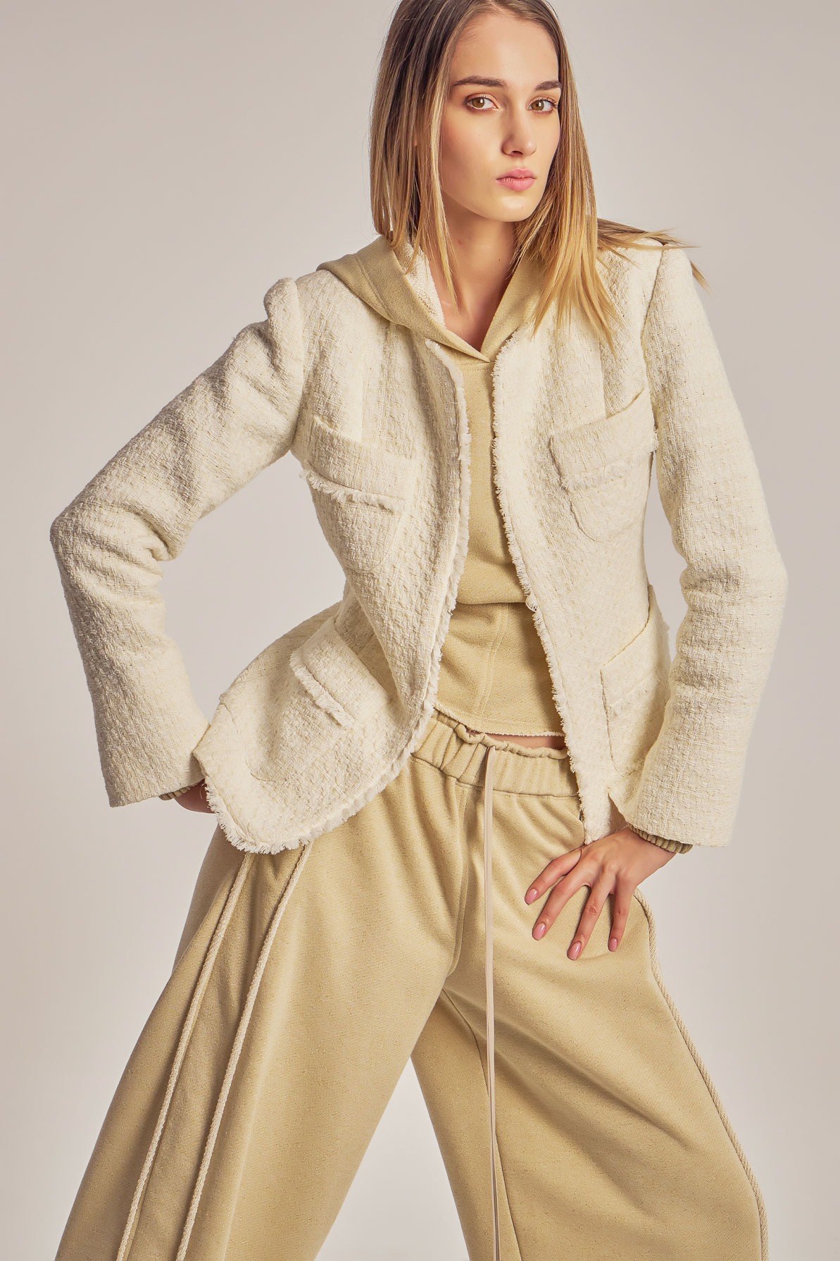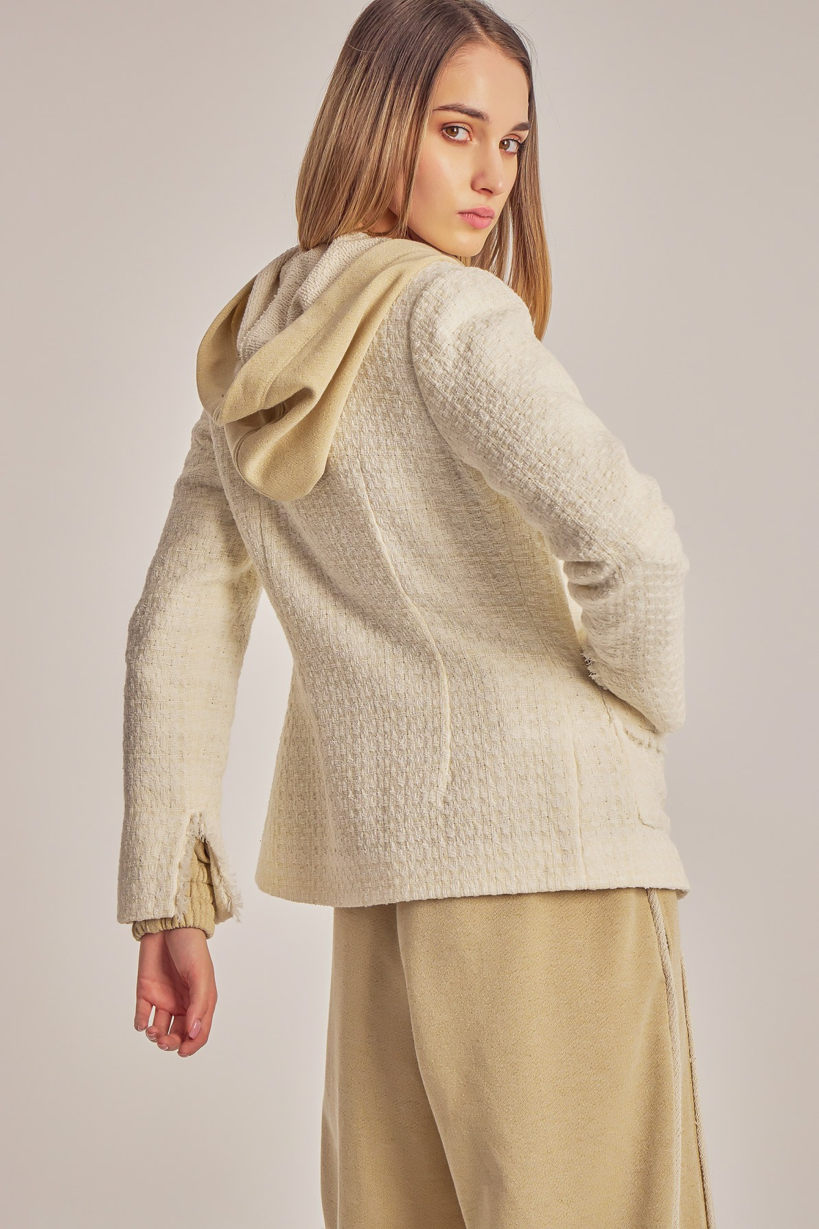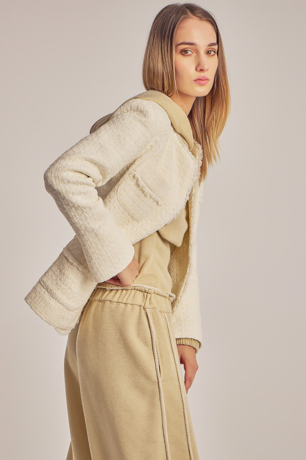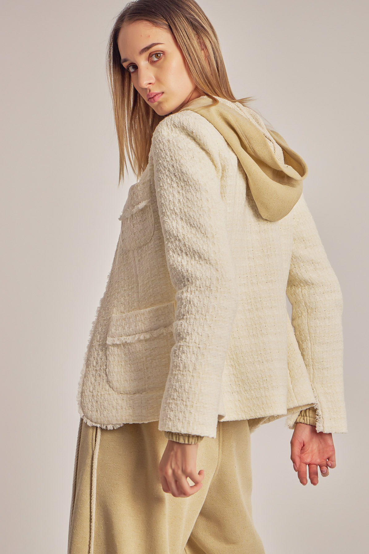 Boucle blazer with fringed trimmings.