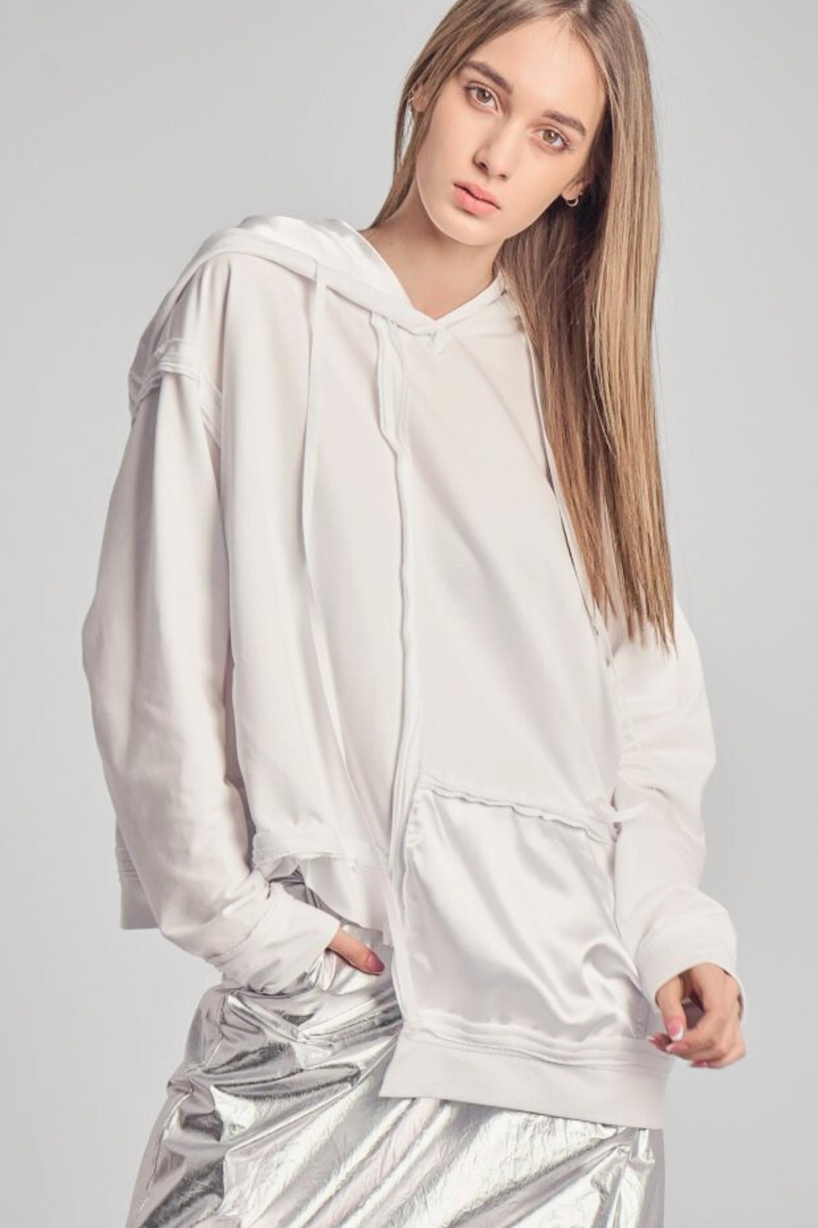 Loose cotton jersey hoodie with a viscose satin pocket in the front.