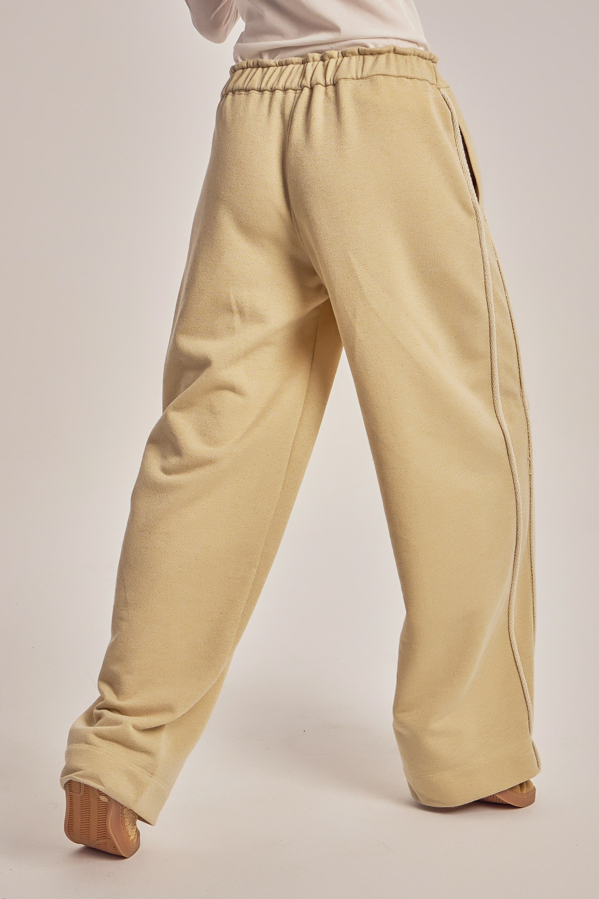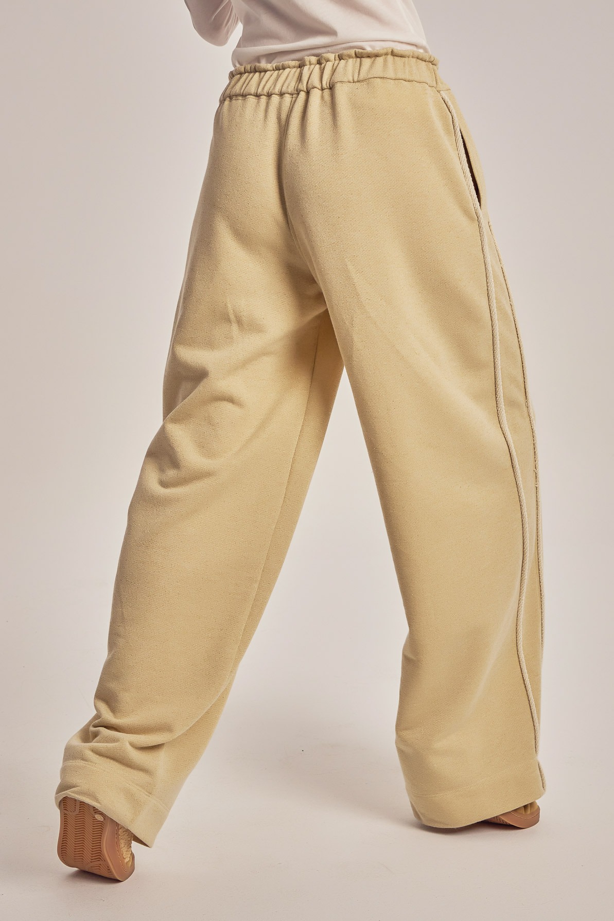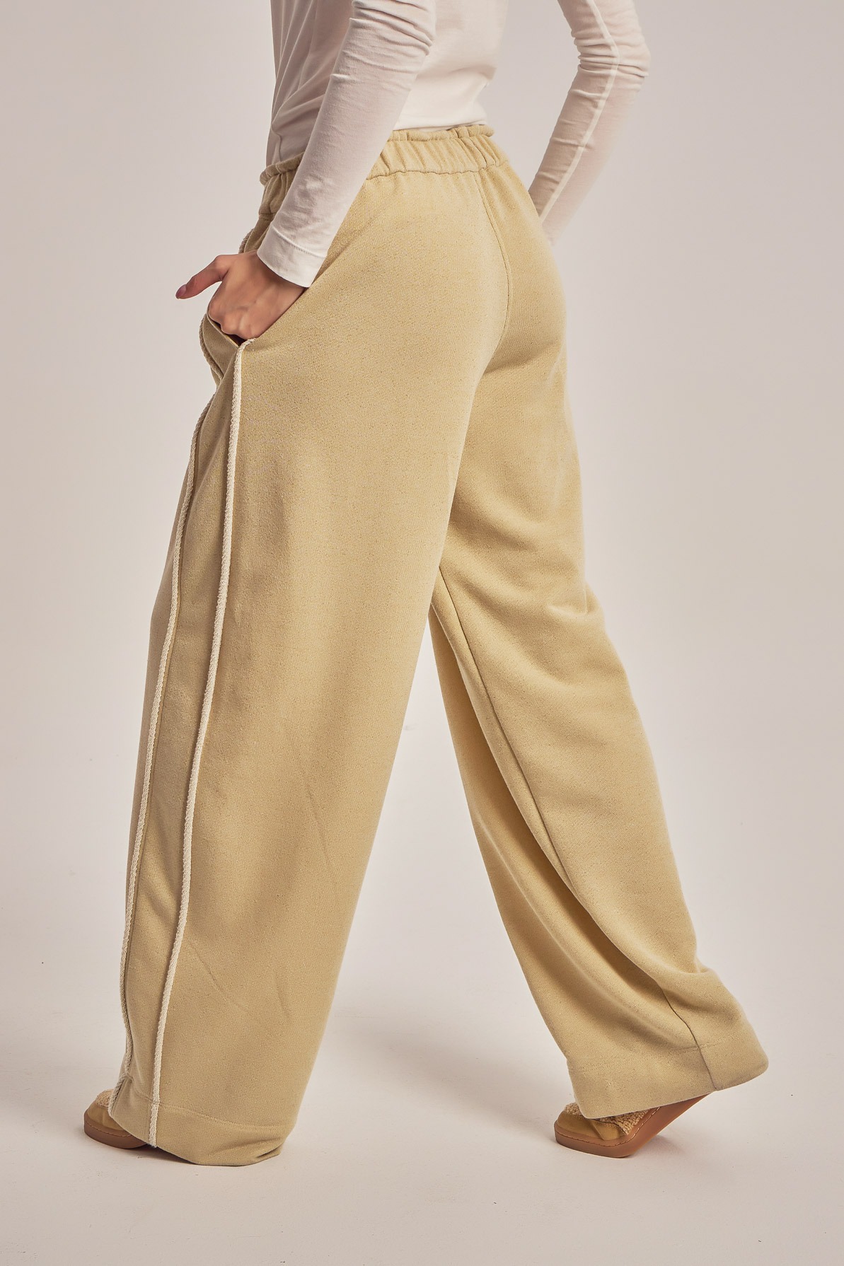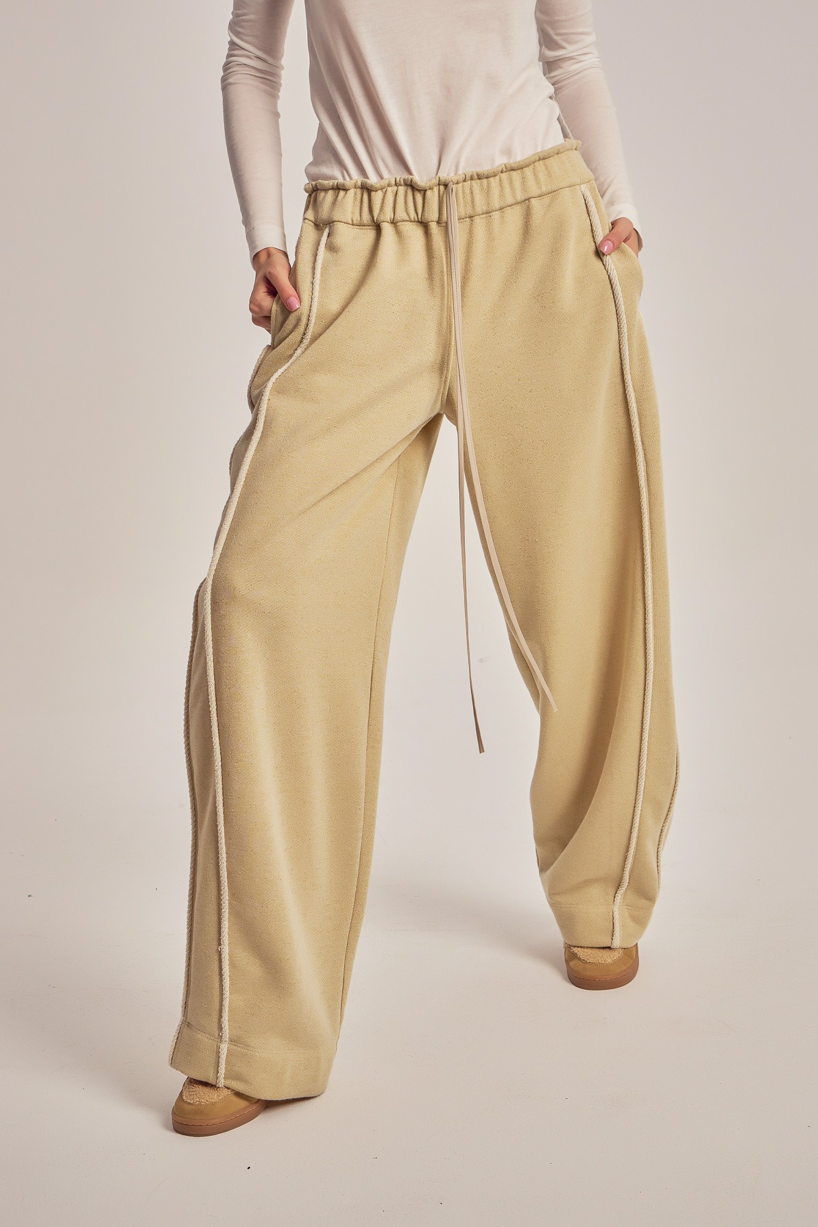 Wide leg trening pants with unfinished side seam trims.