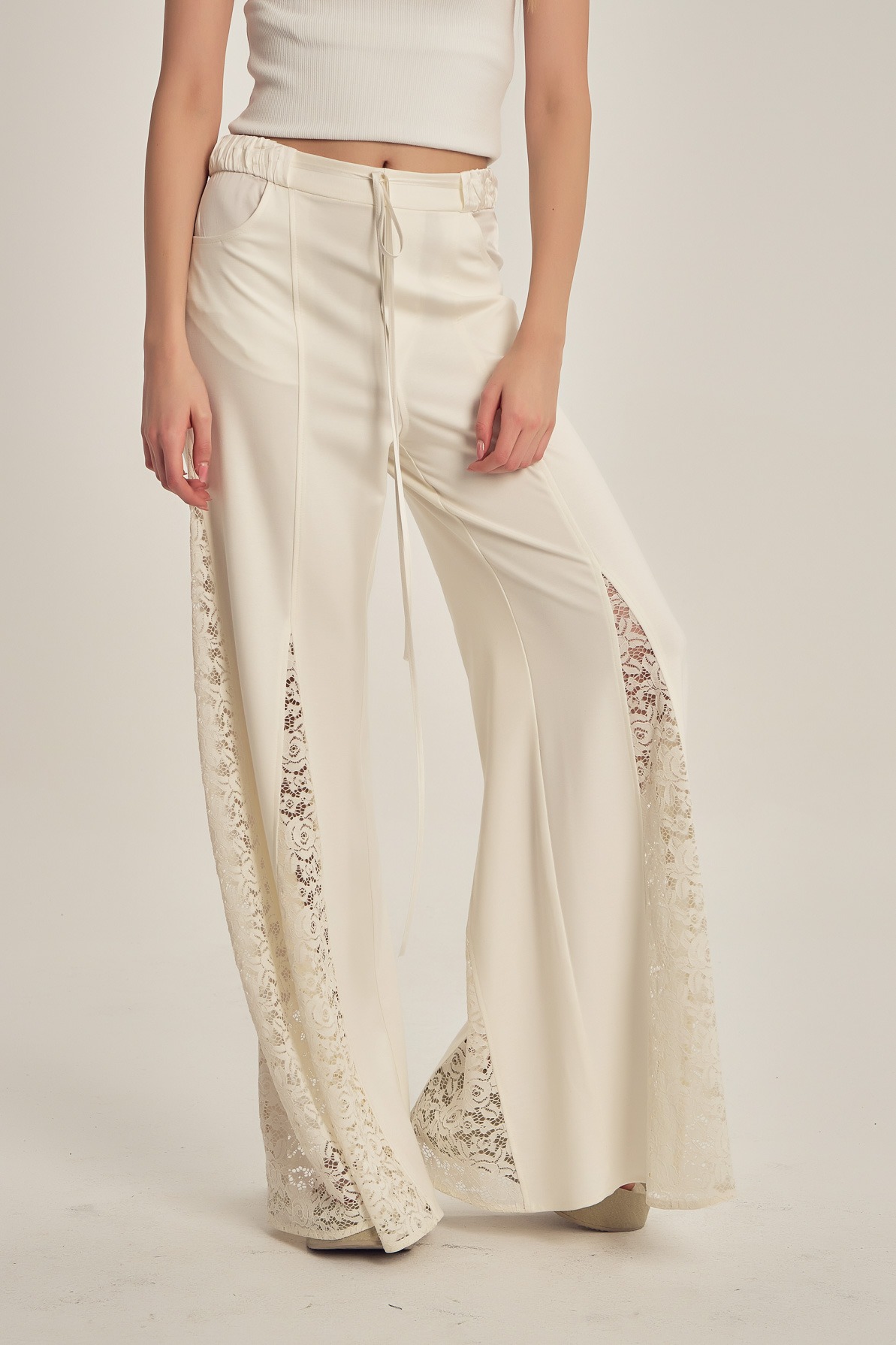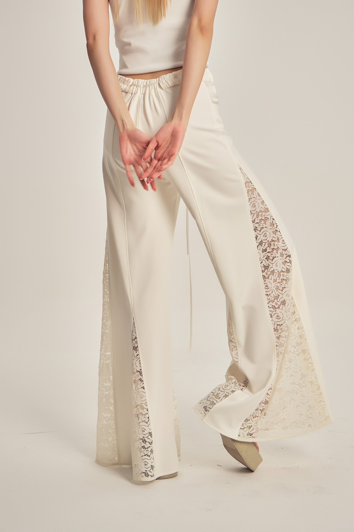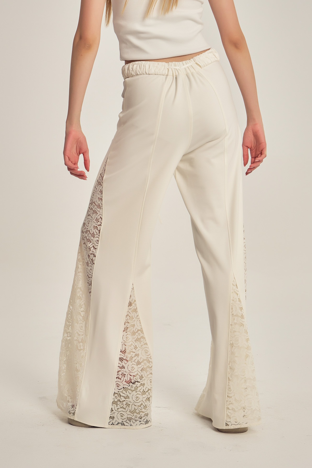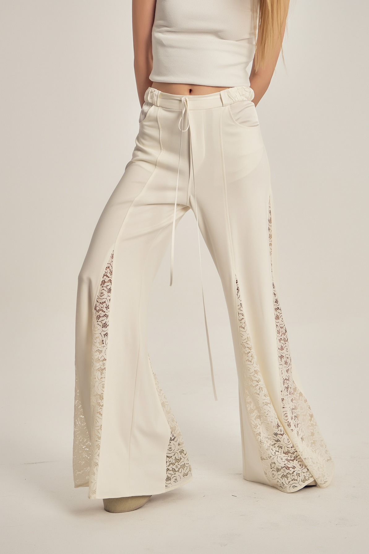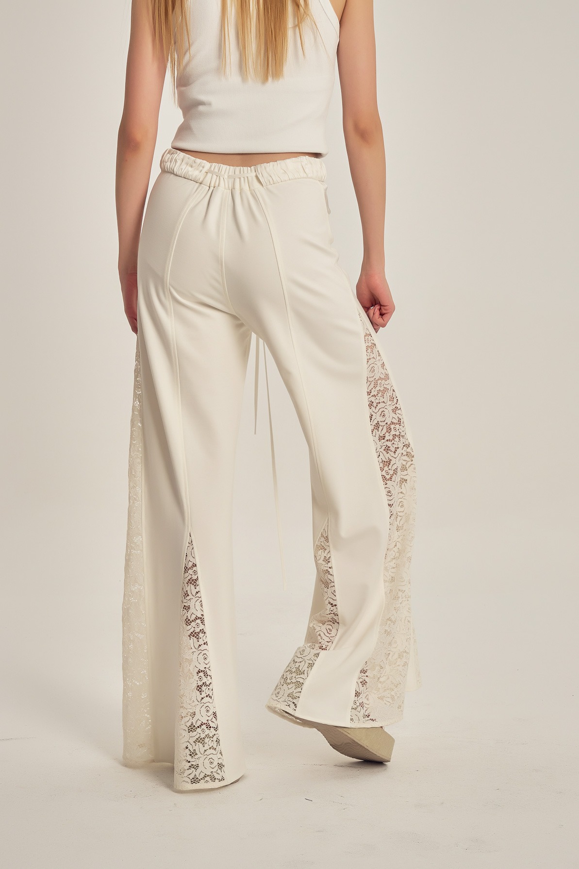 Soft jersey trousers featuring delicate lace inserts for a refined, feminine contrast. Designed with an elasticated waist and adjustable drawstring, the relaxed silhouette elongates the figure and blends comfort with subtle elegance.