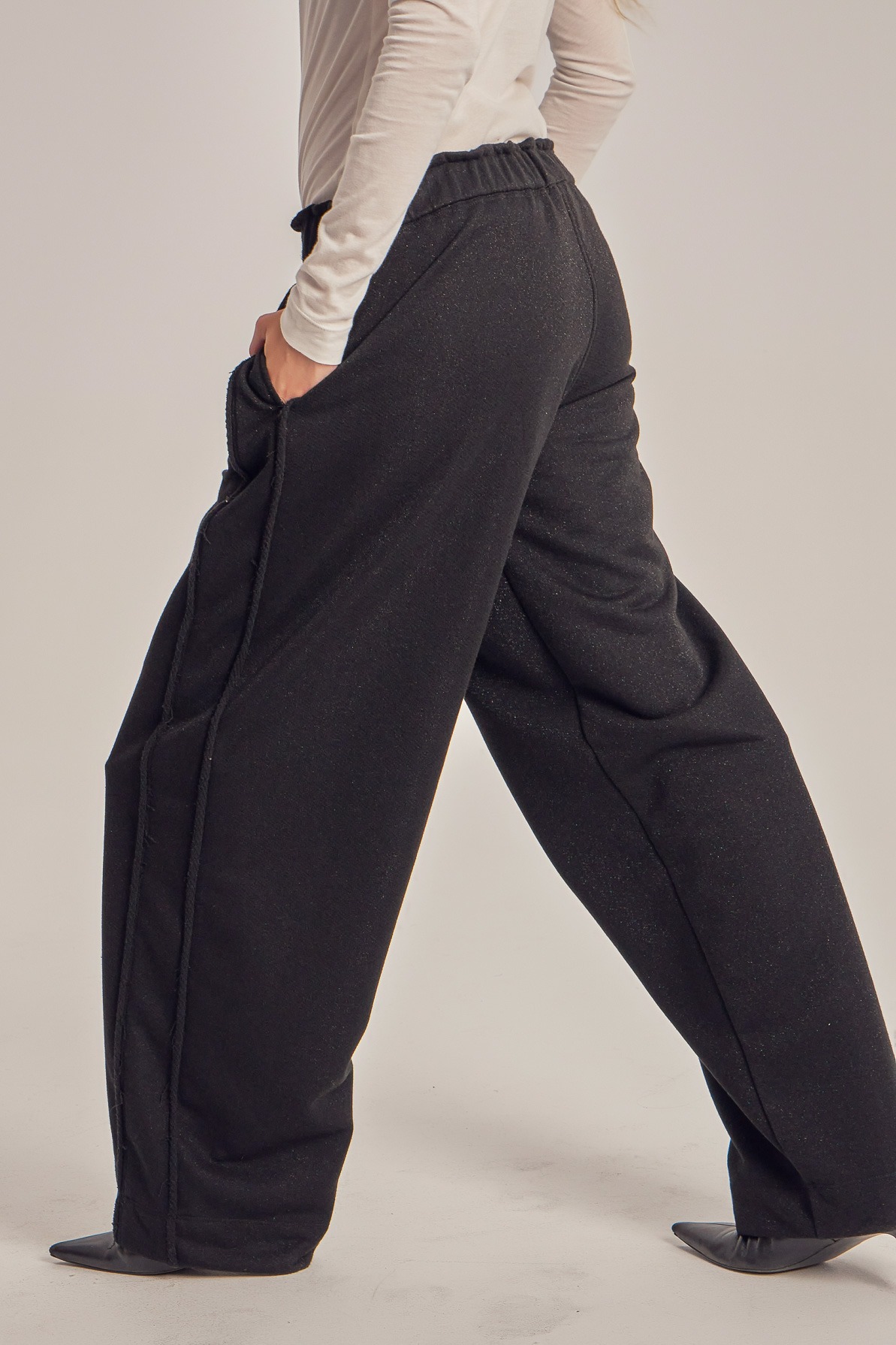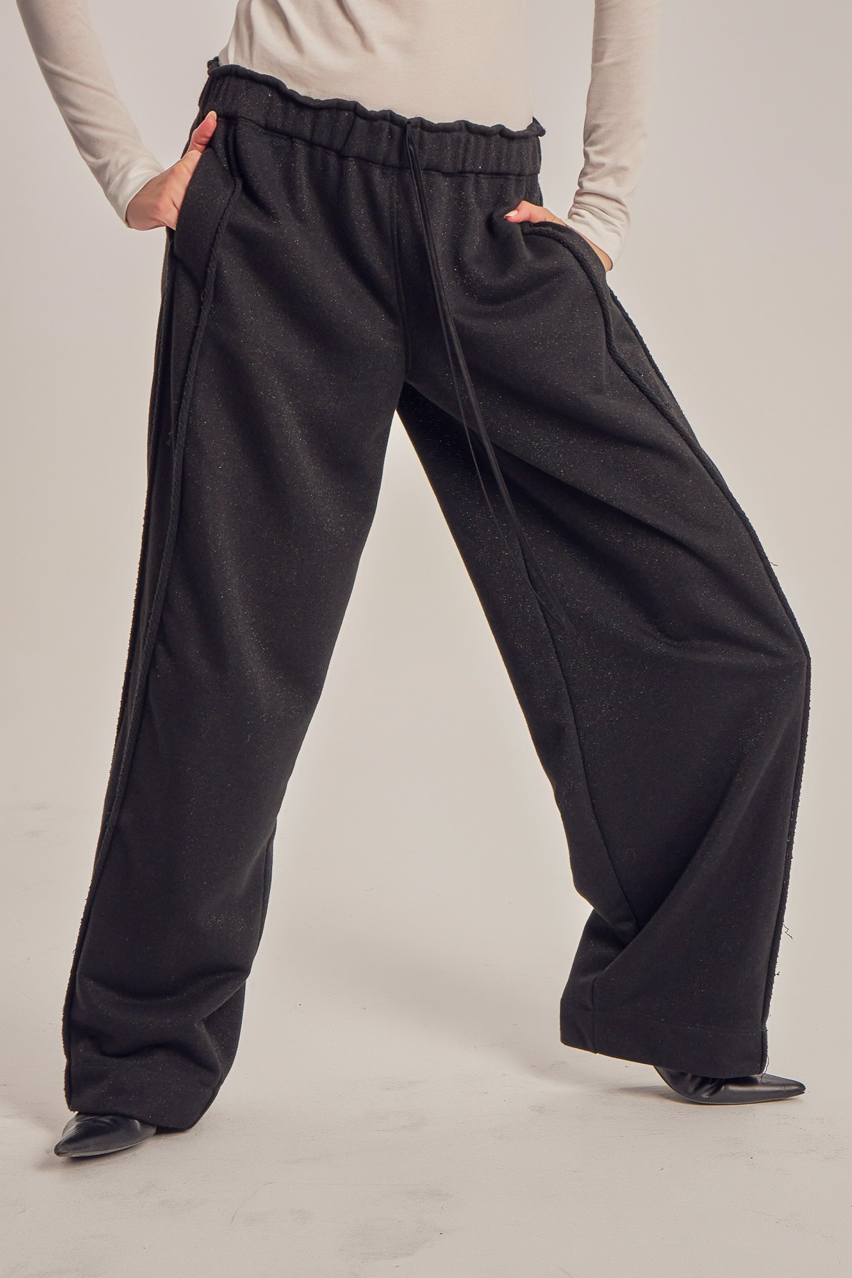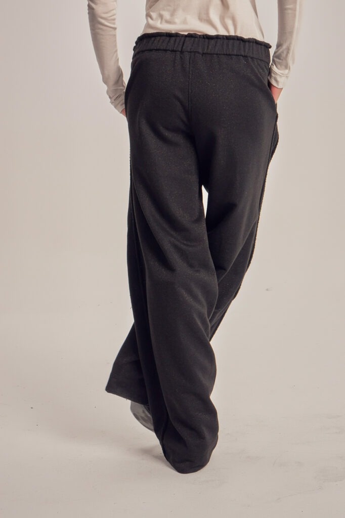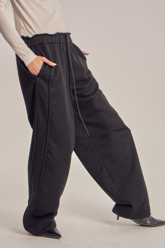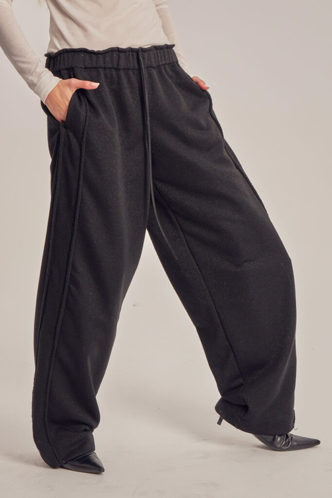 Wide leg trening pants with unfinished side seam trims.