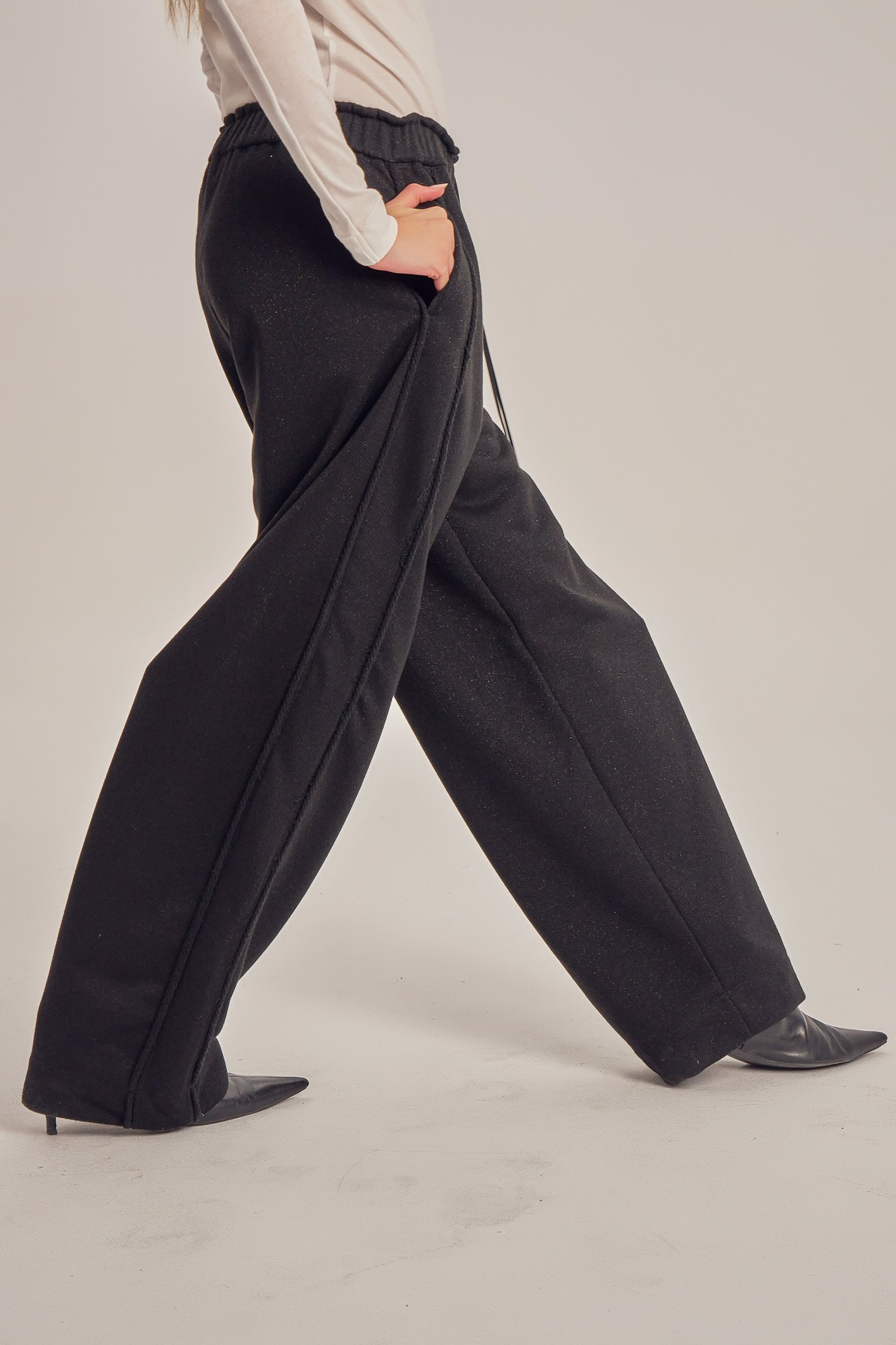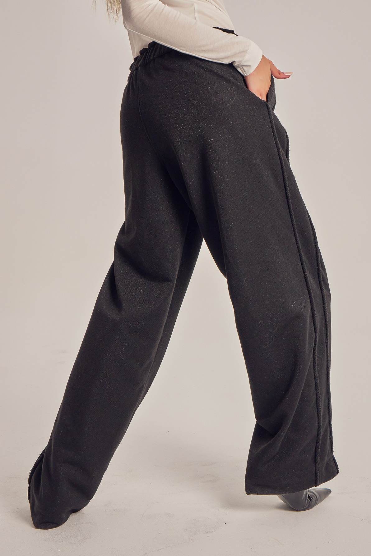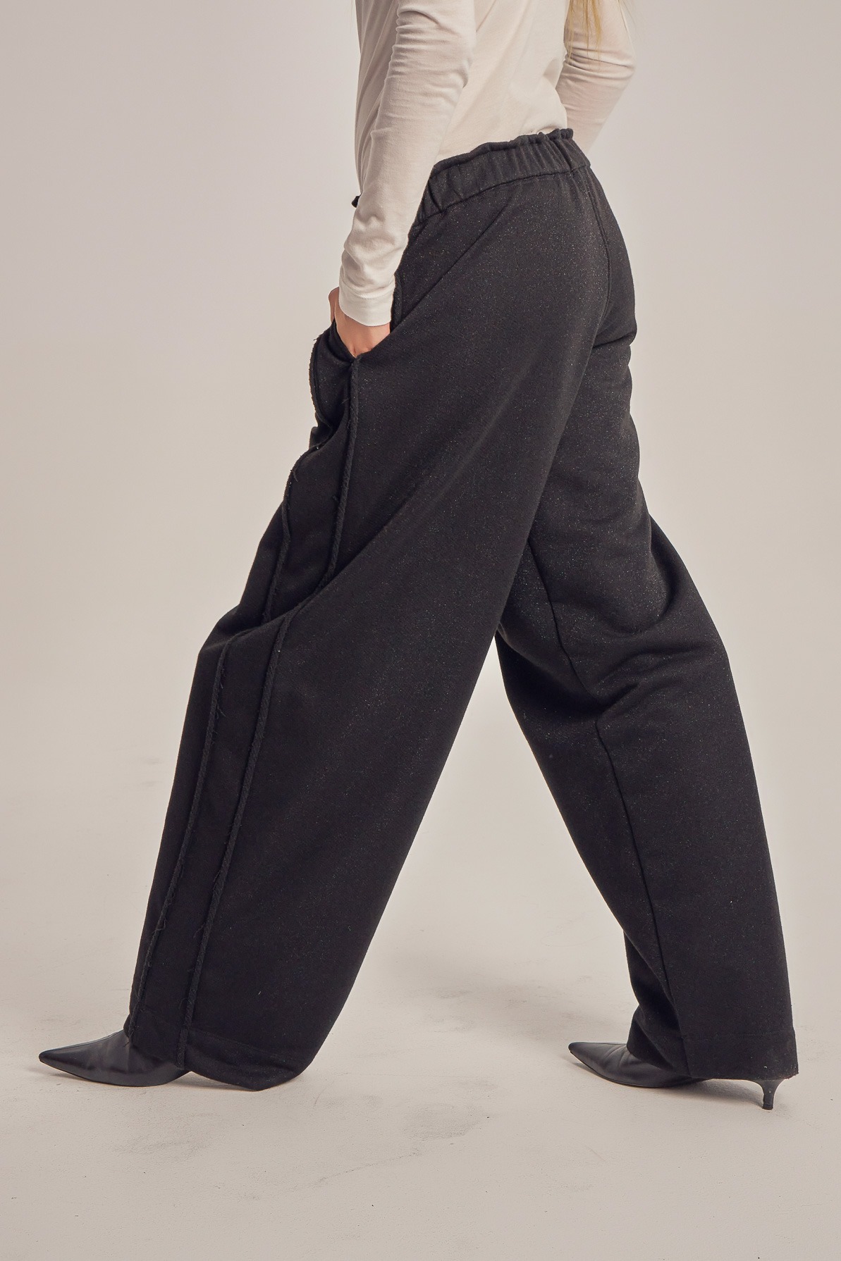 Wide leg trening pants with unfinished side seam trims.