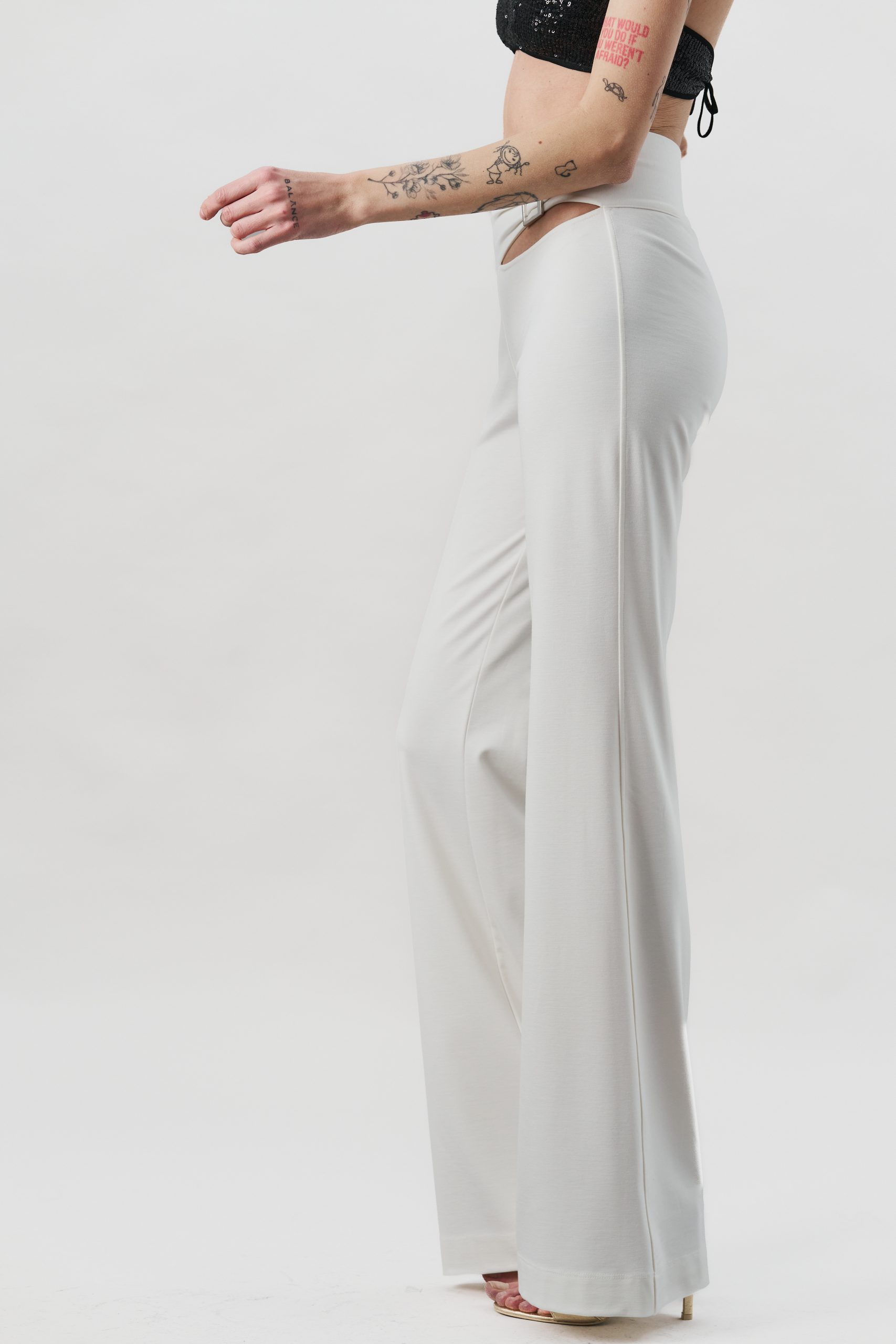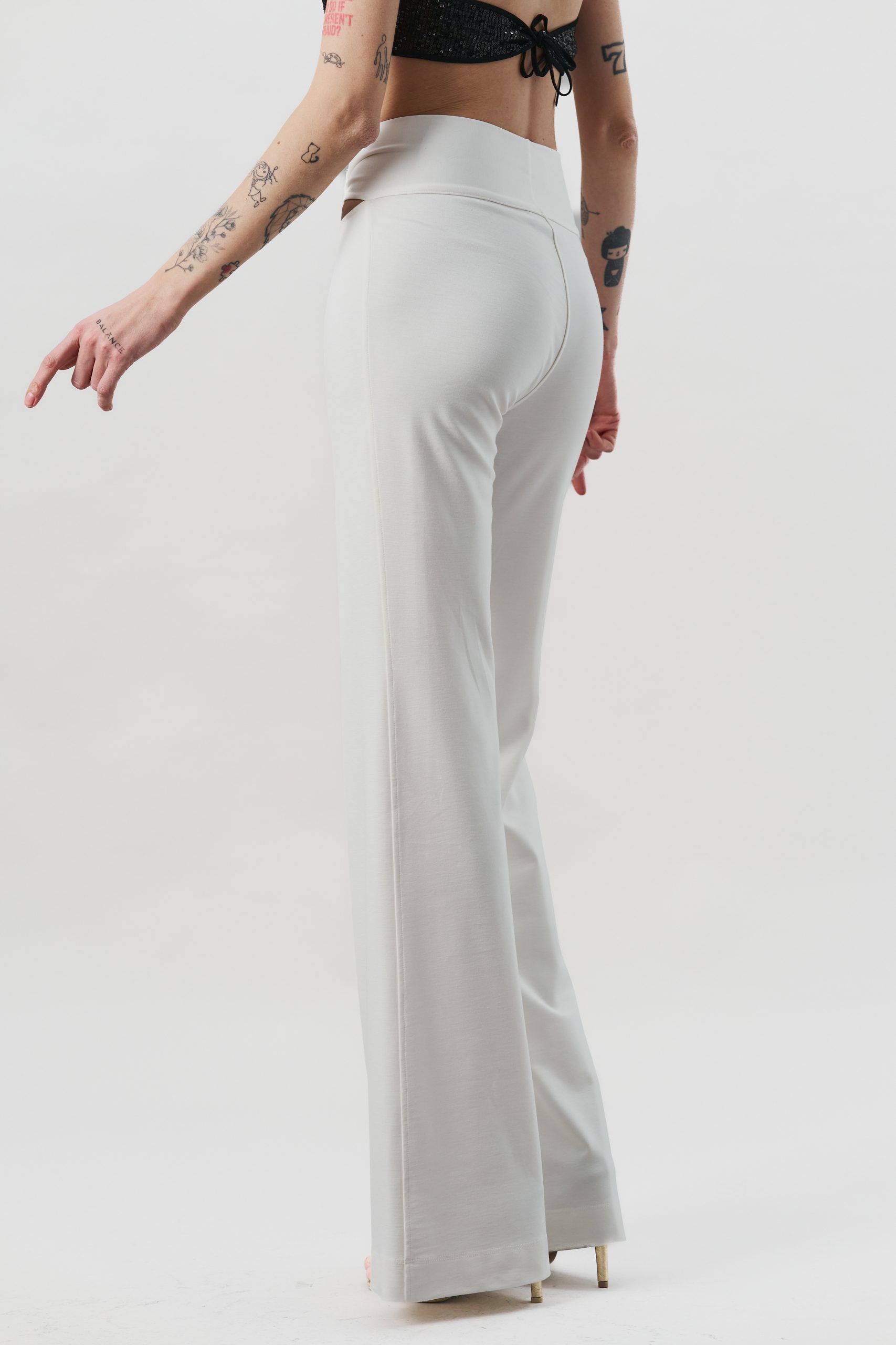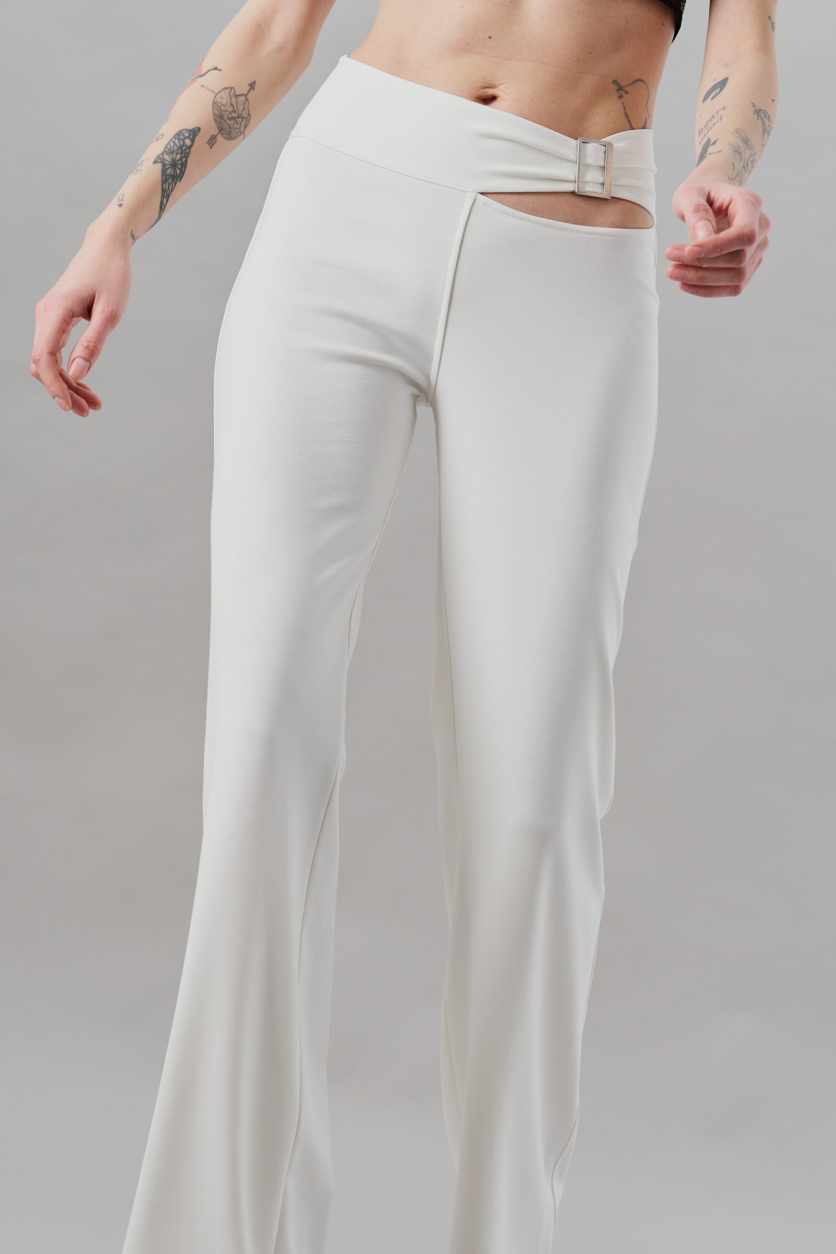 Flared stretch pants, with a cutout on the waist and a metallic buckle.