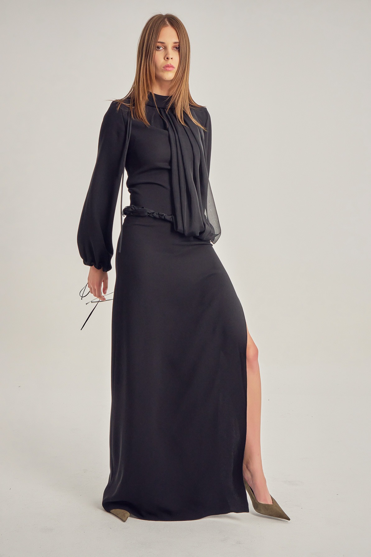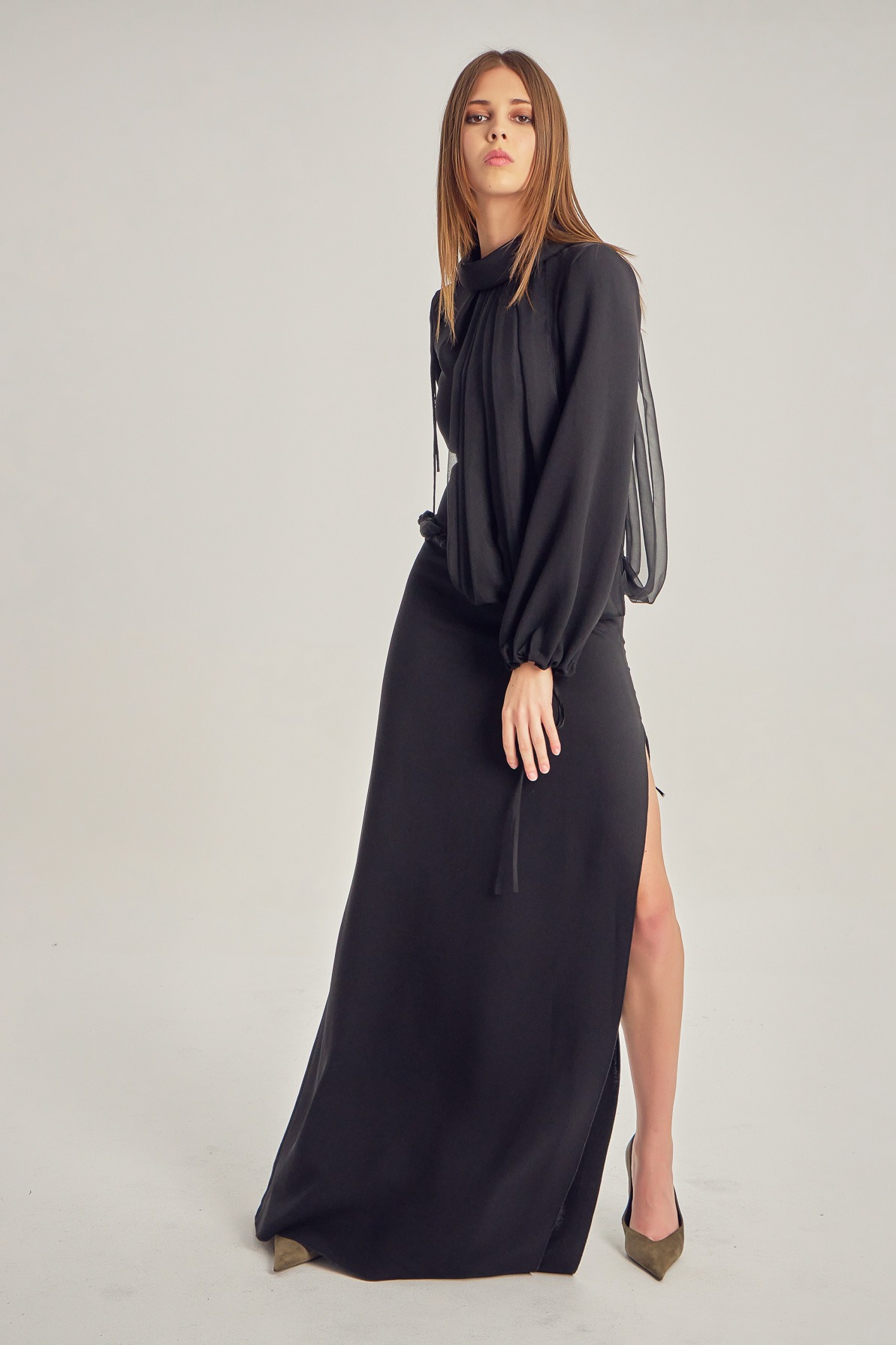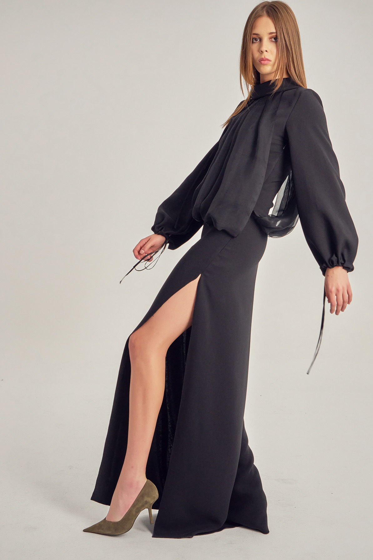 Long evening dress with a leg slit and long sleeves.