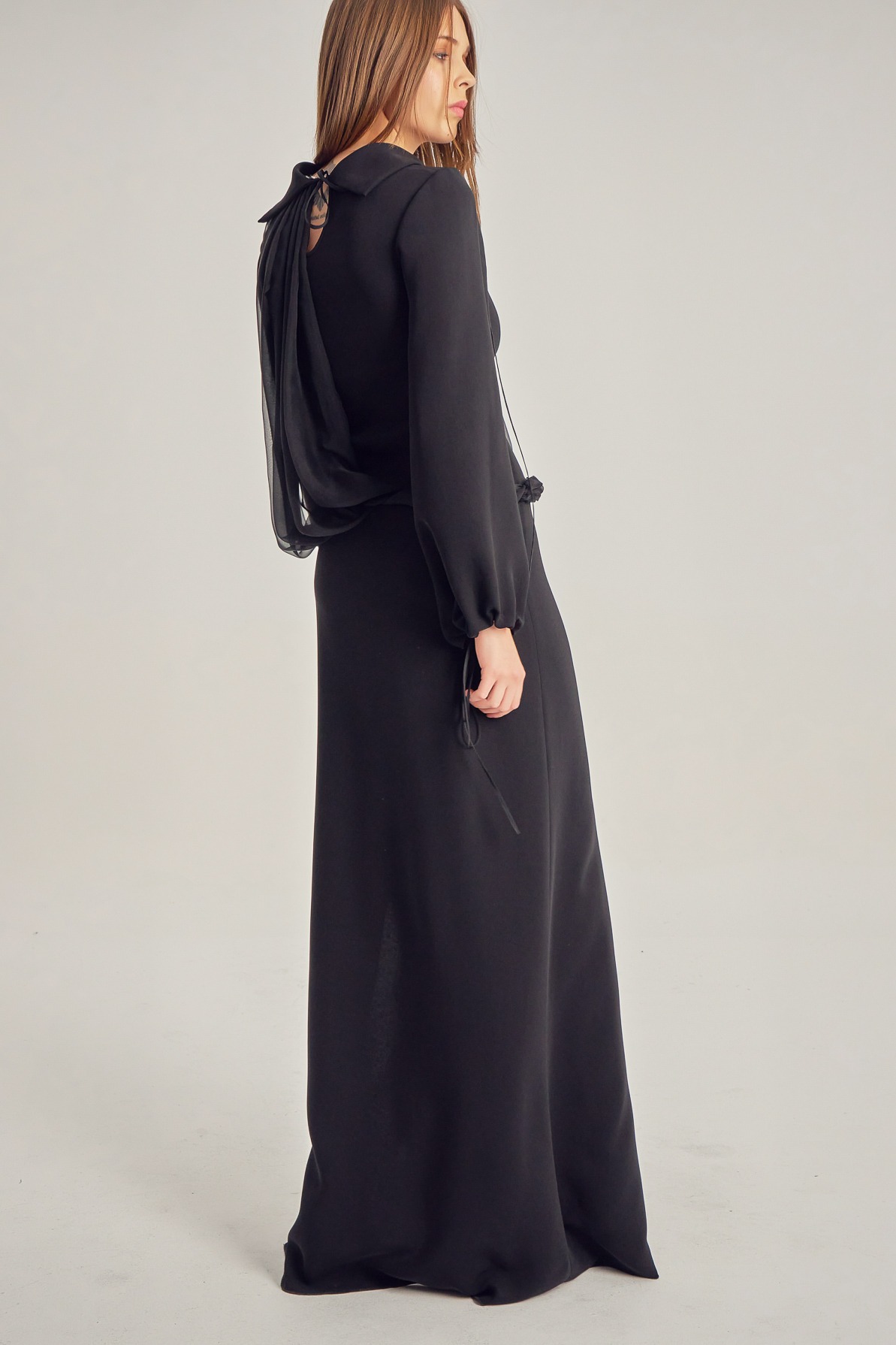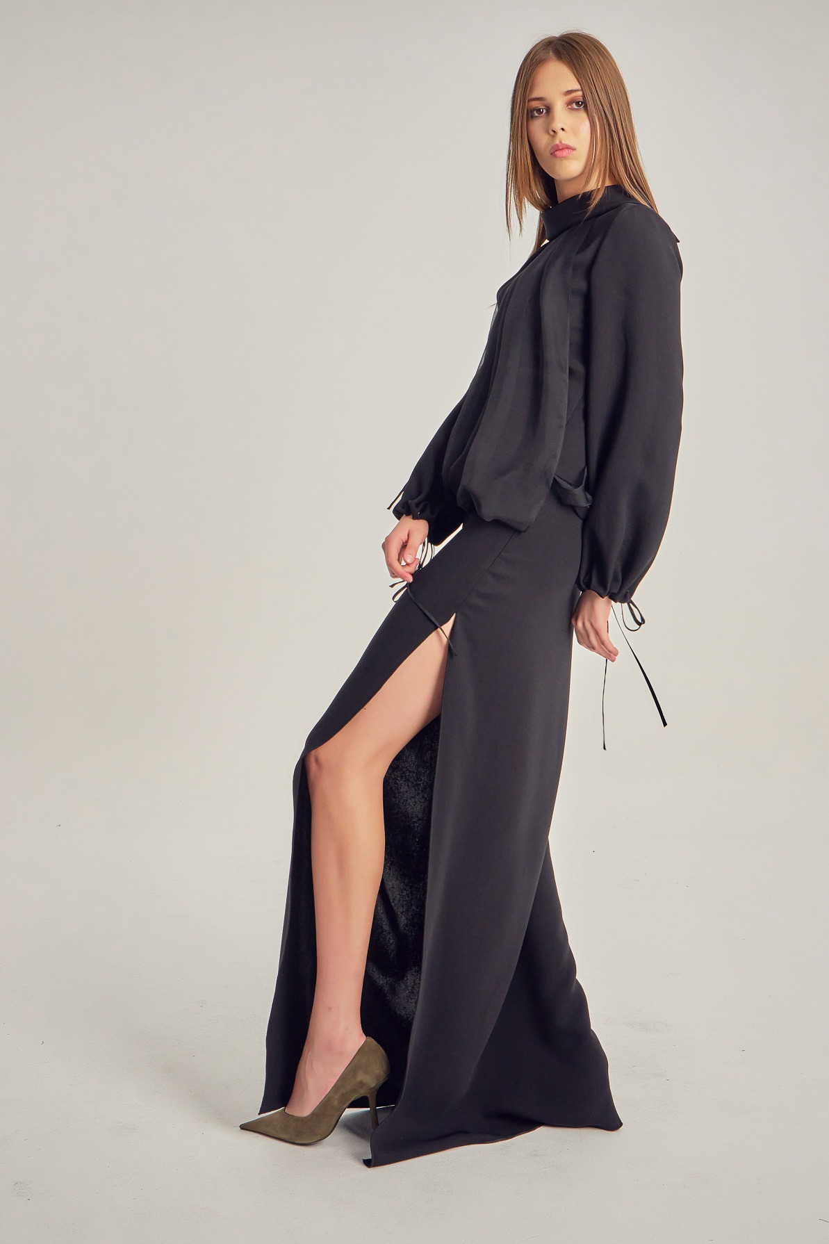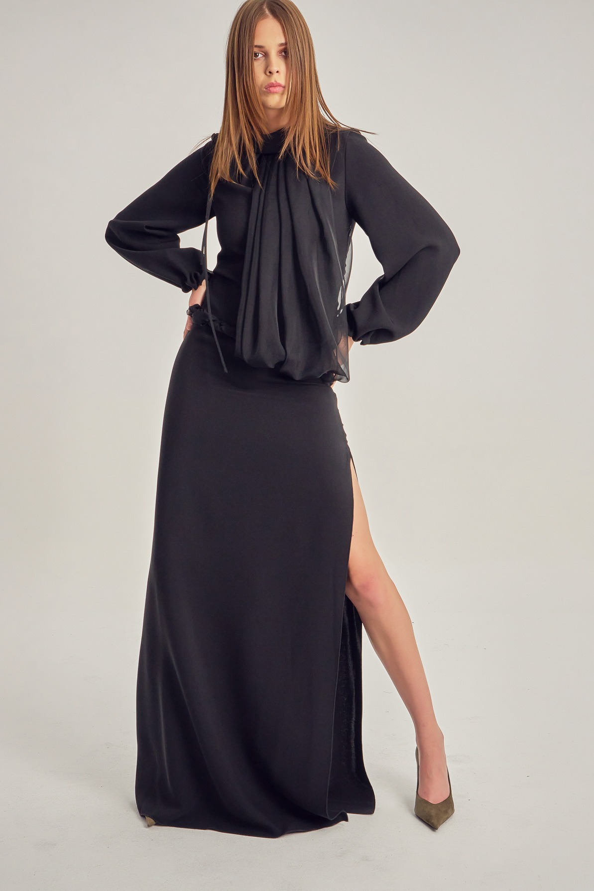 Long evening dress with a leg slit and long sleeves.