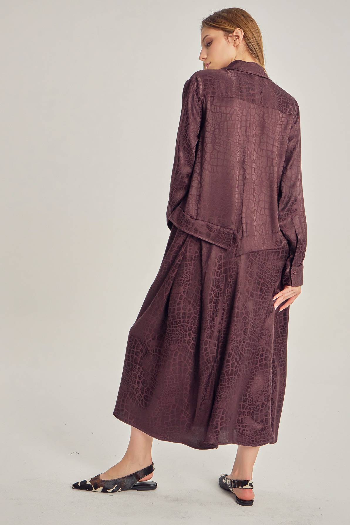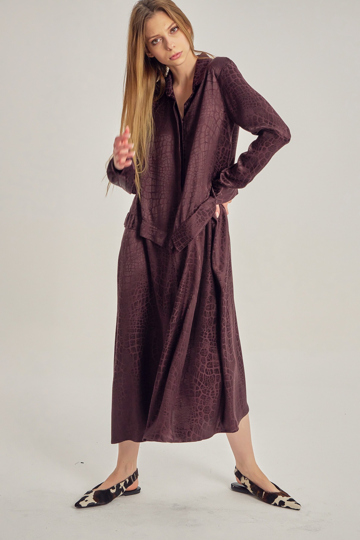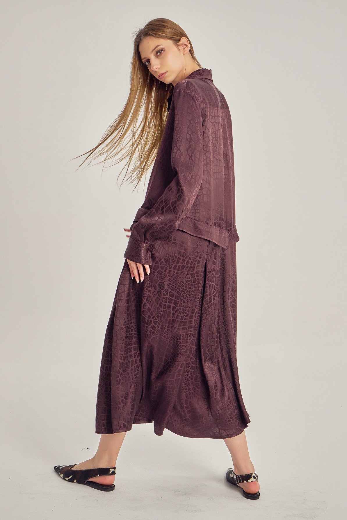 Shirt-style dress crafted from a fluid viscose with a tonal embossed texture. Its relaxed silhouette, clean lines, and subtle side slits offer ease of movement while maintaining a refined look. A versatile piece that balances comfort and understated sophistication.