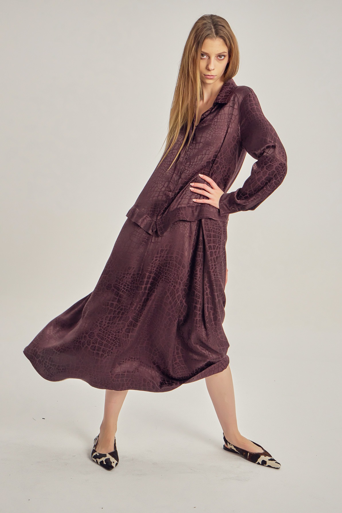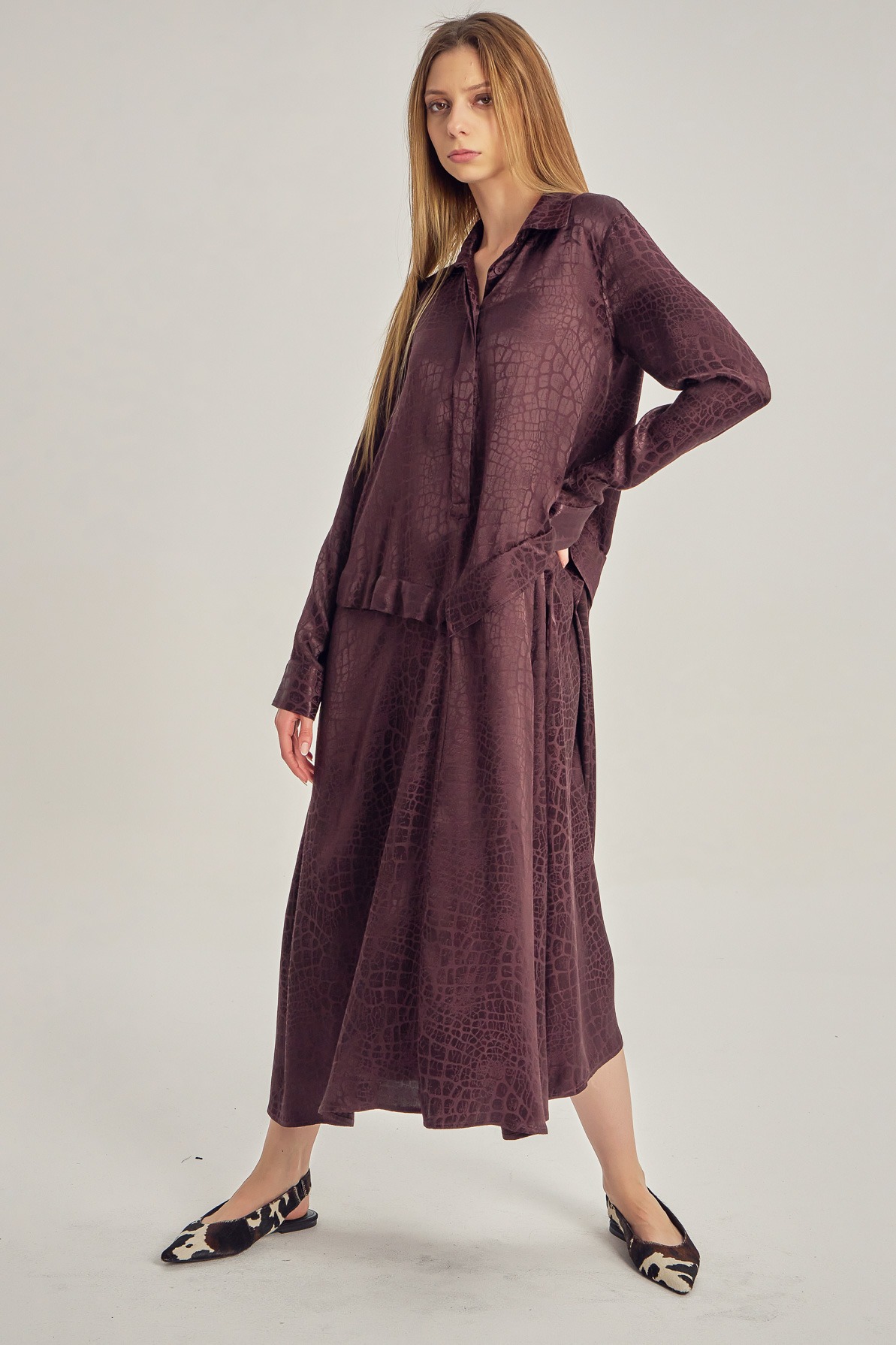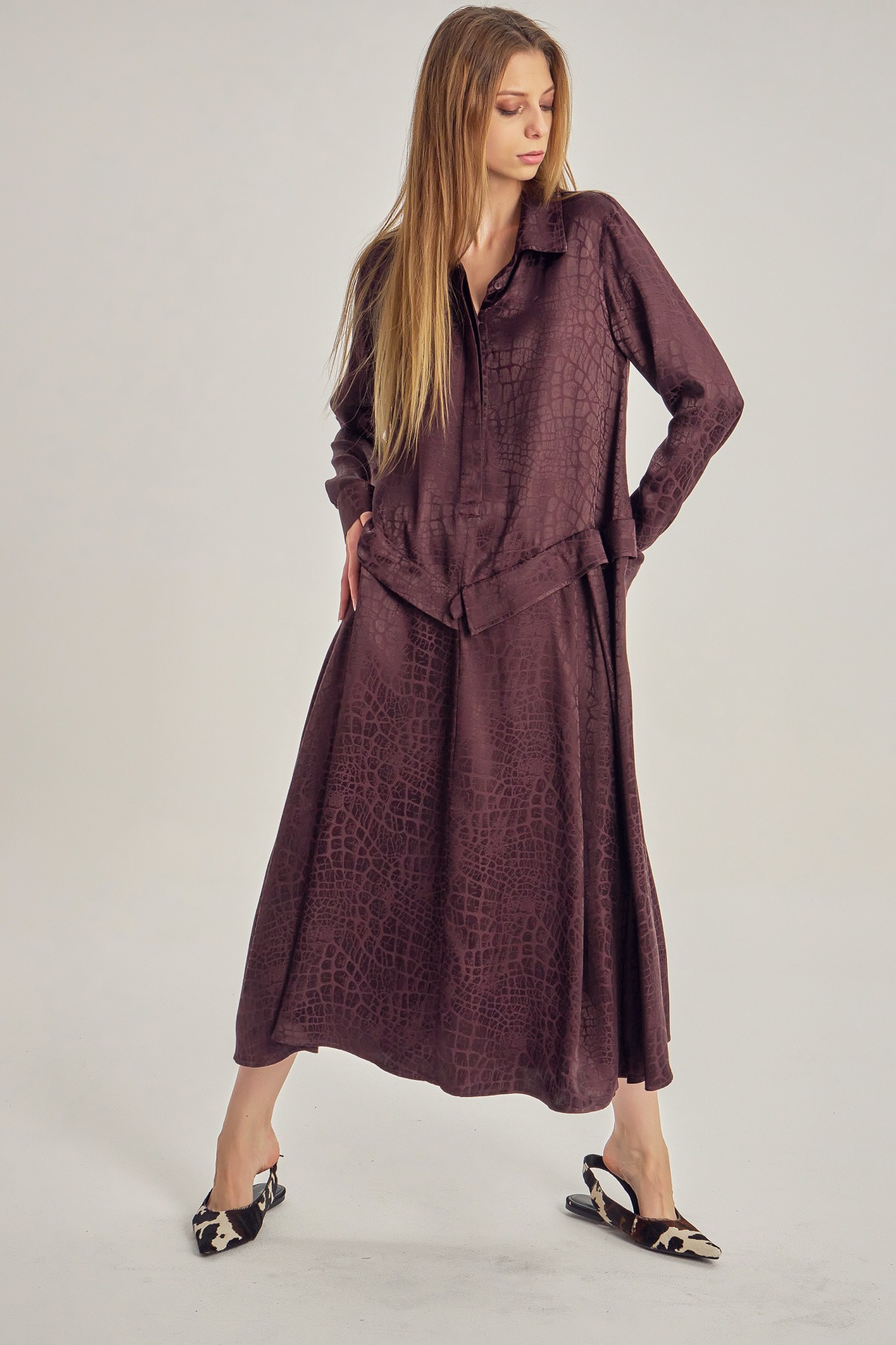 Shirt-style dress crafted from a fluid viscose with a tonal embossed texture. Its relaxed silhouette, clean lines, and subtle side slits offer ease of movement while maintaining a refined look. A versatile piece that balances comfort and understated sophistication.