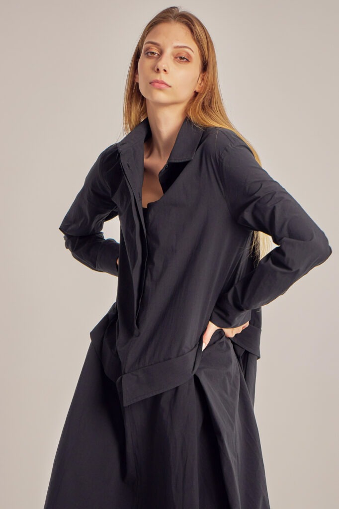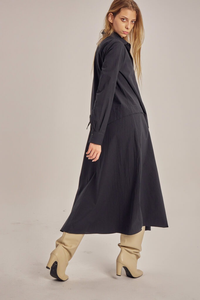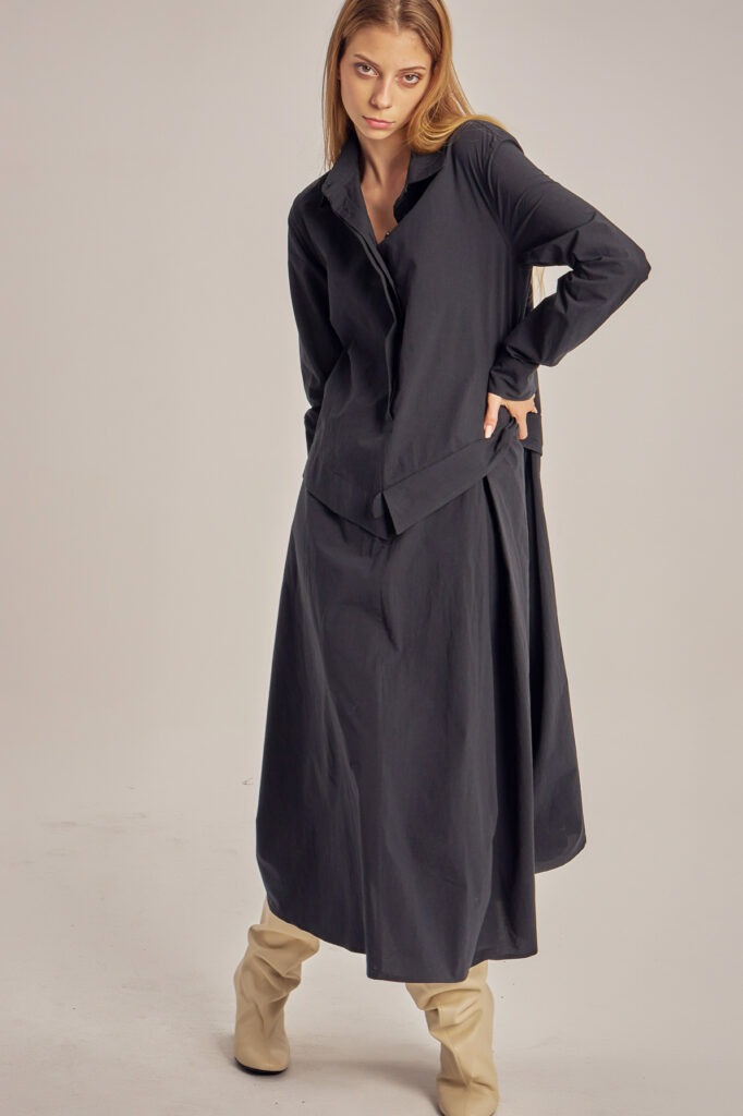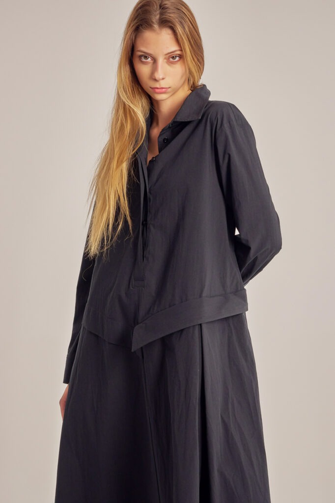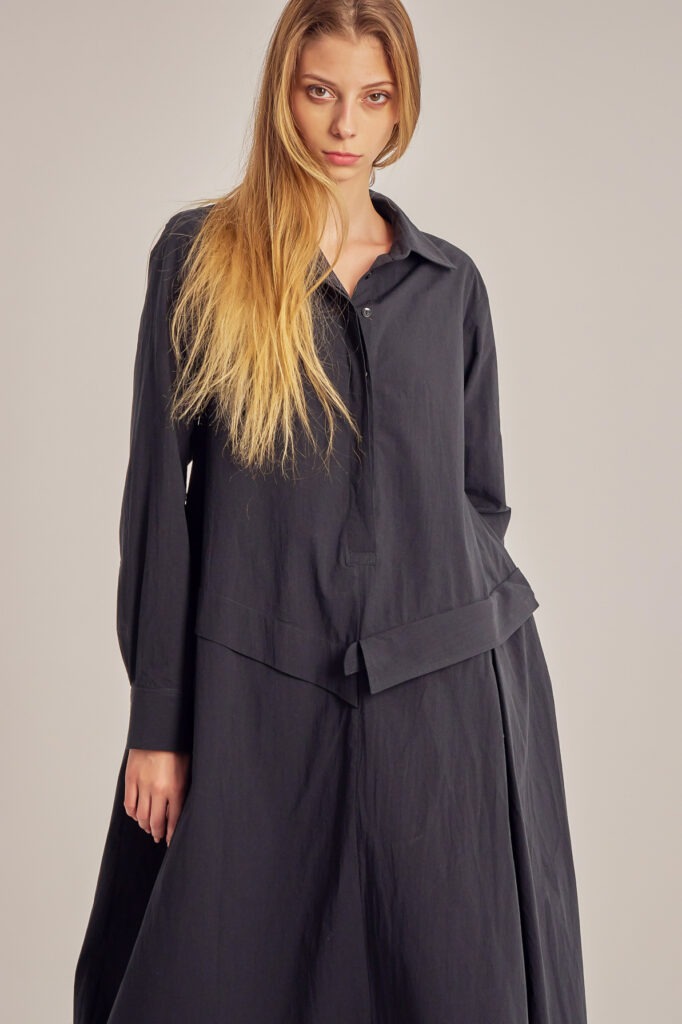 Asymmetric, cotton poplin shirt-cut dress.