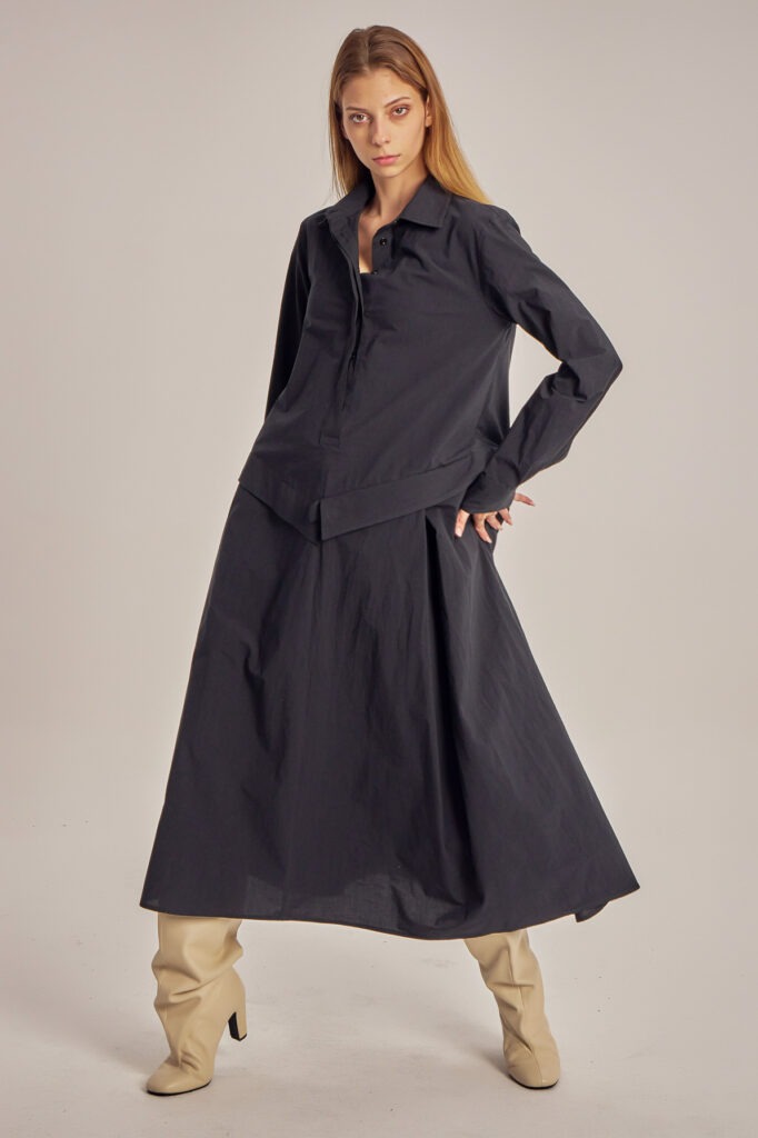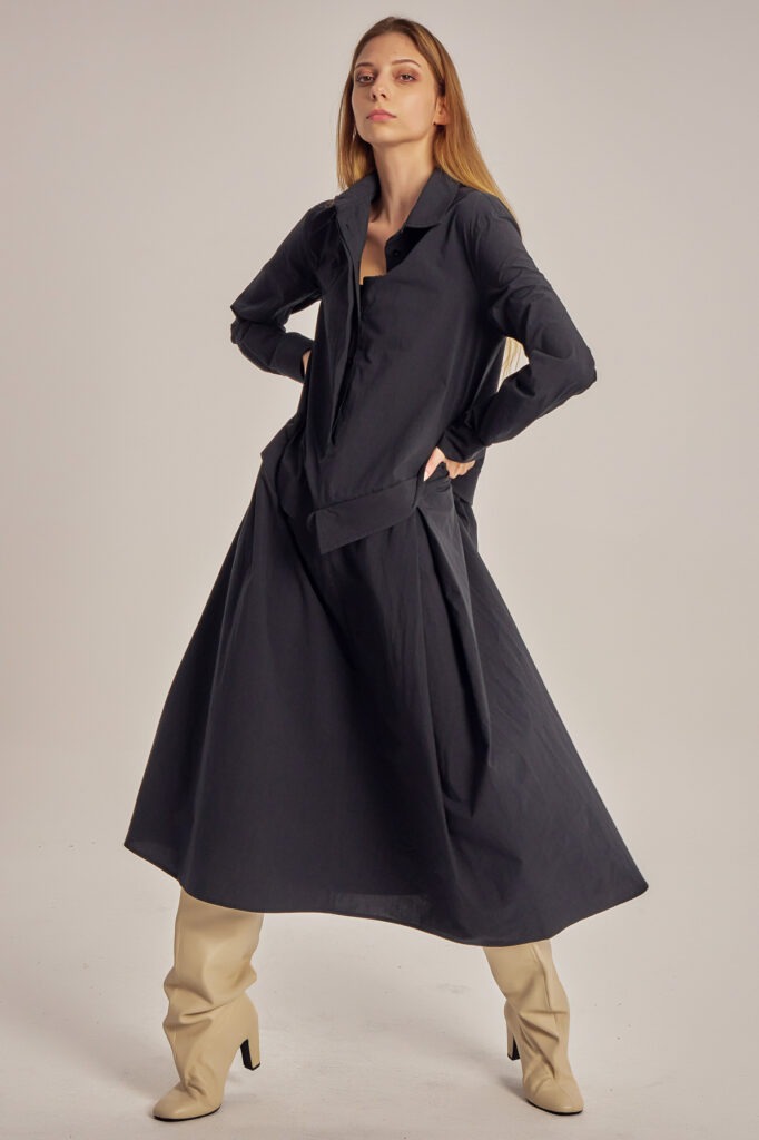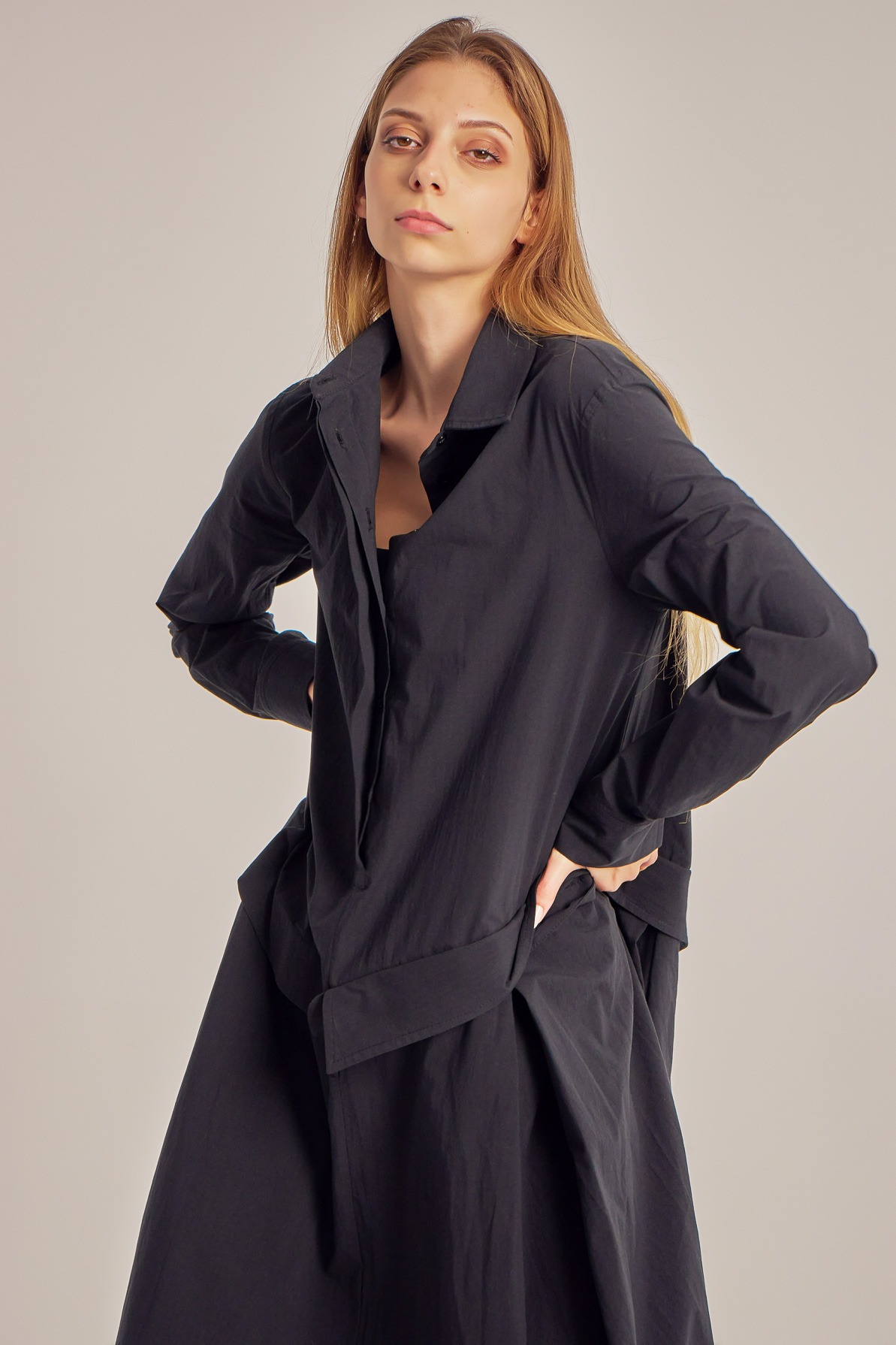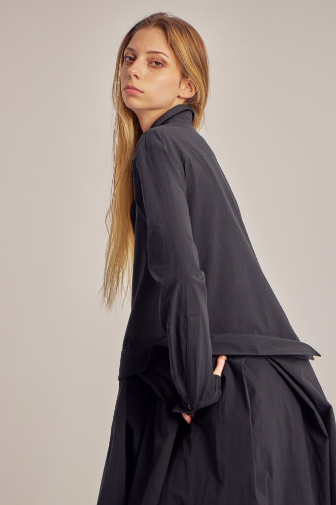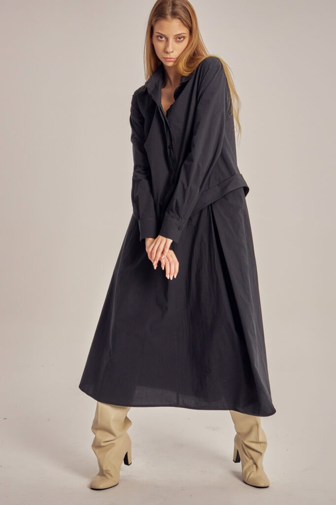 Asymmetric, cotton poplin shirt-cut dress.