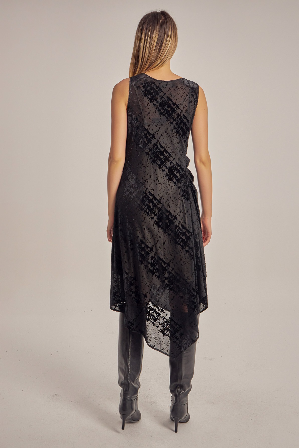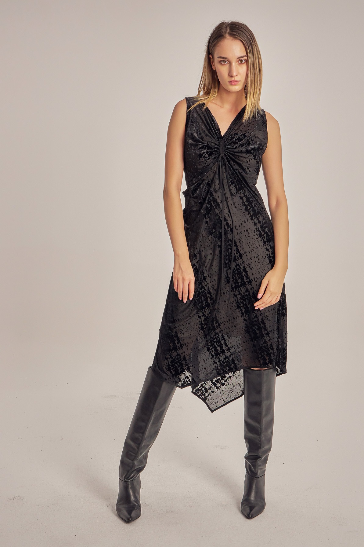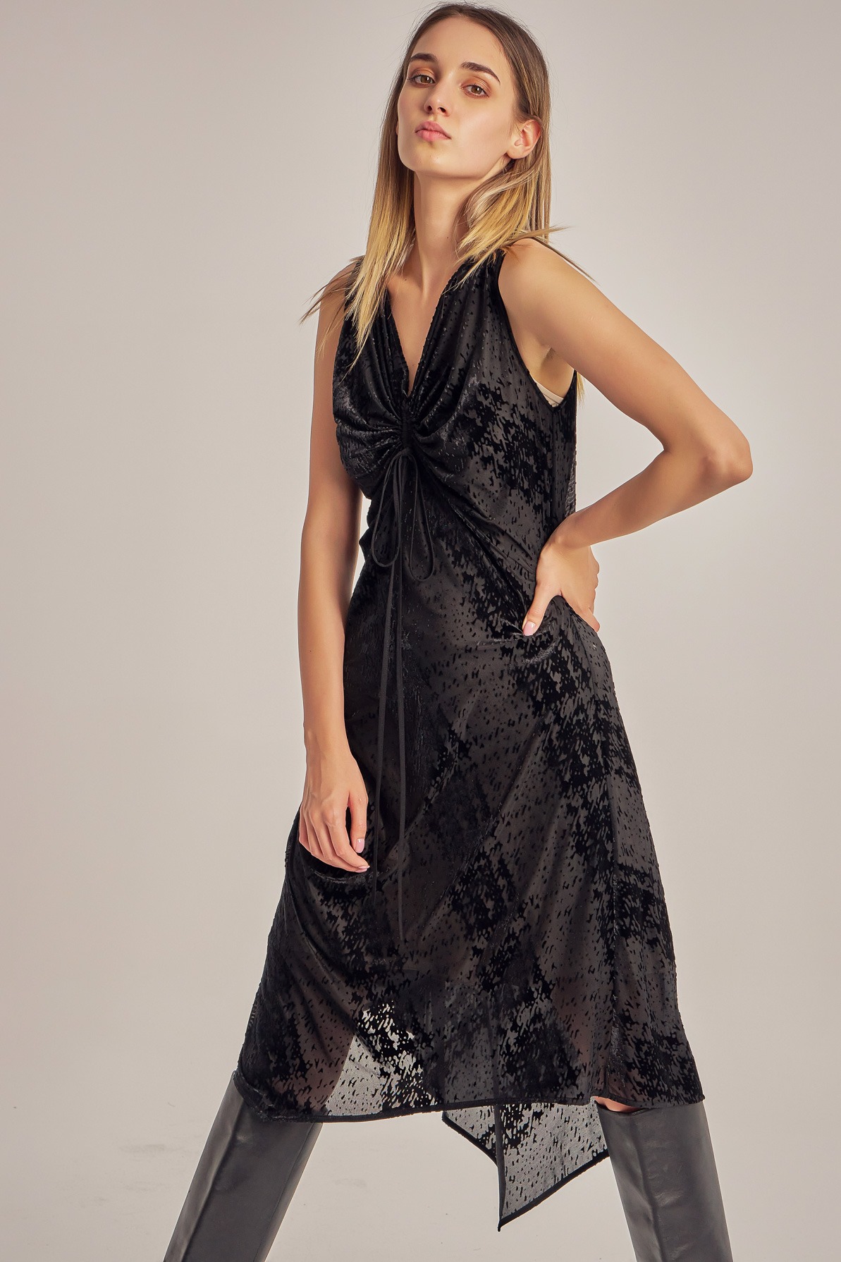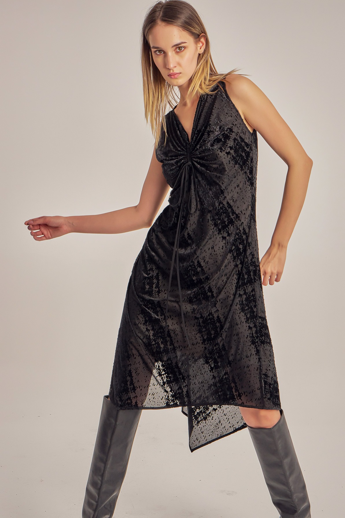 Sleeveless midi dress crafted from subtly lustrous velvet. The central draping creates a fluid line and a refined focal point, while the slightly asymmetric hem adds movement and visual dimension. An elegant piece for a clean yet confident look.