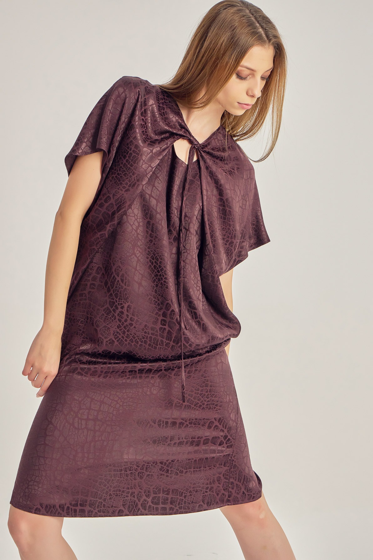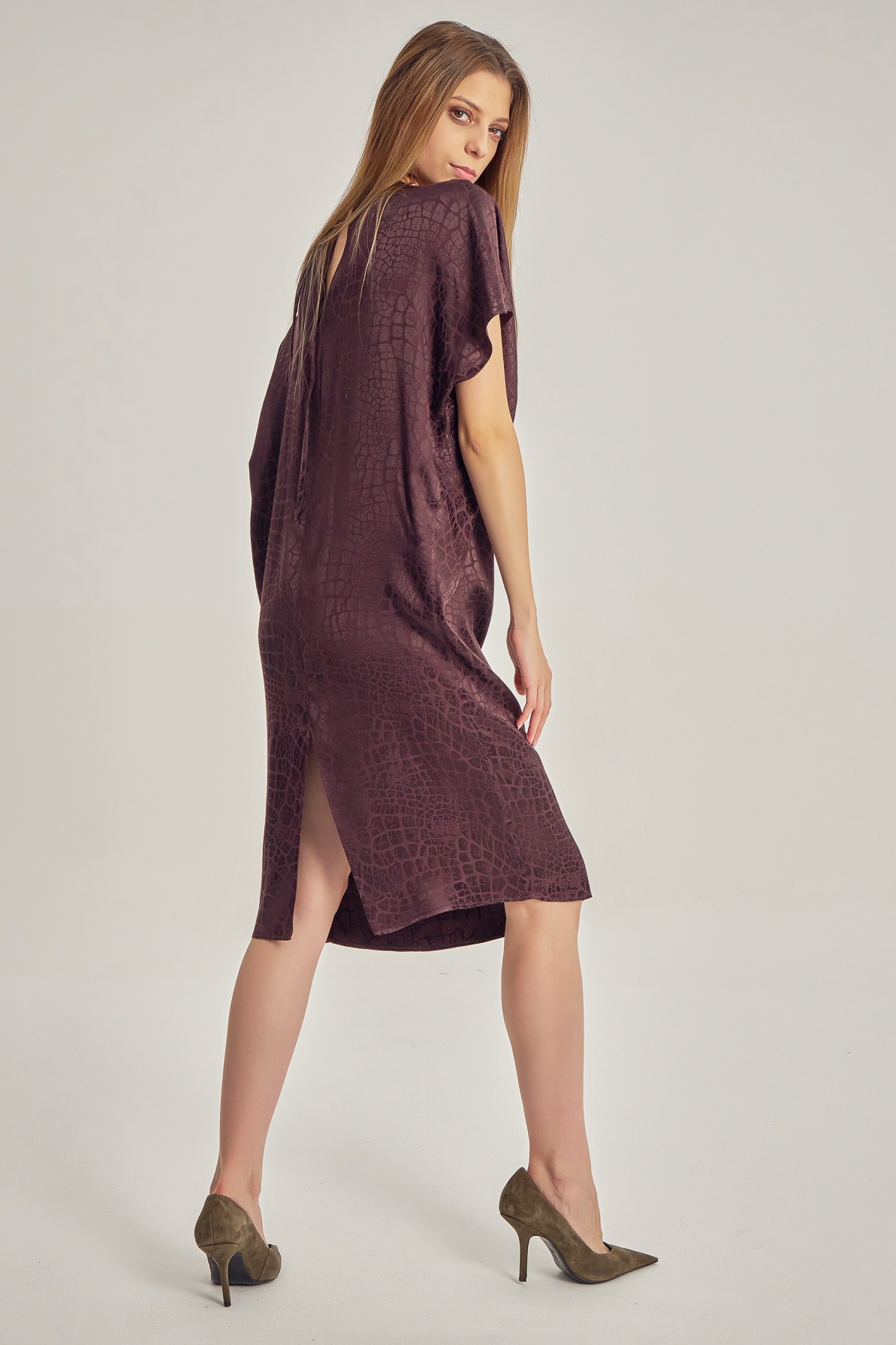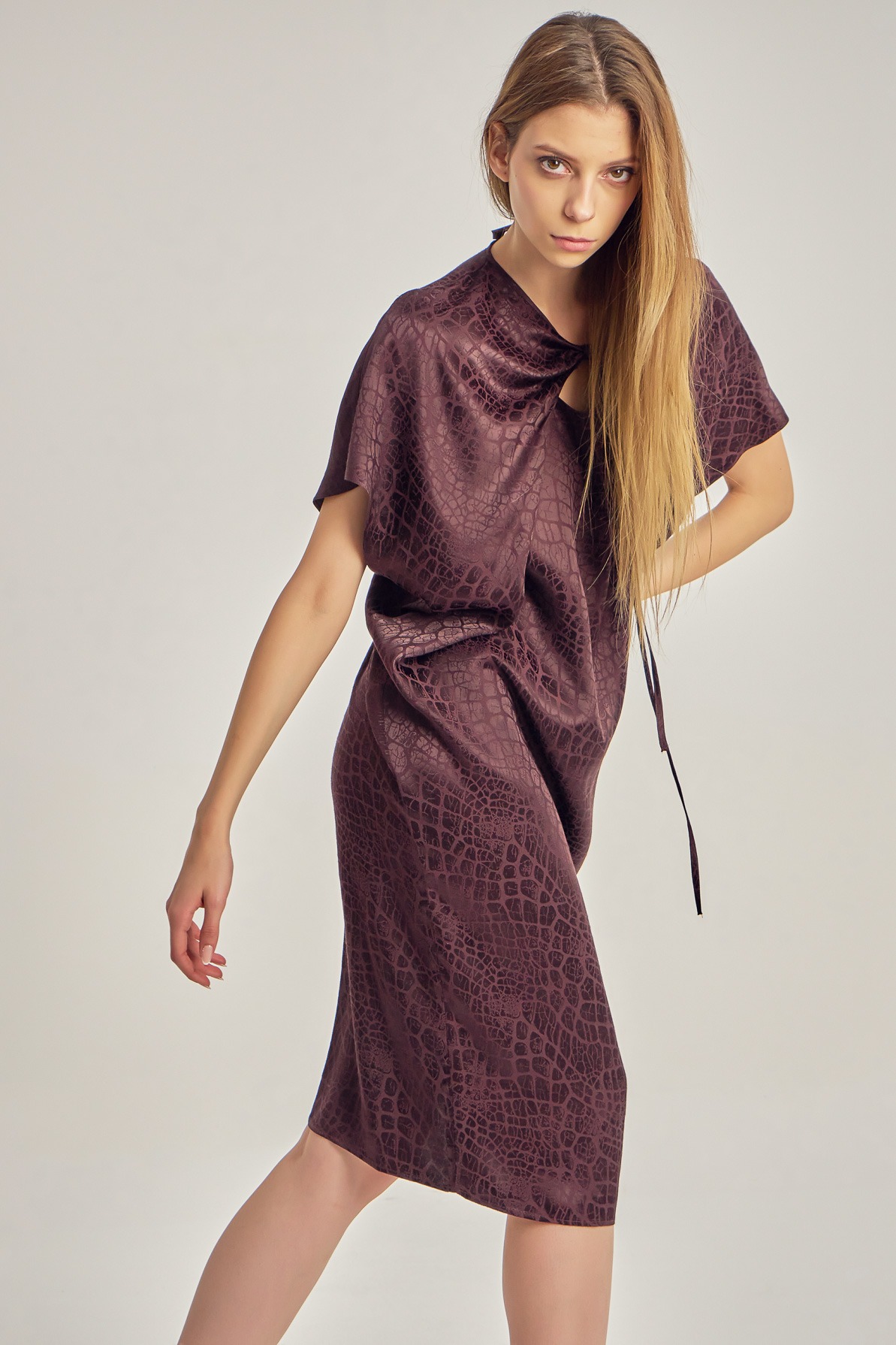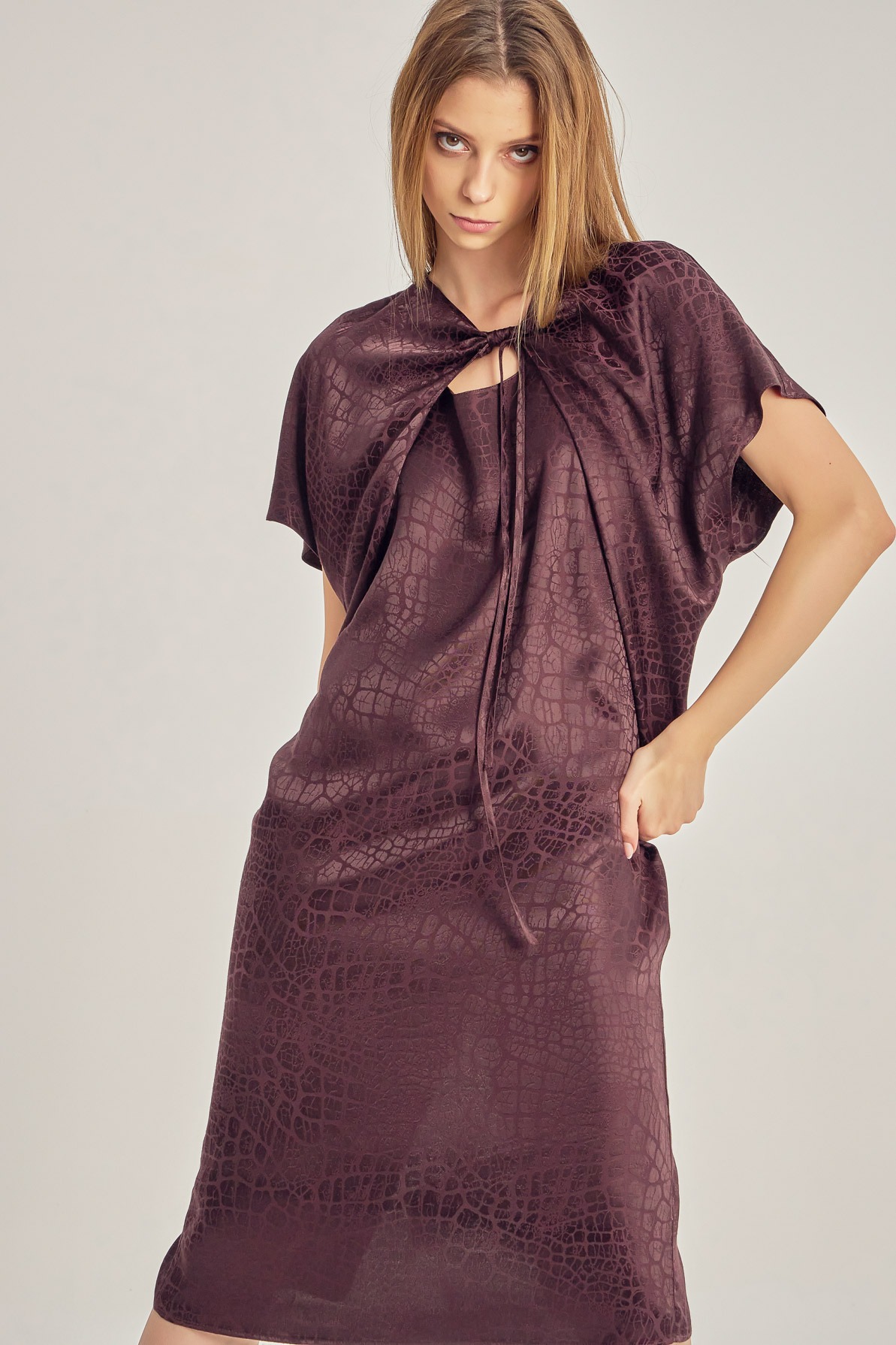 Midi dress with a relaxed silhouette, crafted from fluid viscose with an embossed texture. The subtle neckline cut-out and soft draping add a refined focal point while keeping the shape airy and modern. A versatile piece that balances comfort with effortless sophistication.