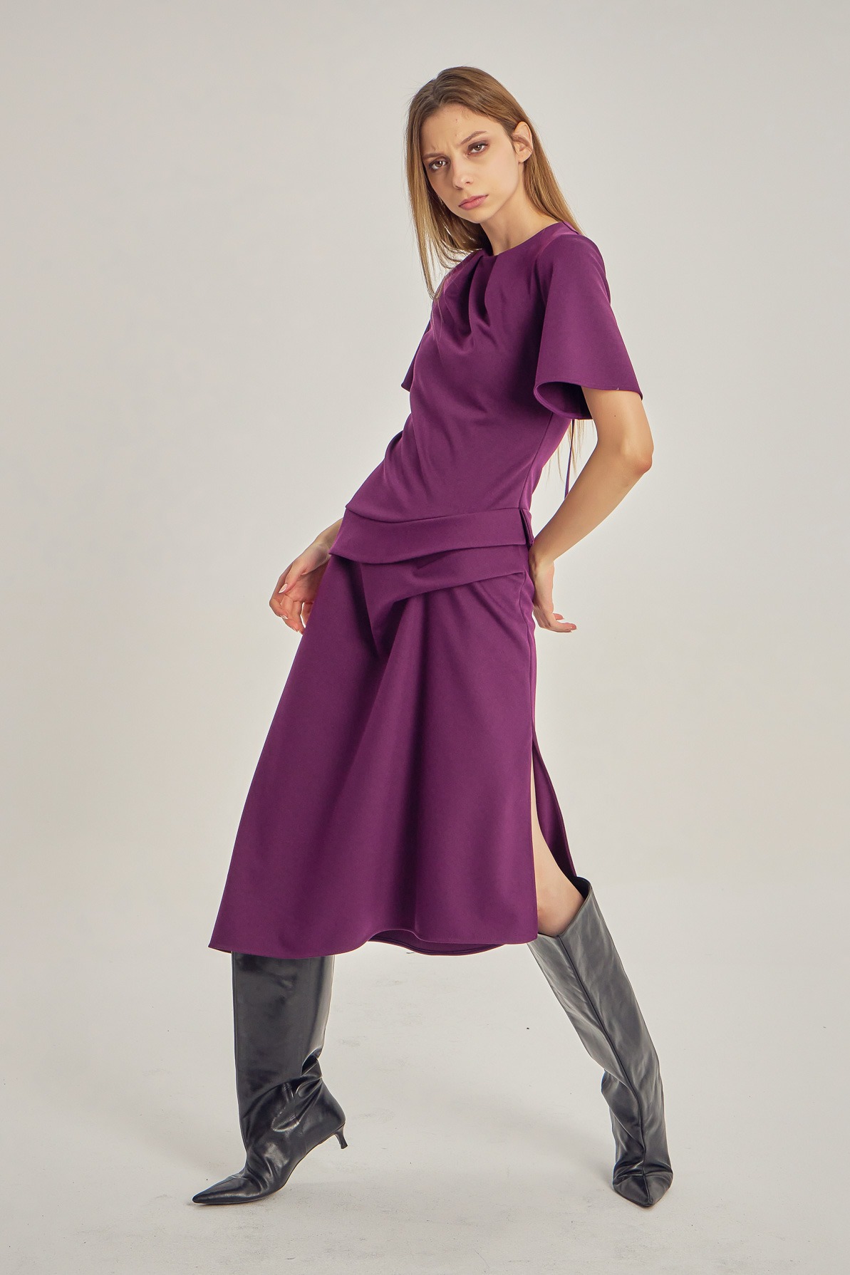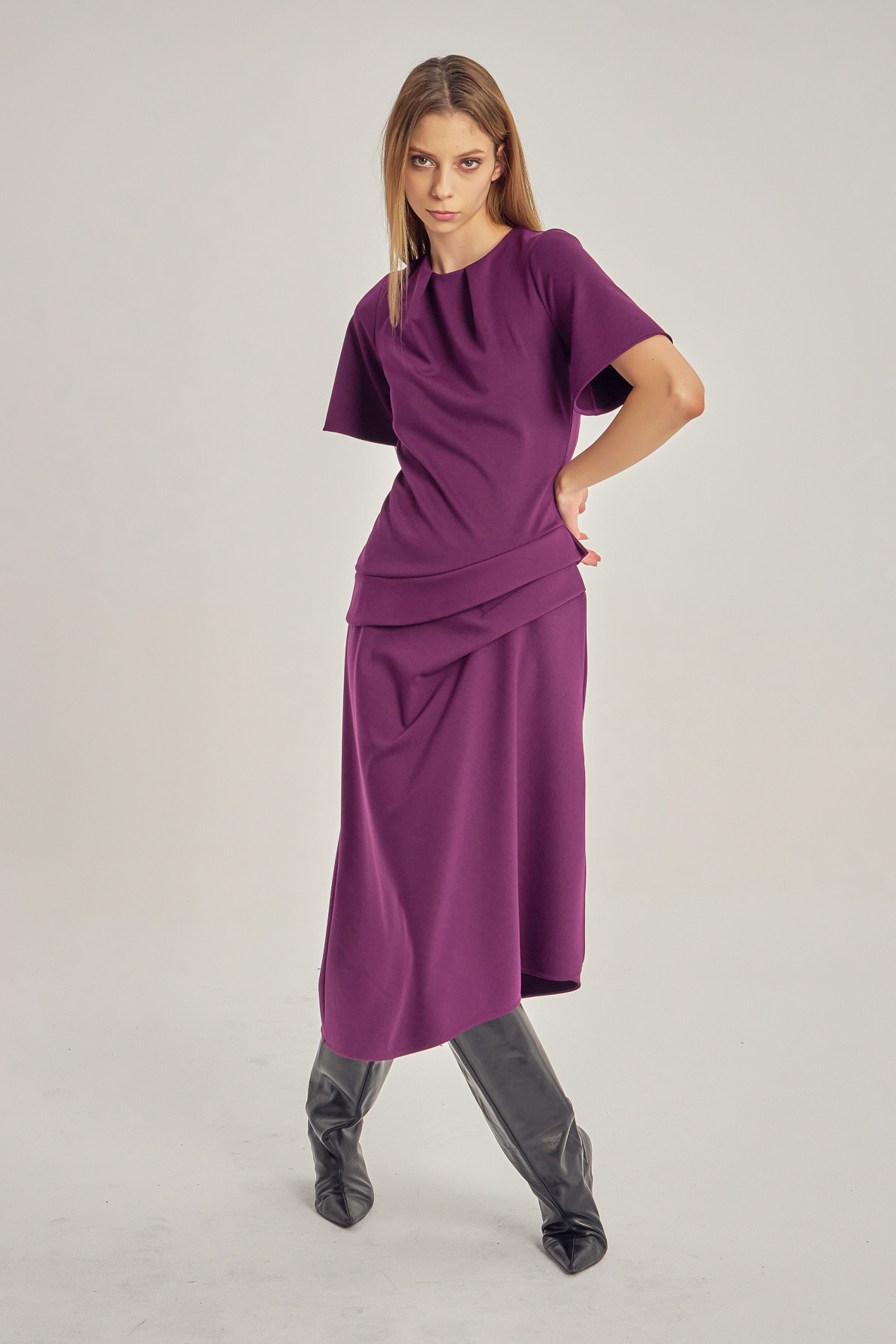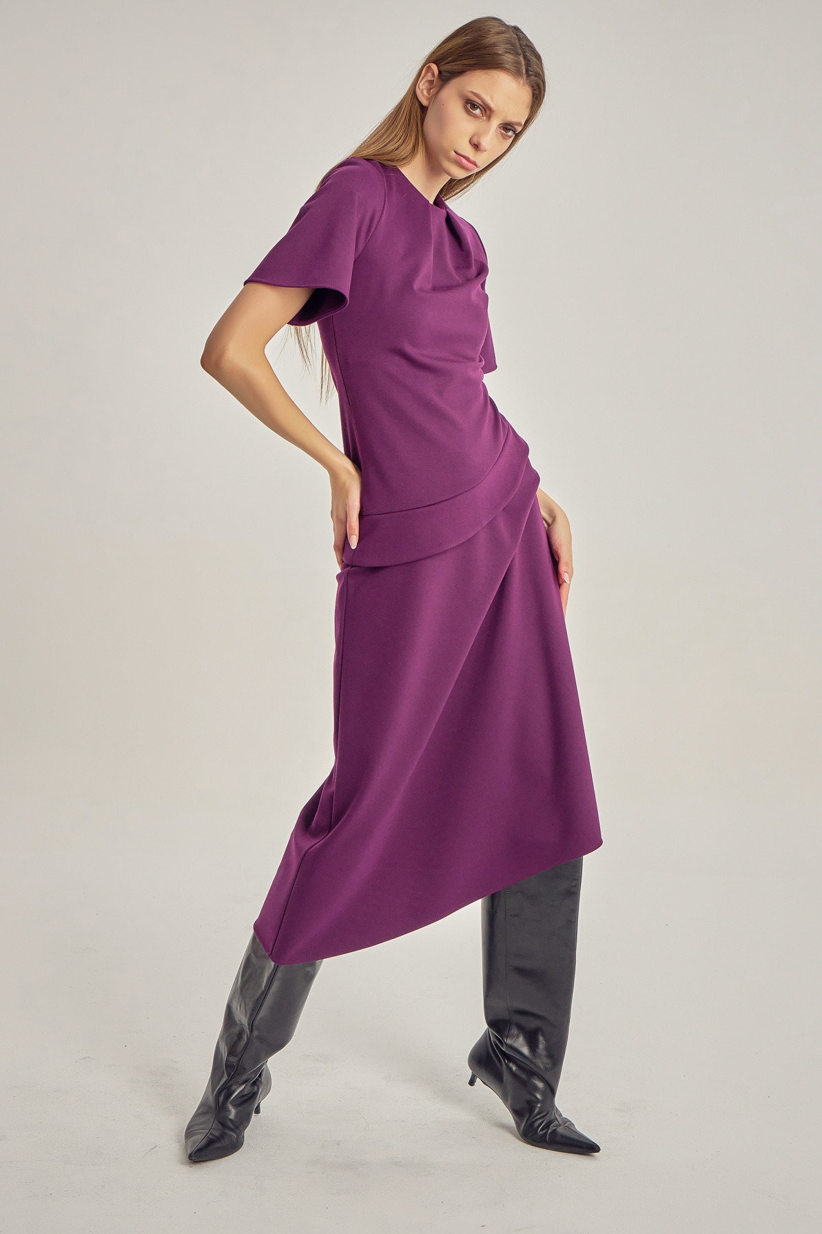 Midi dress with clean lines and asymmetric detailing. The short sleeves and subtle waist pleats create a silhouette that is both defined and fluid, with a refined play of volume. A contemporary piece for days when you want simplicity with presence.