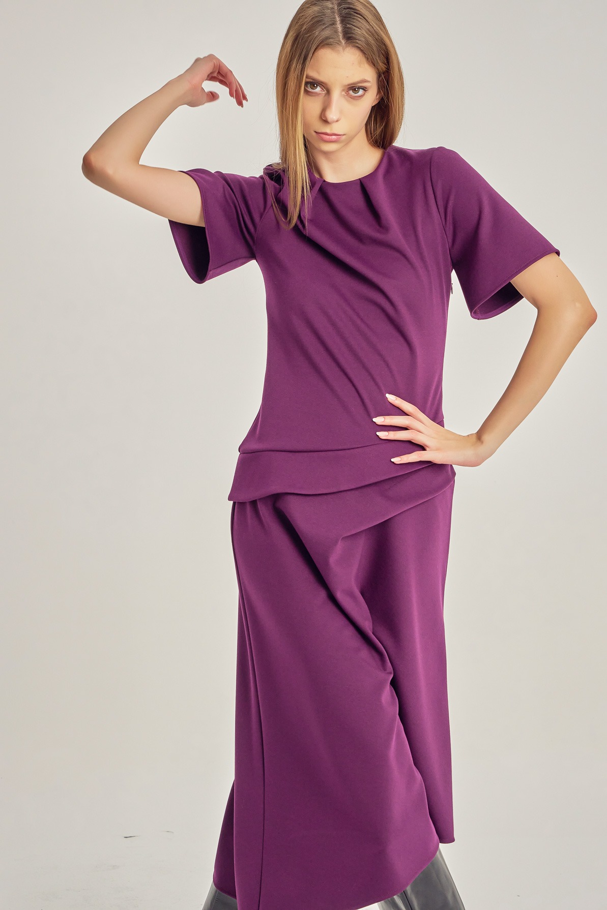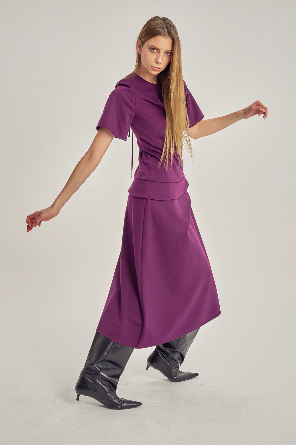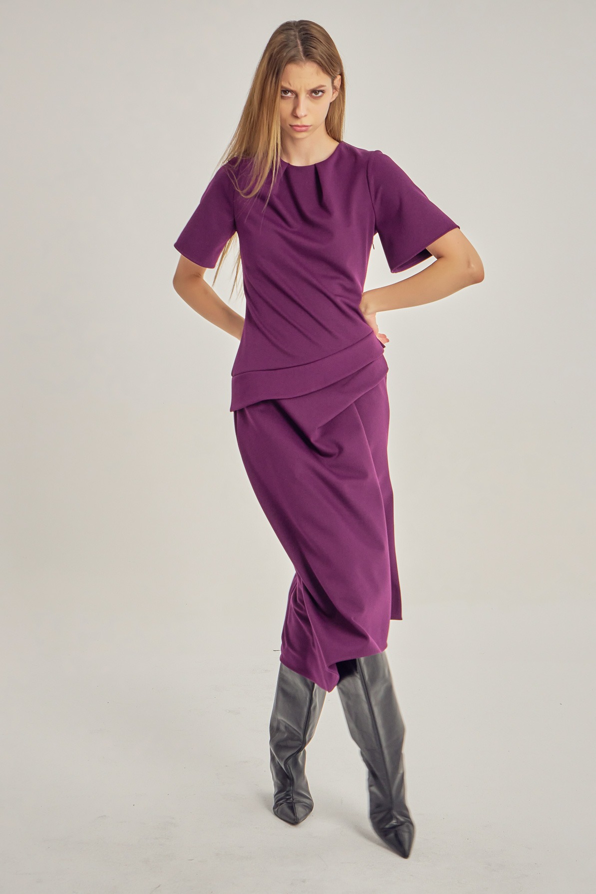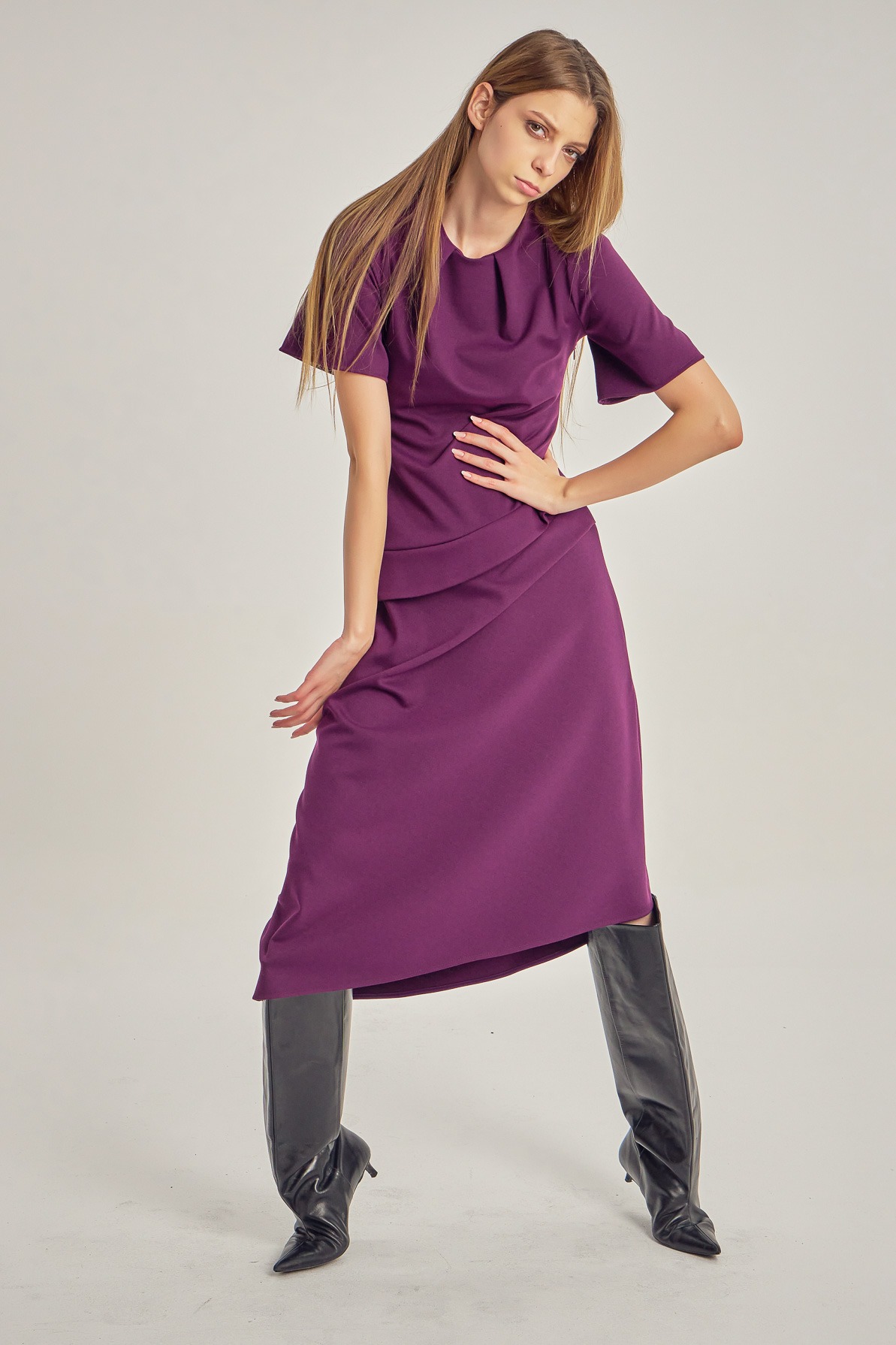 Midi dress with clean lines and asymmetric detailing. The short sleeves and subtle waist pleats create a silhouette that is both defined and fluid, with a refined play of volume. A contemporary piece for days when you want simplicity with presence.