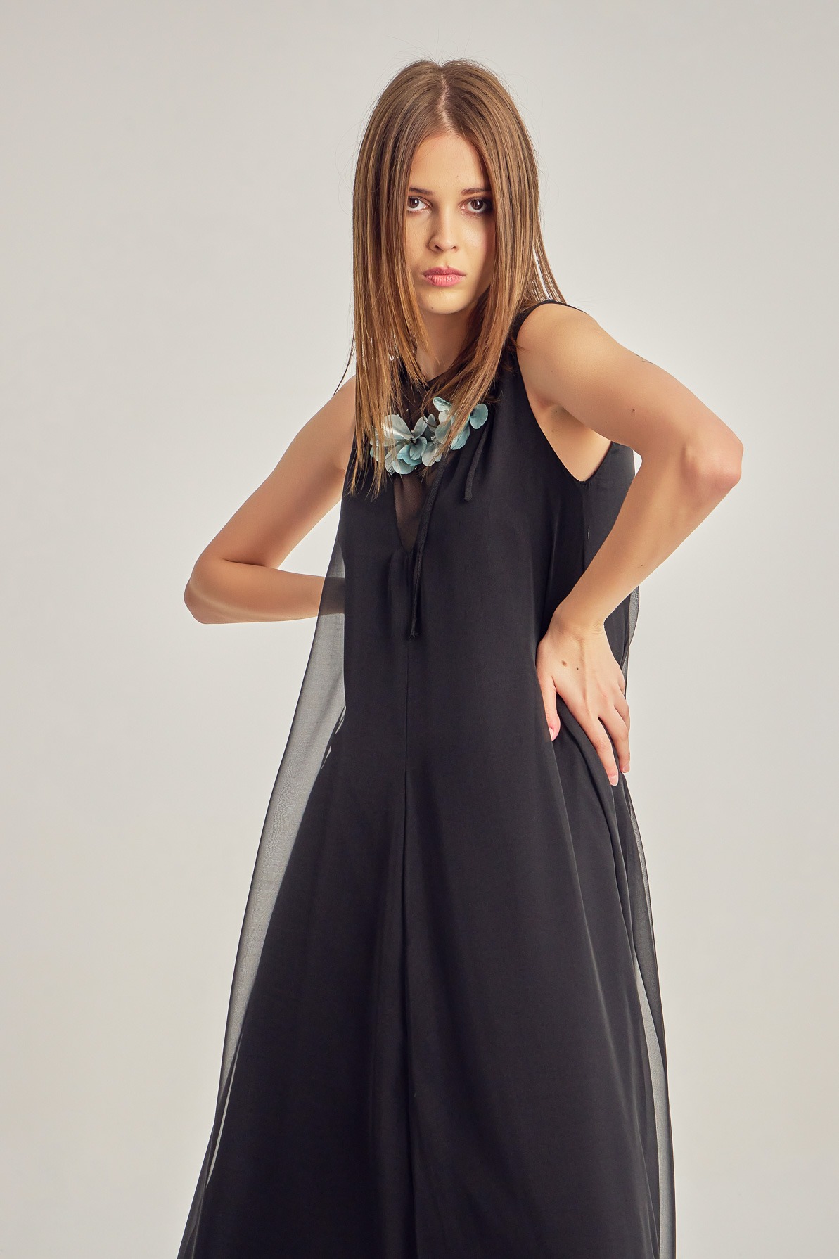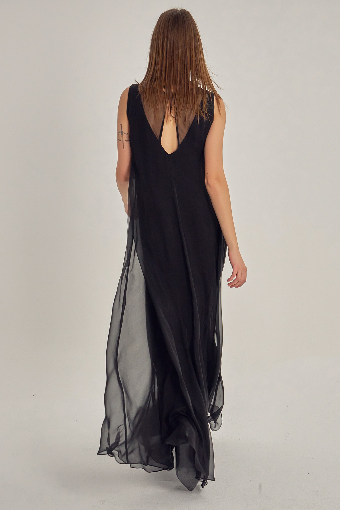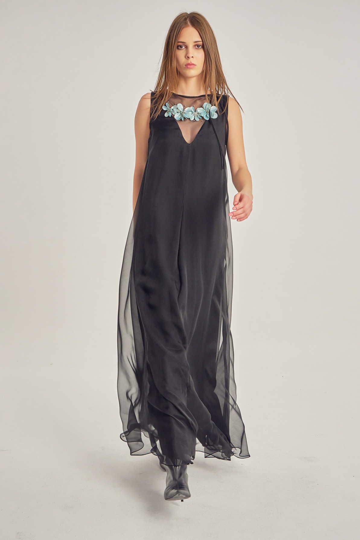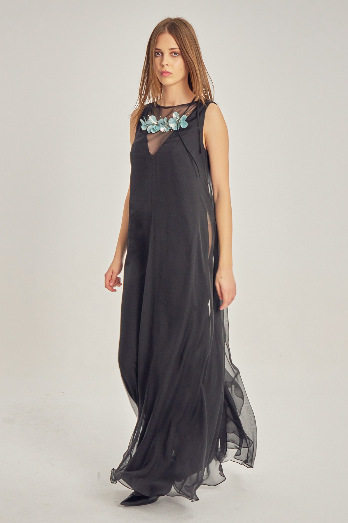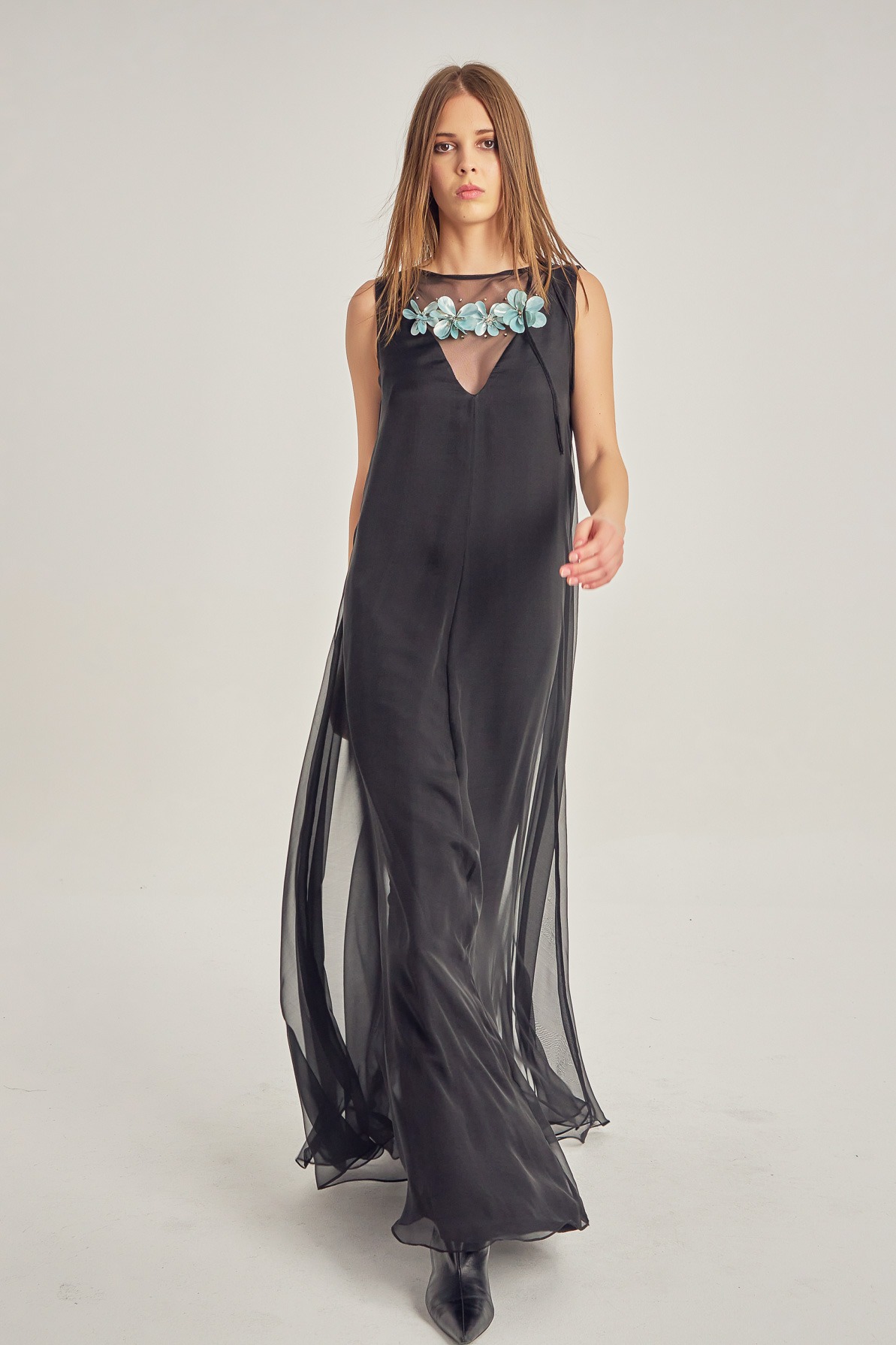 Elegant silk dress with a fluid silhouette and subtle details that highlight the form. The sleeveless design features a delicate cut-out at the neckline, accented with decorative floral appliqués, creating a refined contrast between transparency and opacity. The lightweight drape and soft layering offer natural movement, making it an ideal choice for evening wear or special occasions.