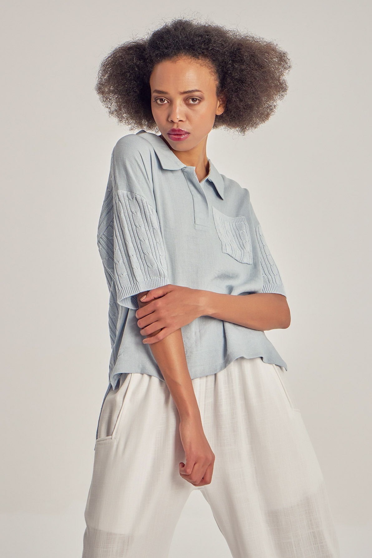 Loose linen and viscose blend top with short sleeves.