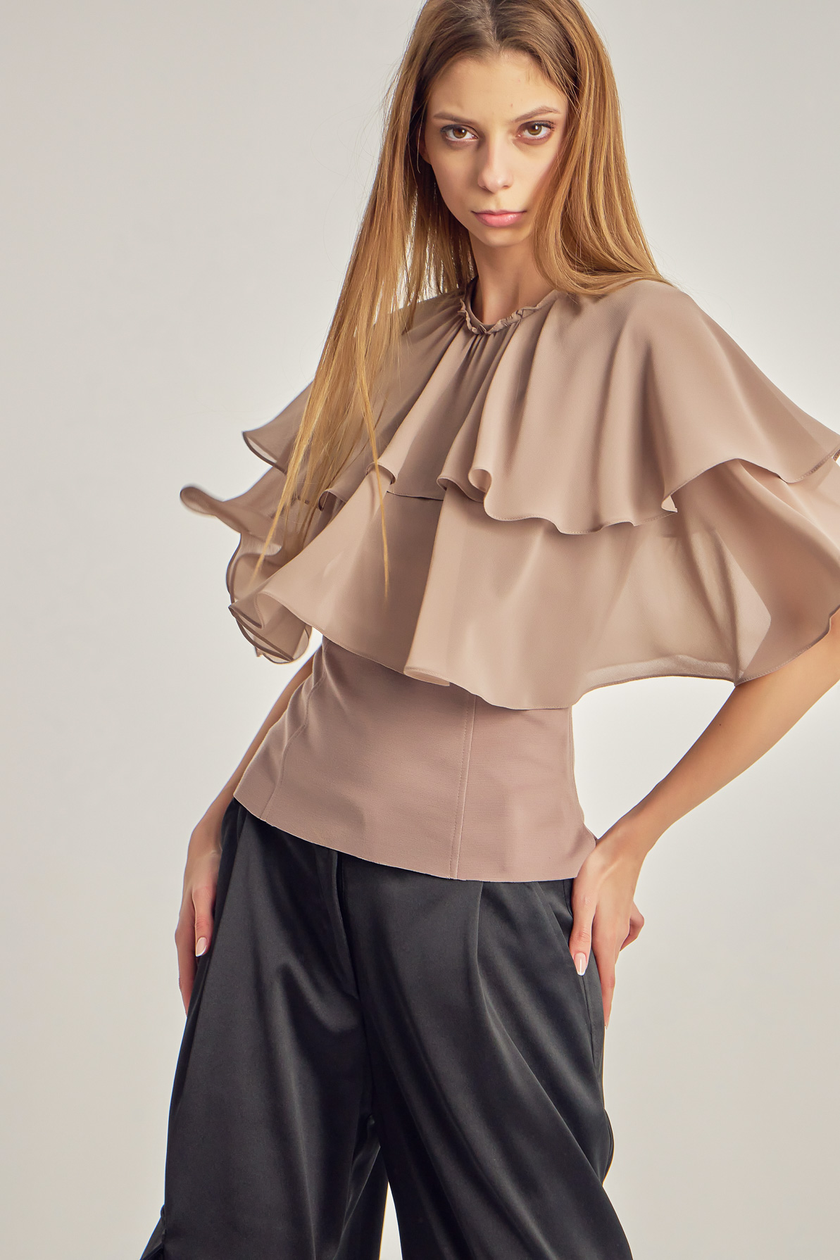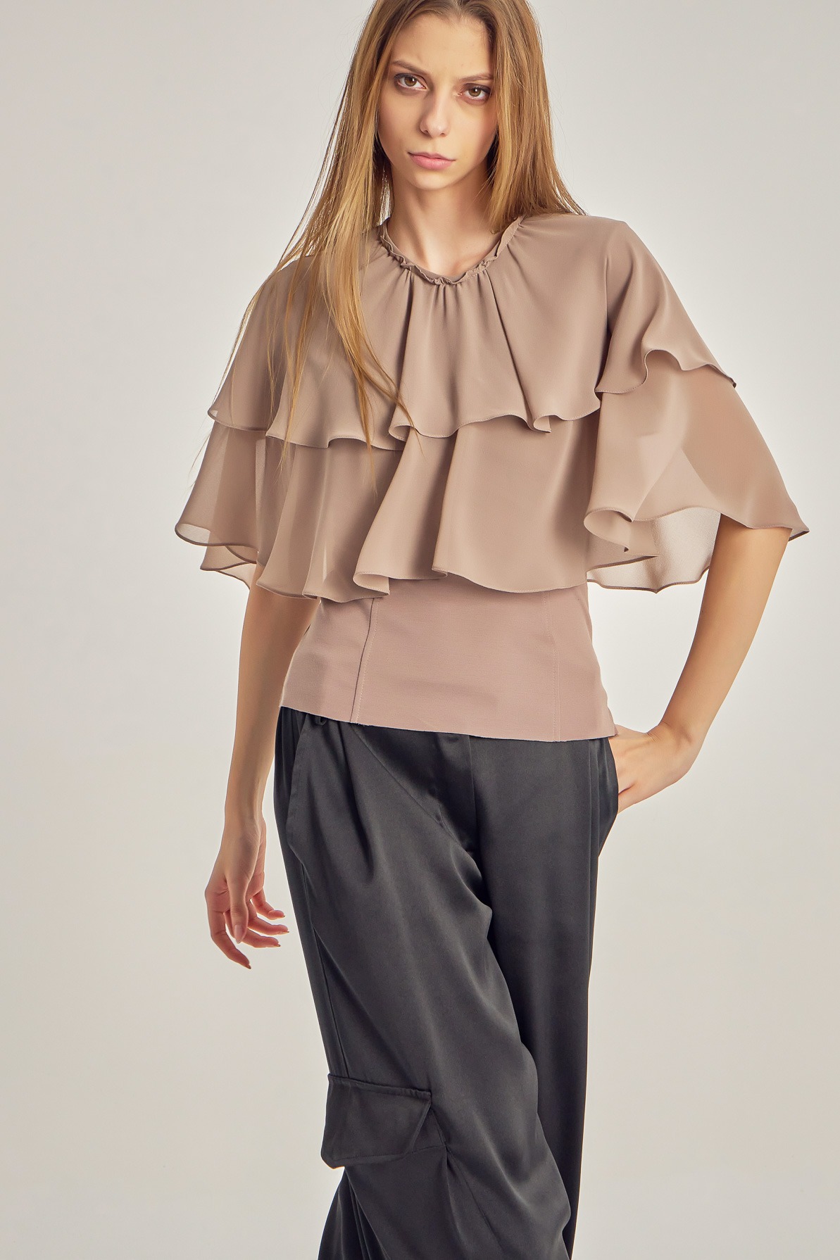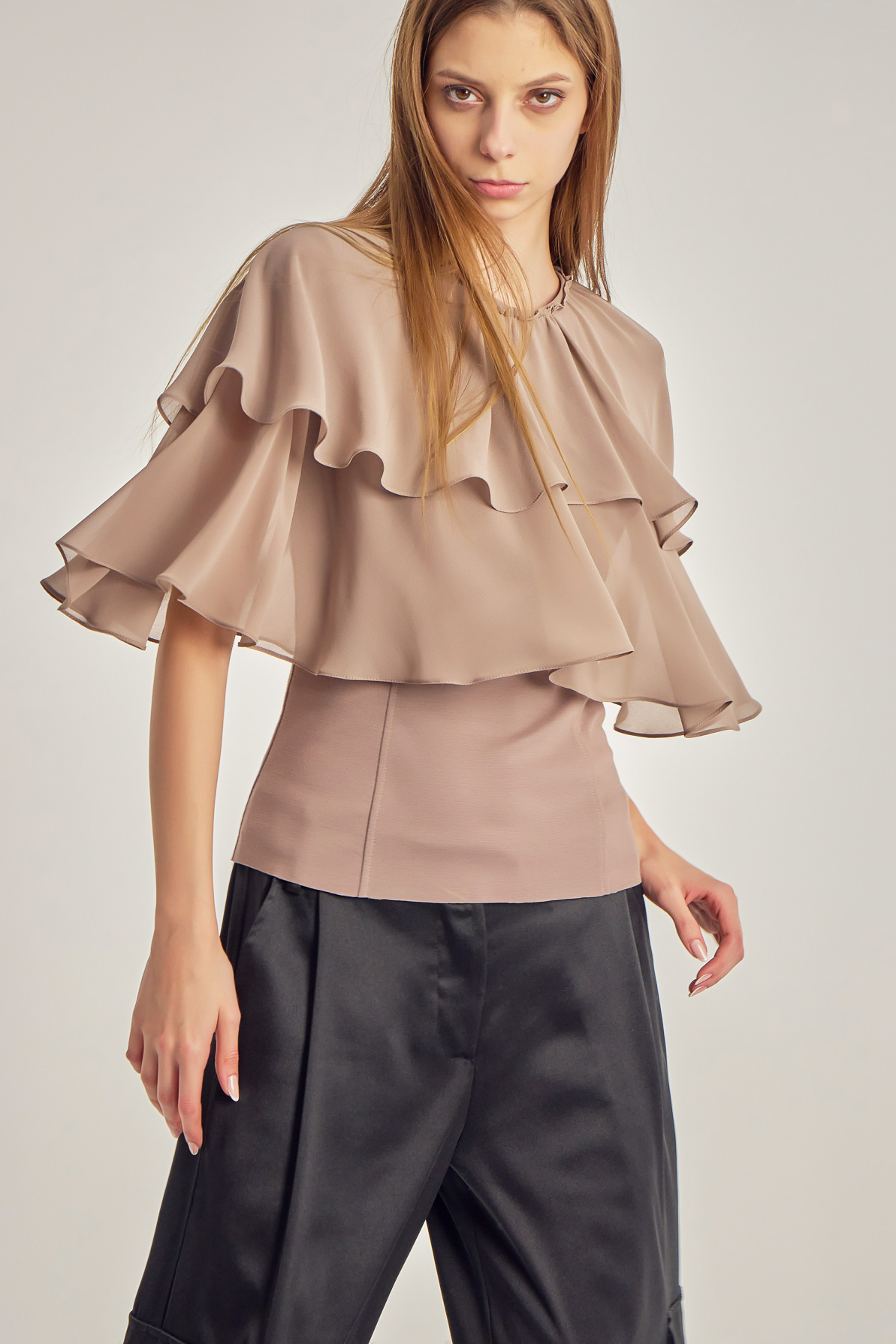 Voile top with cape-like ruffles.