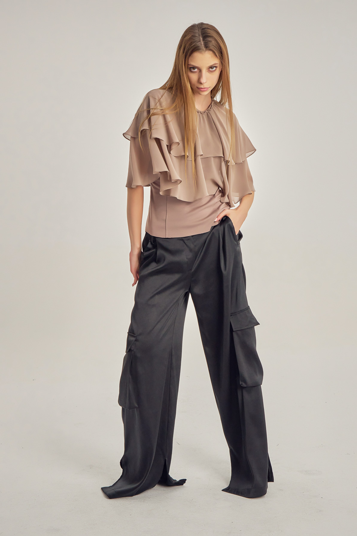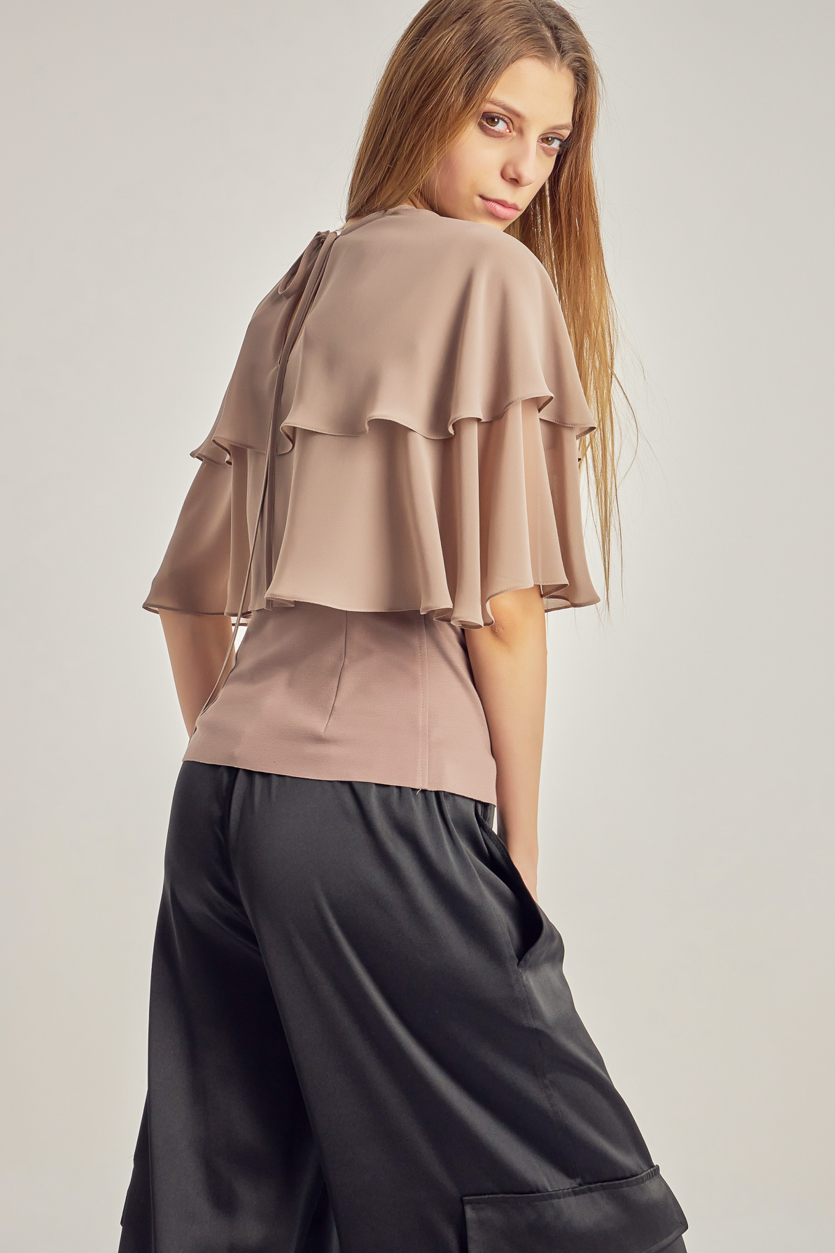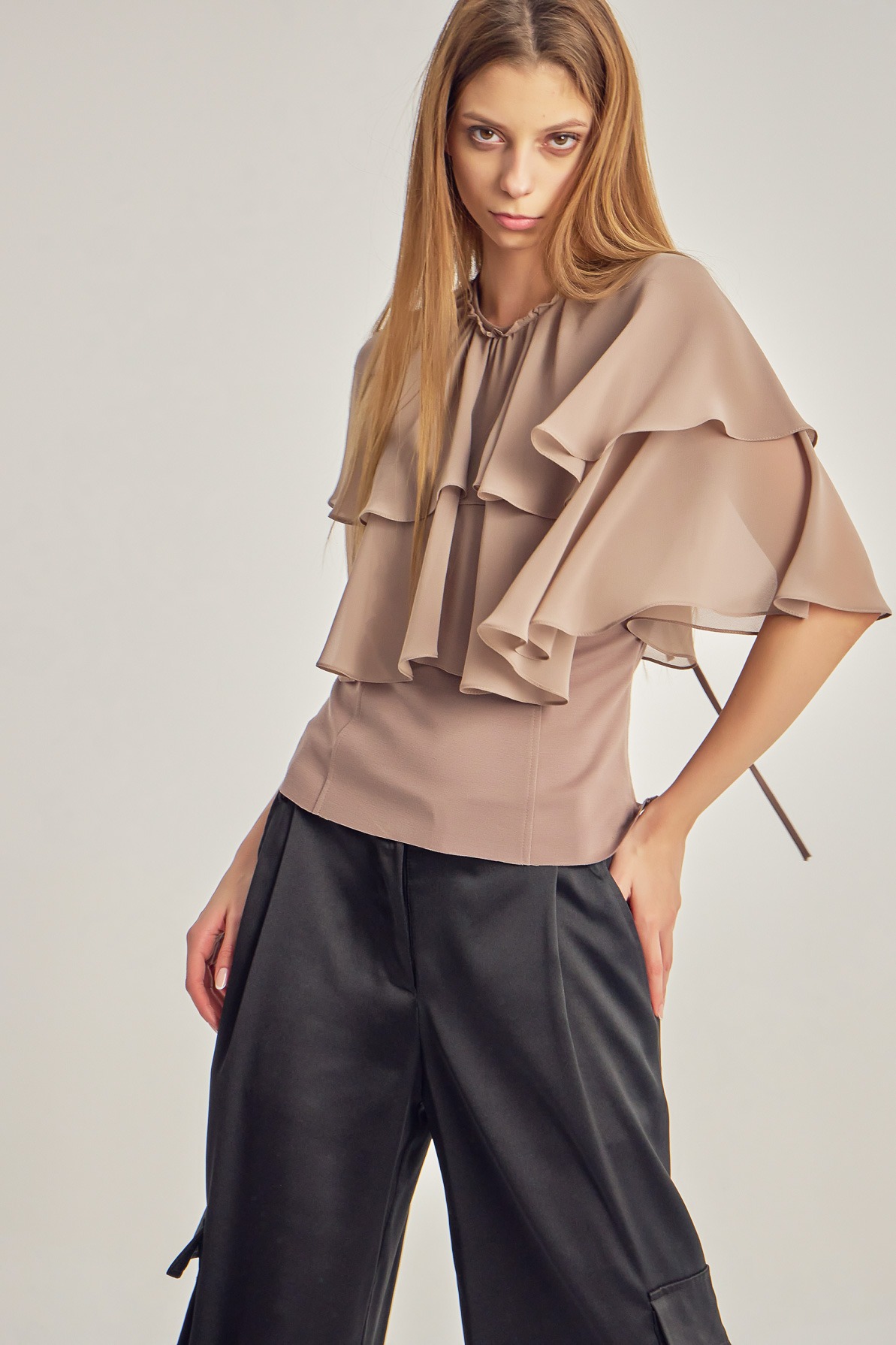 Voile top with cape-like ruffles.