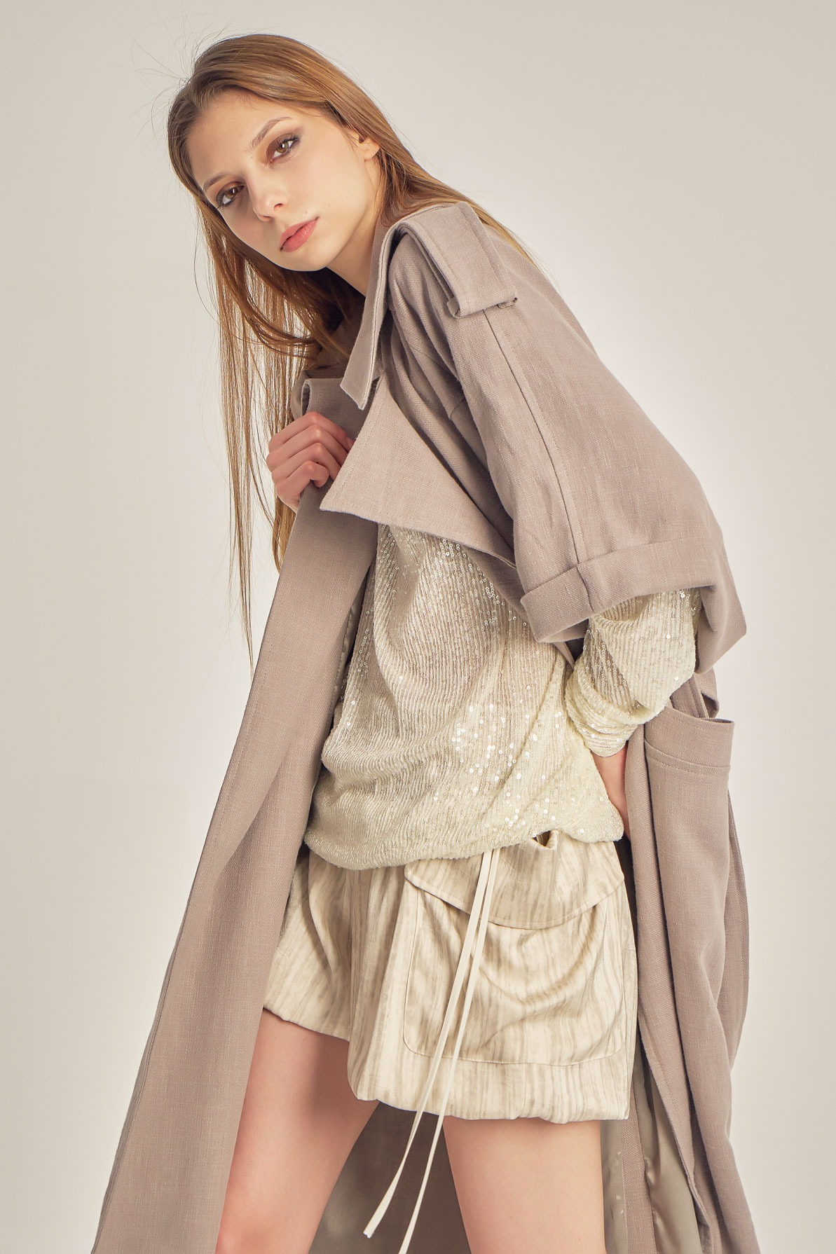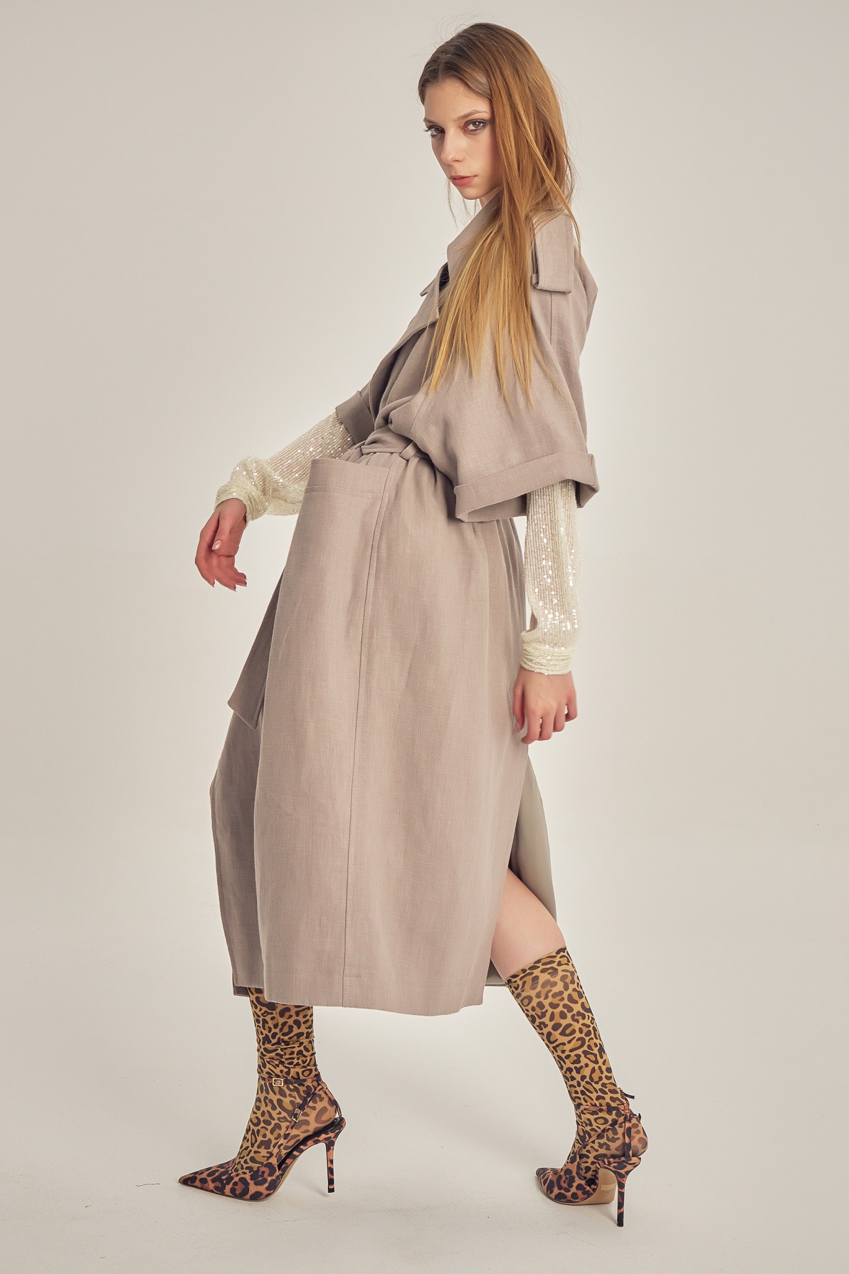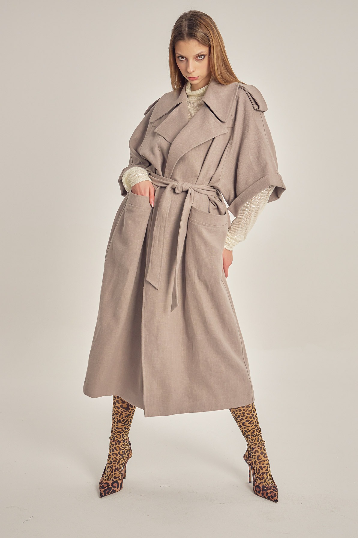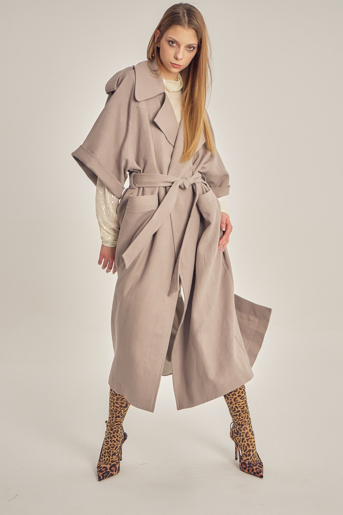 Ramie trench coat with a natural texture and subtle structure that holds its shape while remaining lightweight. The relaxed cut, oversized lapels and wide sleeves create a modern, architectural silhouette. The self-tie belt defines the waist when needed, while patch pockets add practicality. A statement yet wearable piece, ideal for layering throughout transitional seasons.