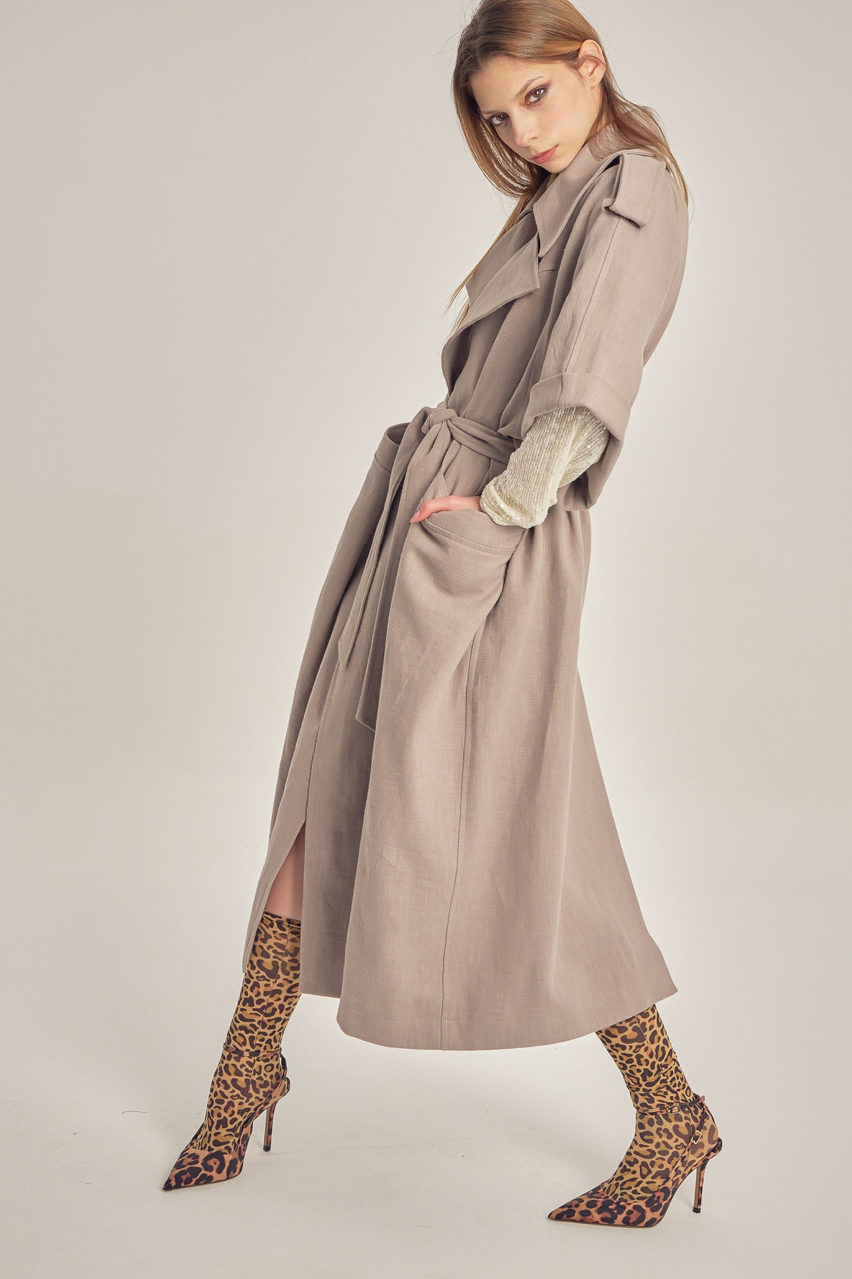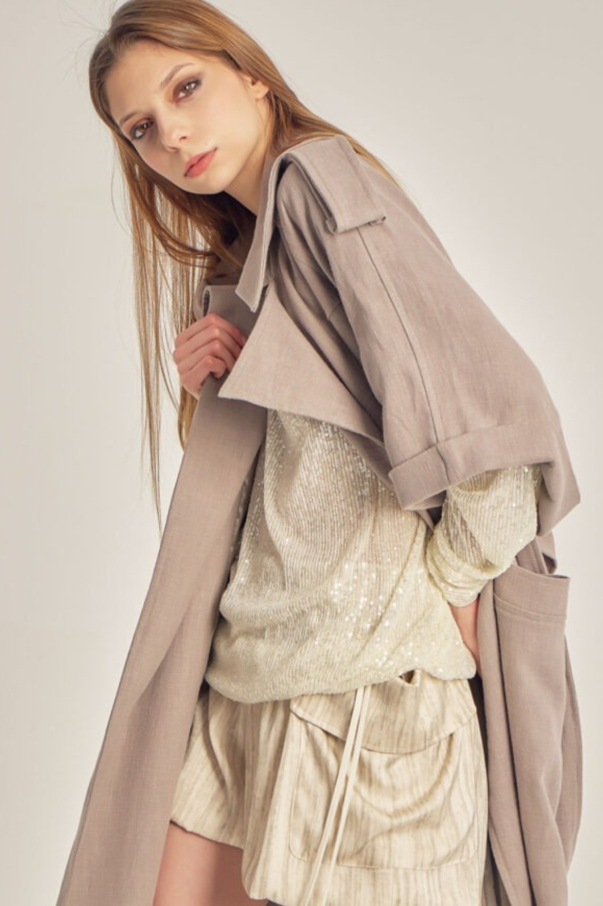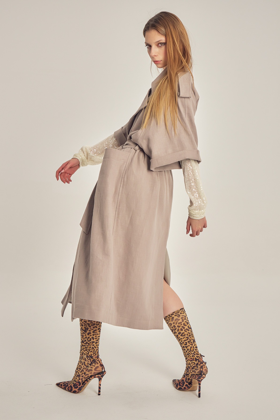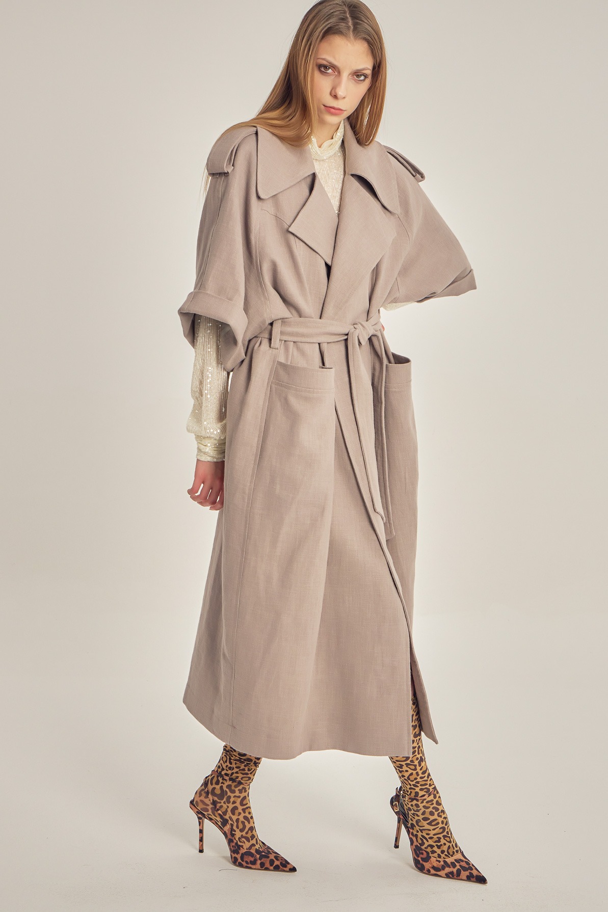 Ramie trench coat with a natural texture and subtle structure that holds its shape while remaining lightweight. The relaxed cut, oversized lapels and wide sleeves create a modern, architectural silhouette. The self-tie belt defines the waist when needed, while patch pockets add practicality. A statement yet wearable piece, ideal for layering throughout transitional seasons.