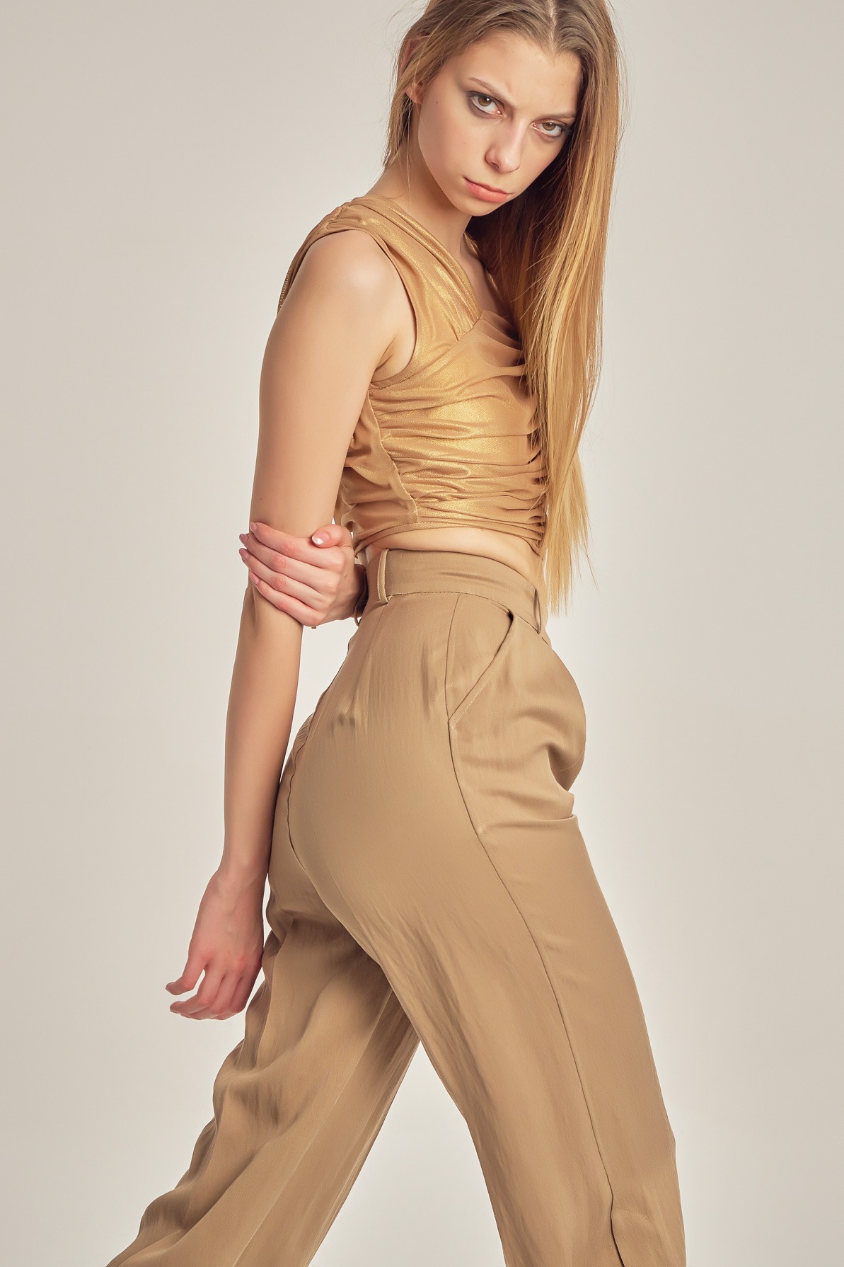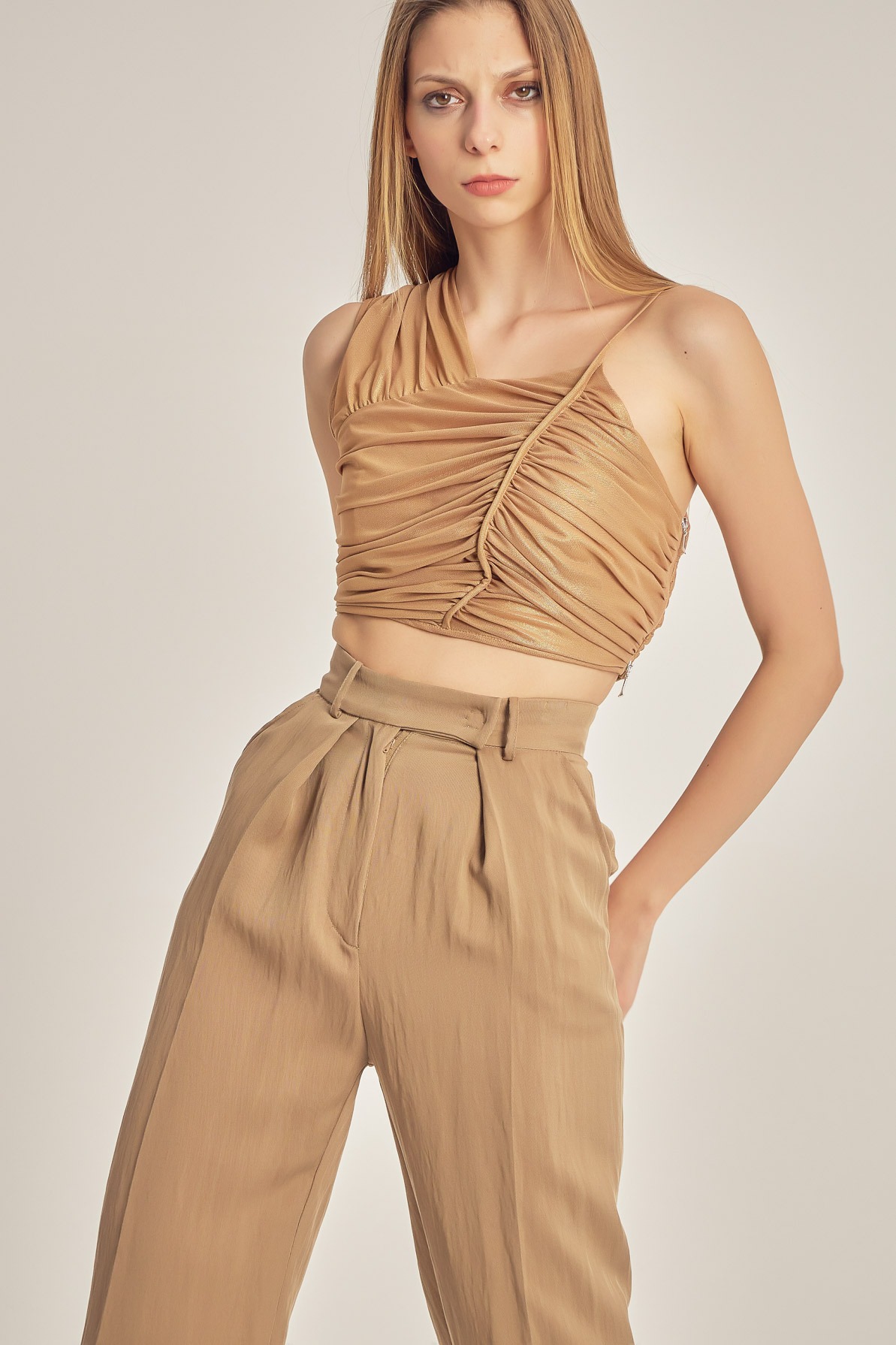 Metallic tulle top featuring delicate draping that highlights the bust line and adds a subtle luminous effect. The cropped silhouette and fine straps make it a statement piece, perfect for layering or worn as a bold focal point in evening looks.