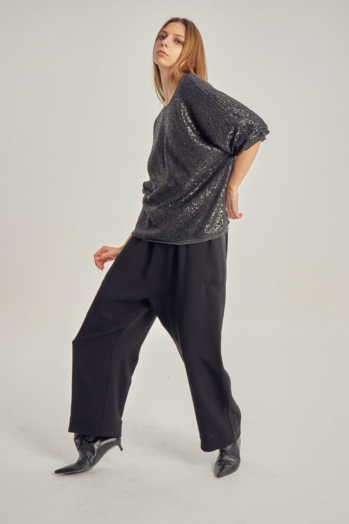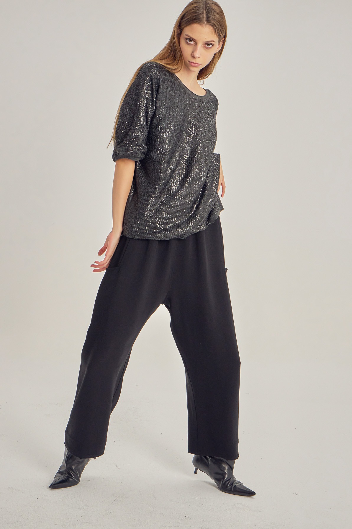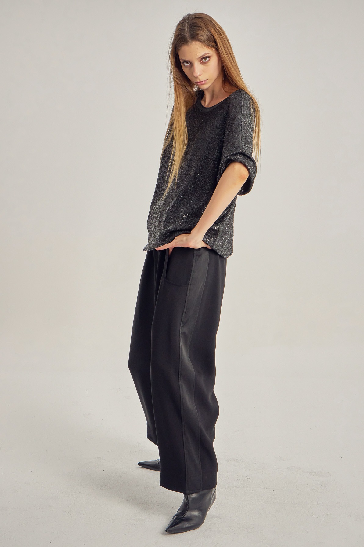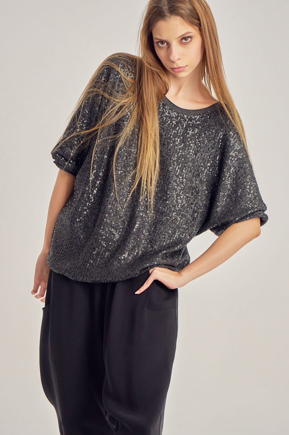 Bluză din paiete, căptușită, cu finisaje din jerse.