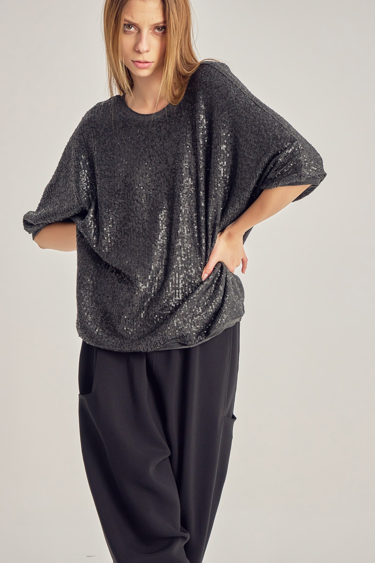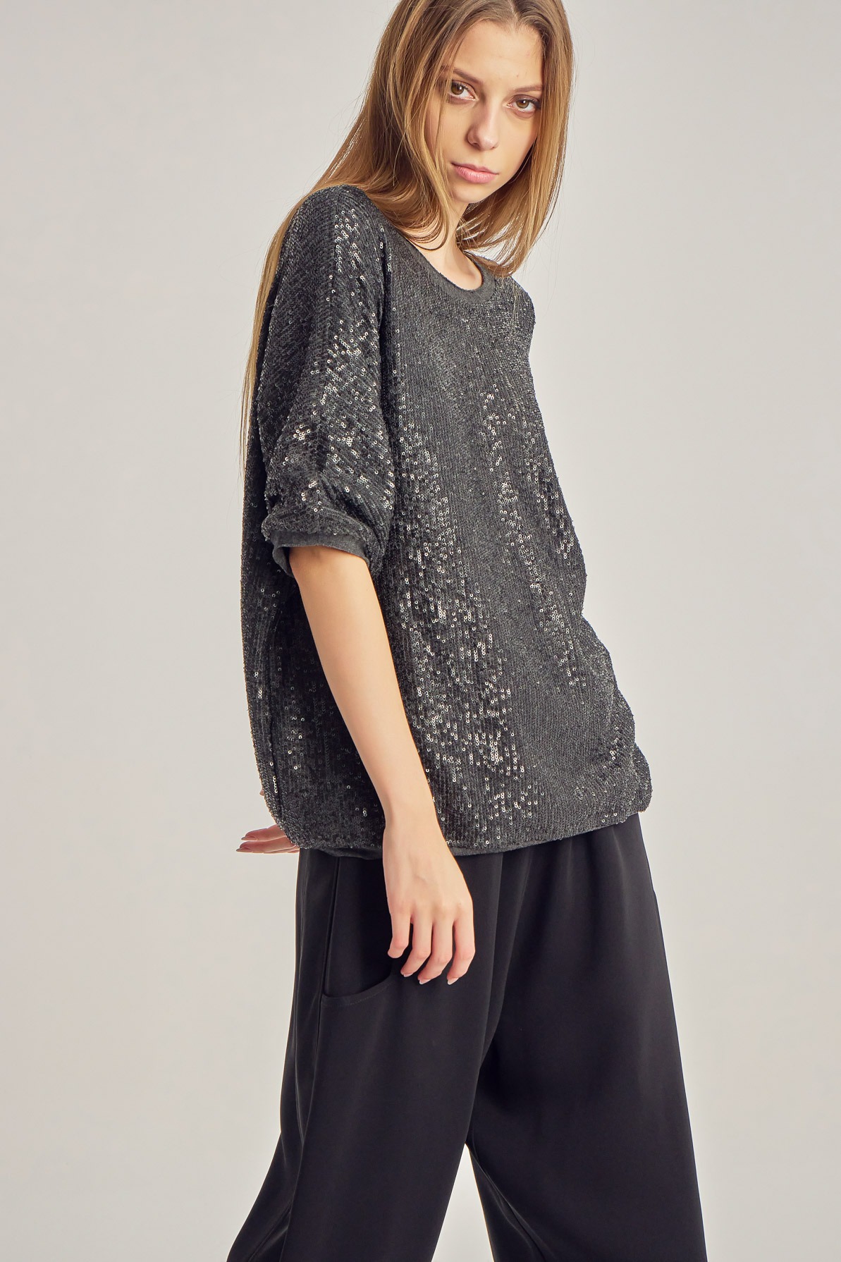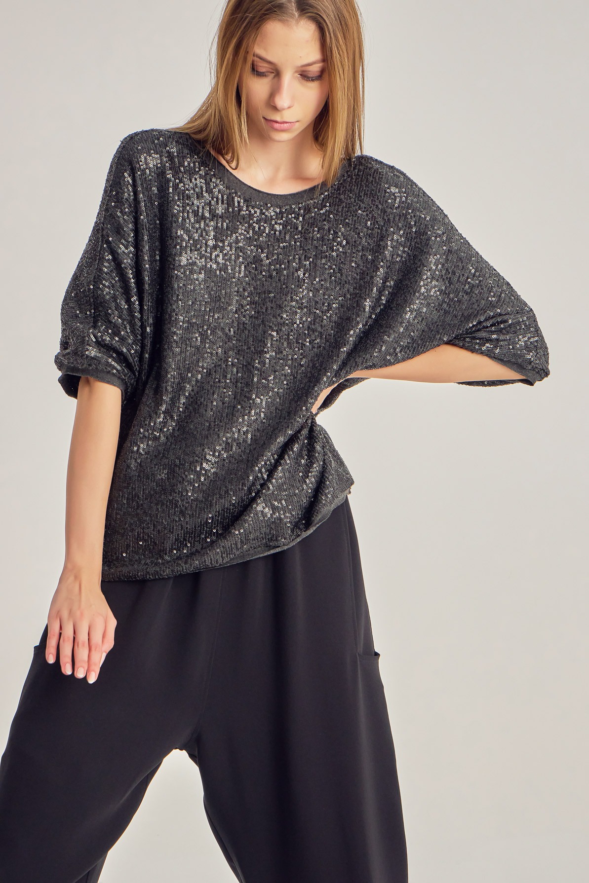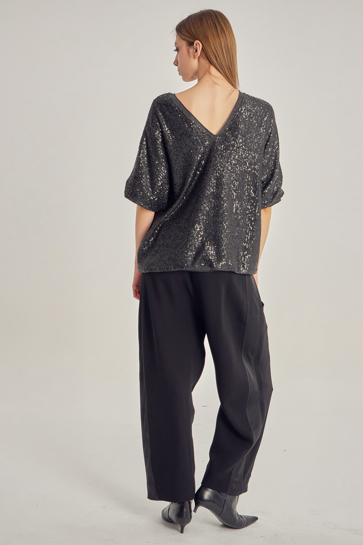 Bluză din paiete, căptușită, cu finisaje din jerse.