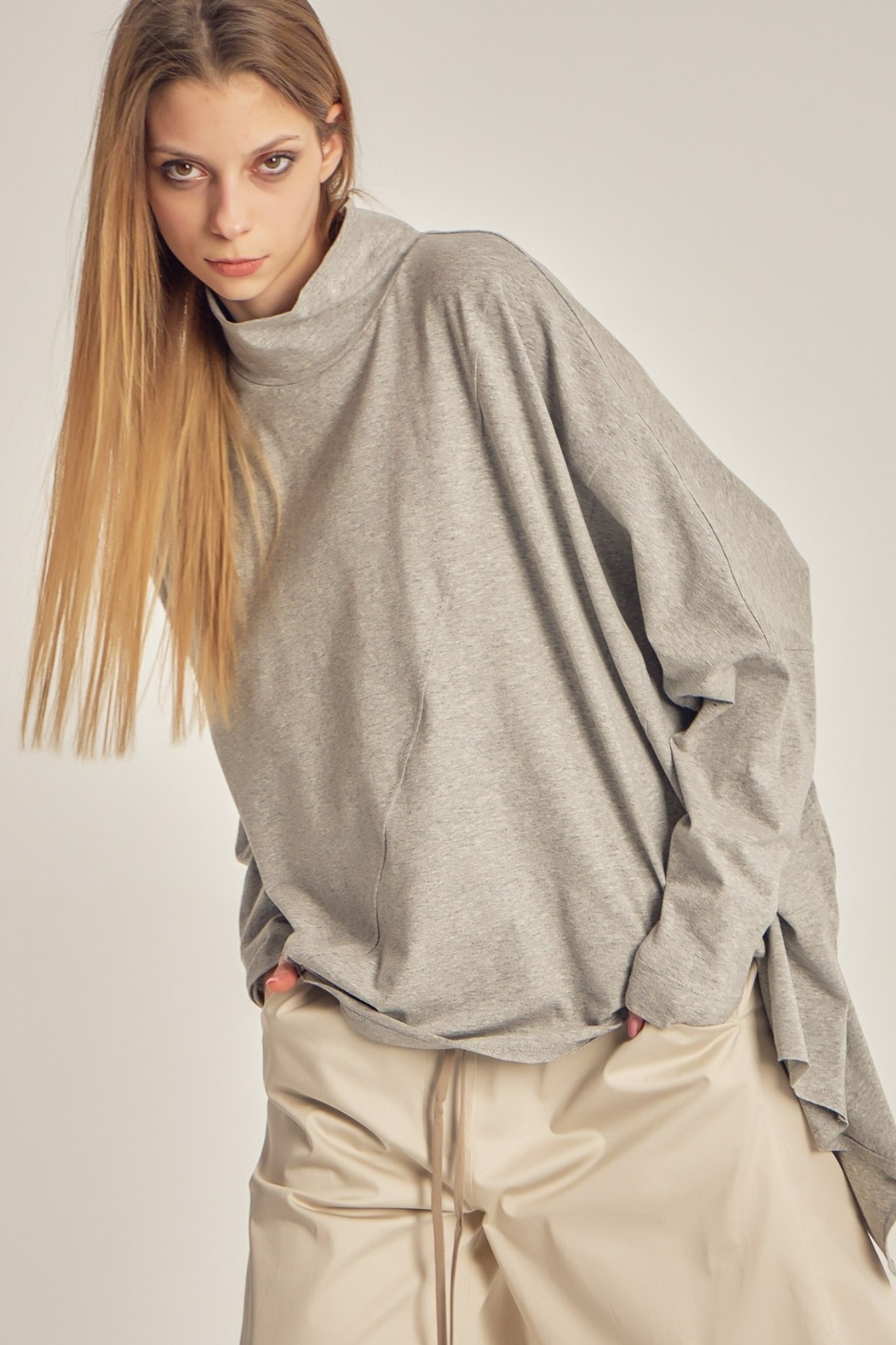 Top din jerse moale, cu croială lejeră și guler tip maletă. Designul minimalist și proporțiile relaxate îl fac ideal pentru layering sau purtare individuală, oferind confort și un aer contemporan, effortless.