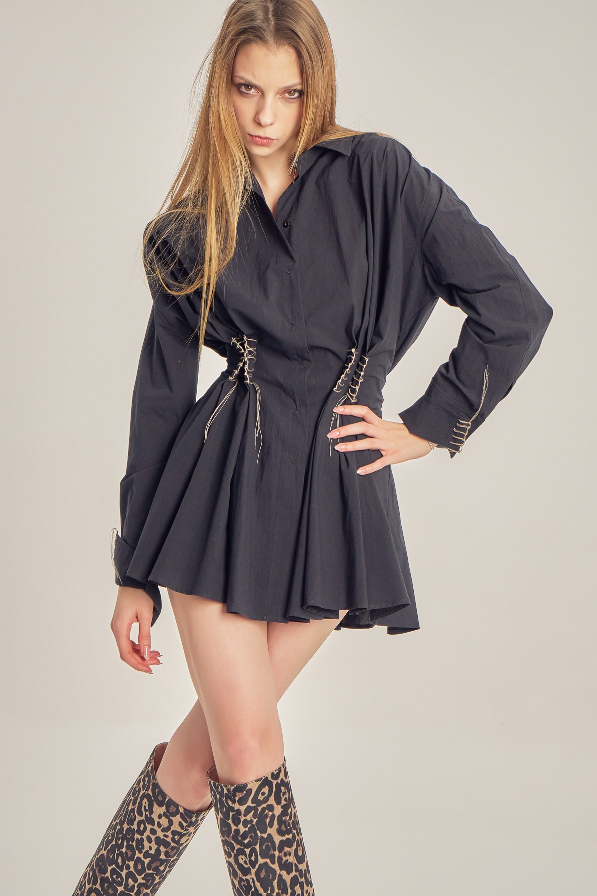 Rochie tip cămașă realizată din poplin de bumbac, cu structură clară și cădere controlată. Silueta este reinterpretată prin pliseuri ample pe laterale, fixate discret pentru a marca talia fără rigiditate.