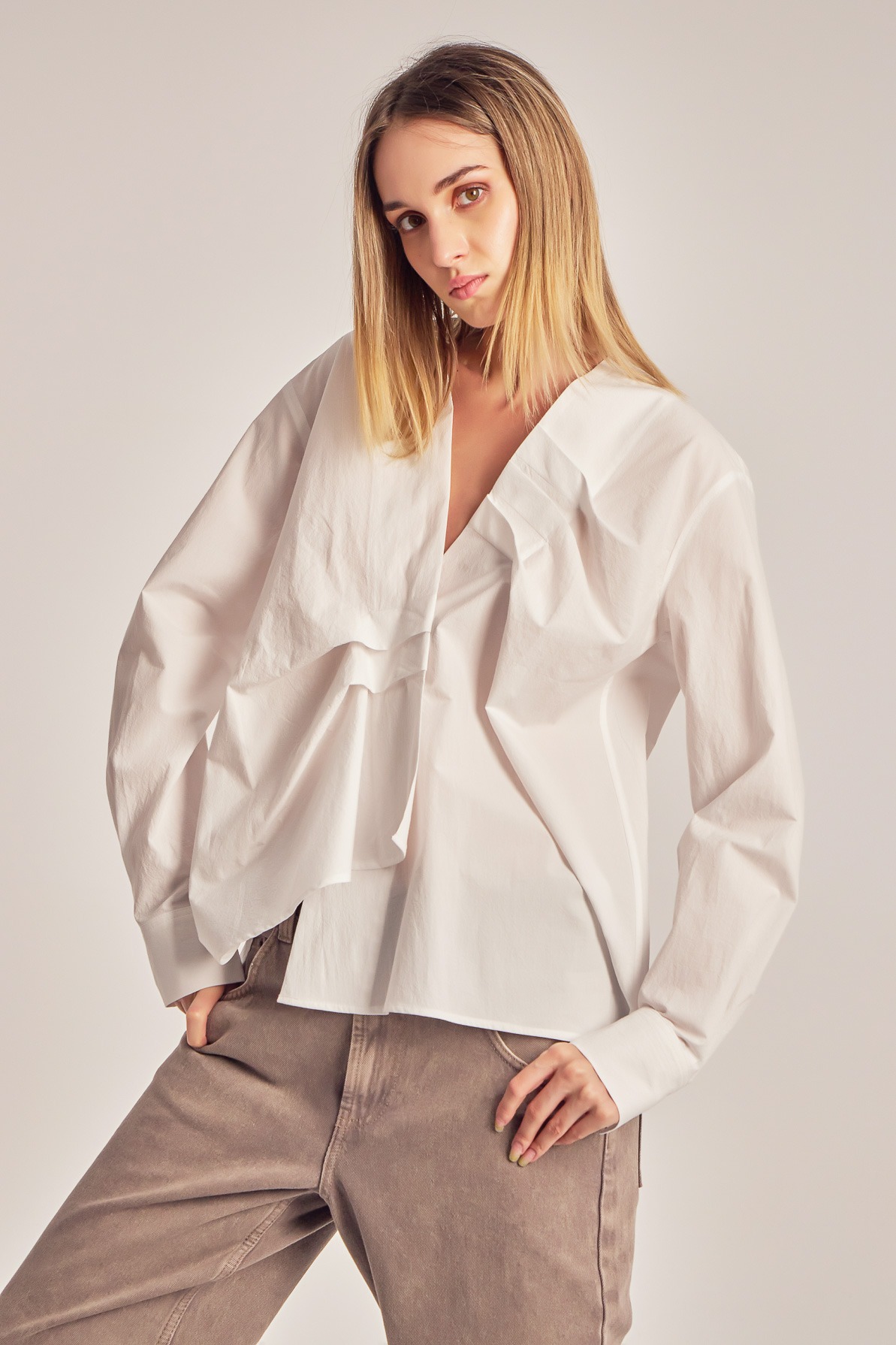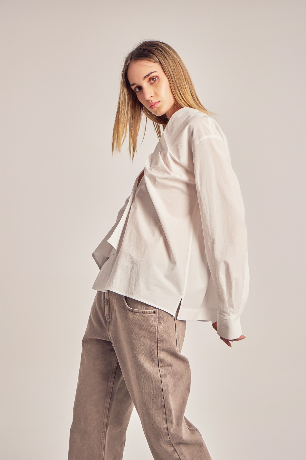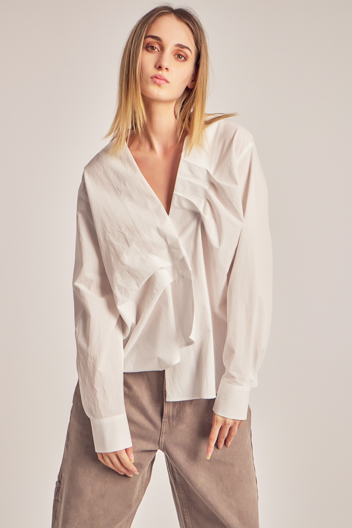 Cămașă cu pliuri asimetrice, din poplin prespălat.