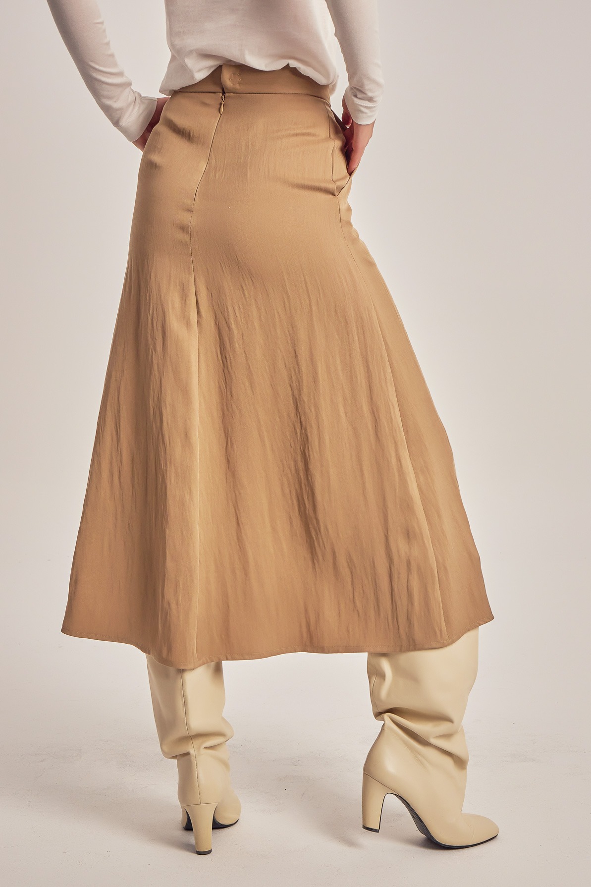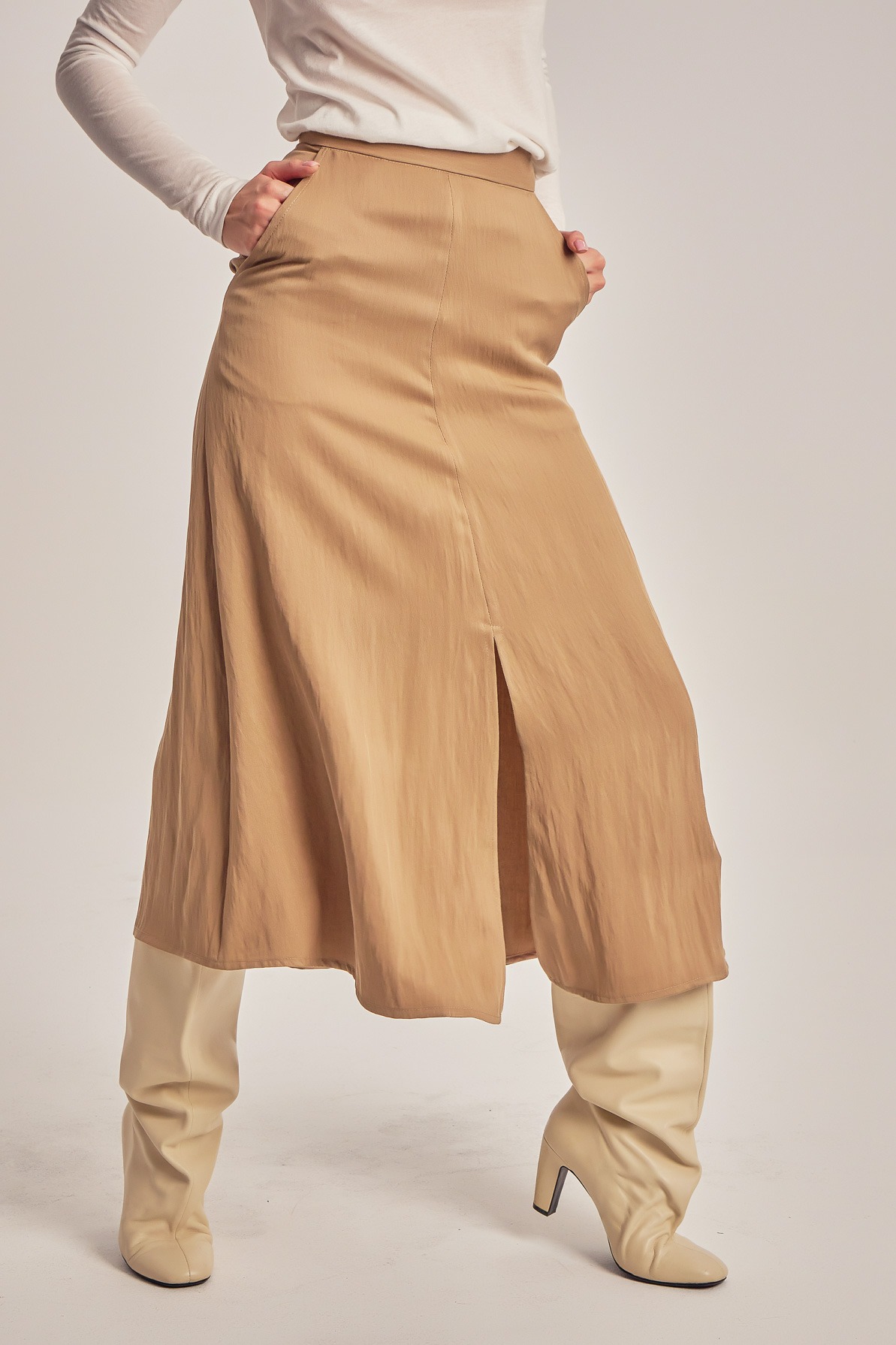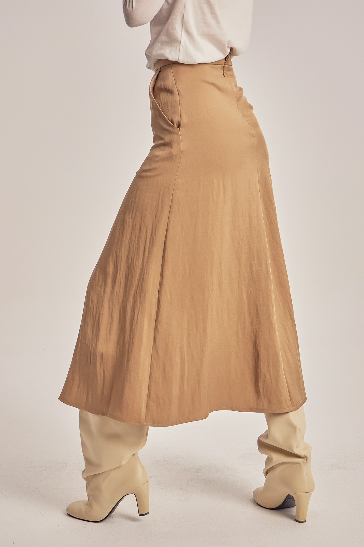 Fustă midi evazată, cu talie înaltă și buzunare laterale, din material satinat.