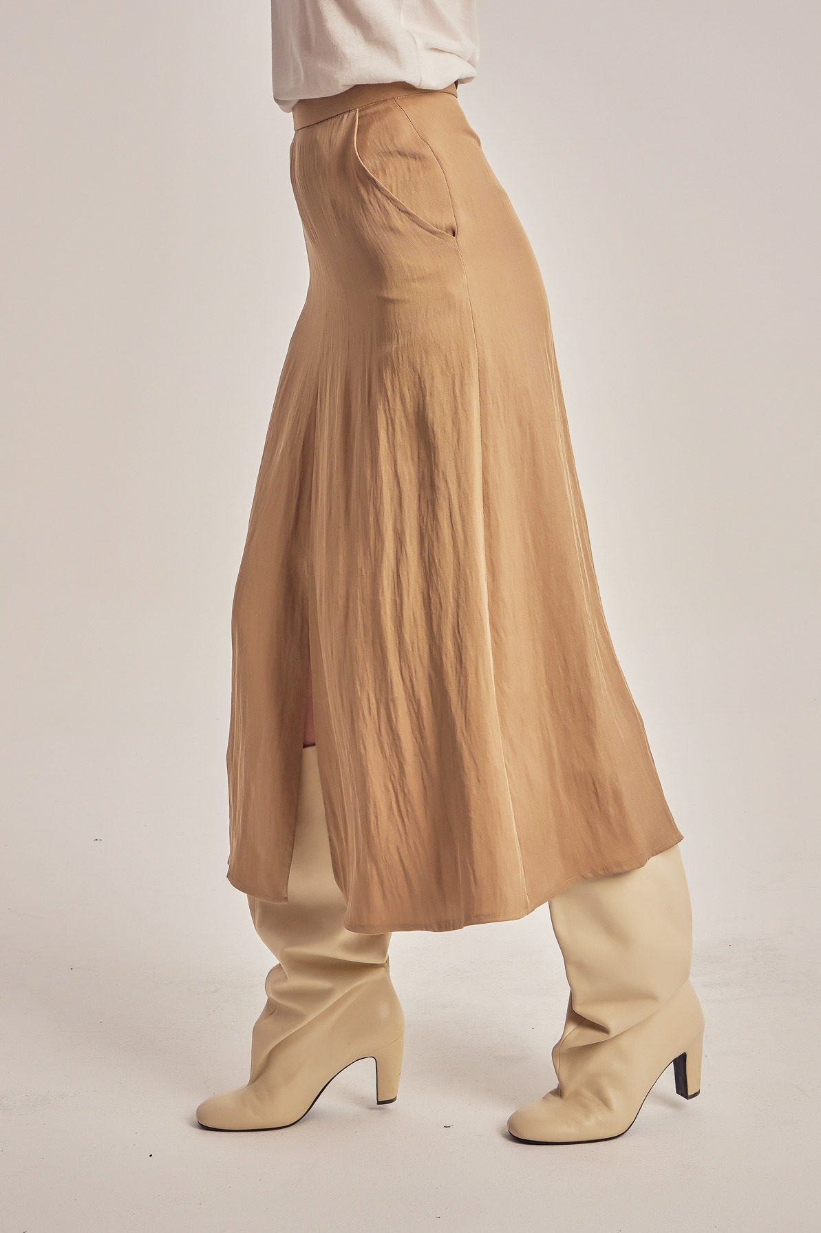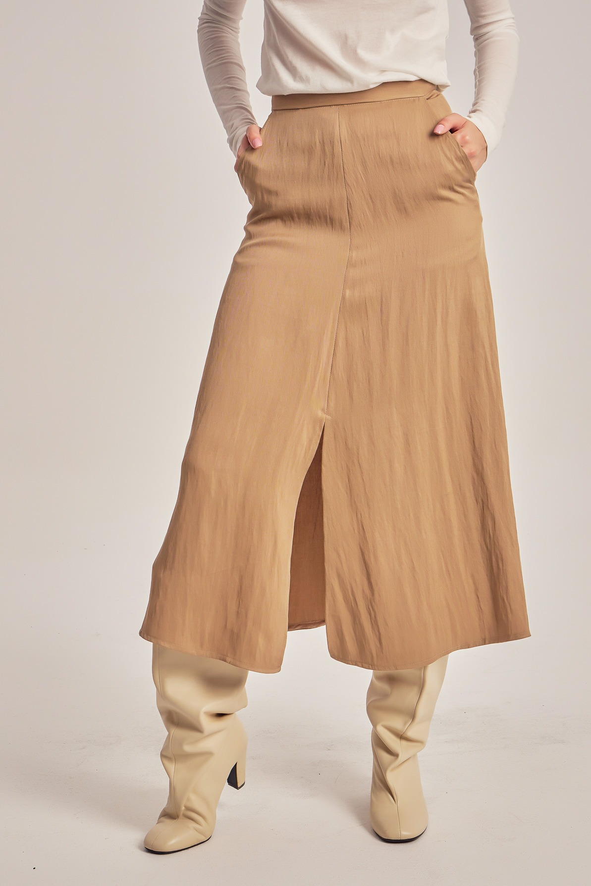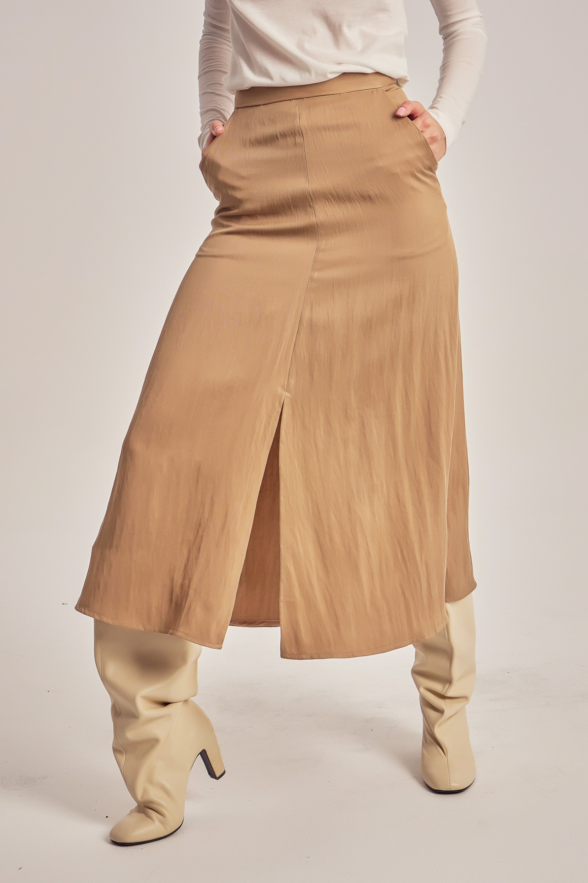 Fustă midi evazată, cu talie înaltă și buzunare laterale, din material satinat.