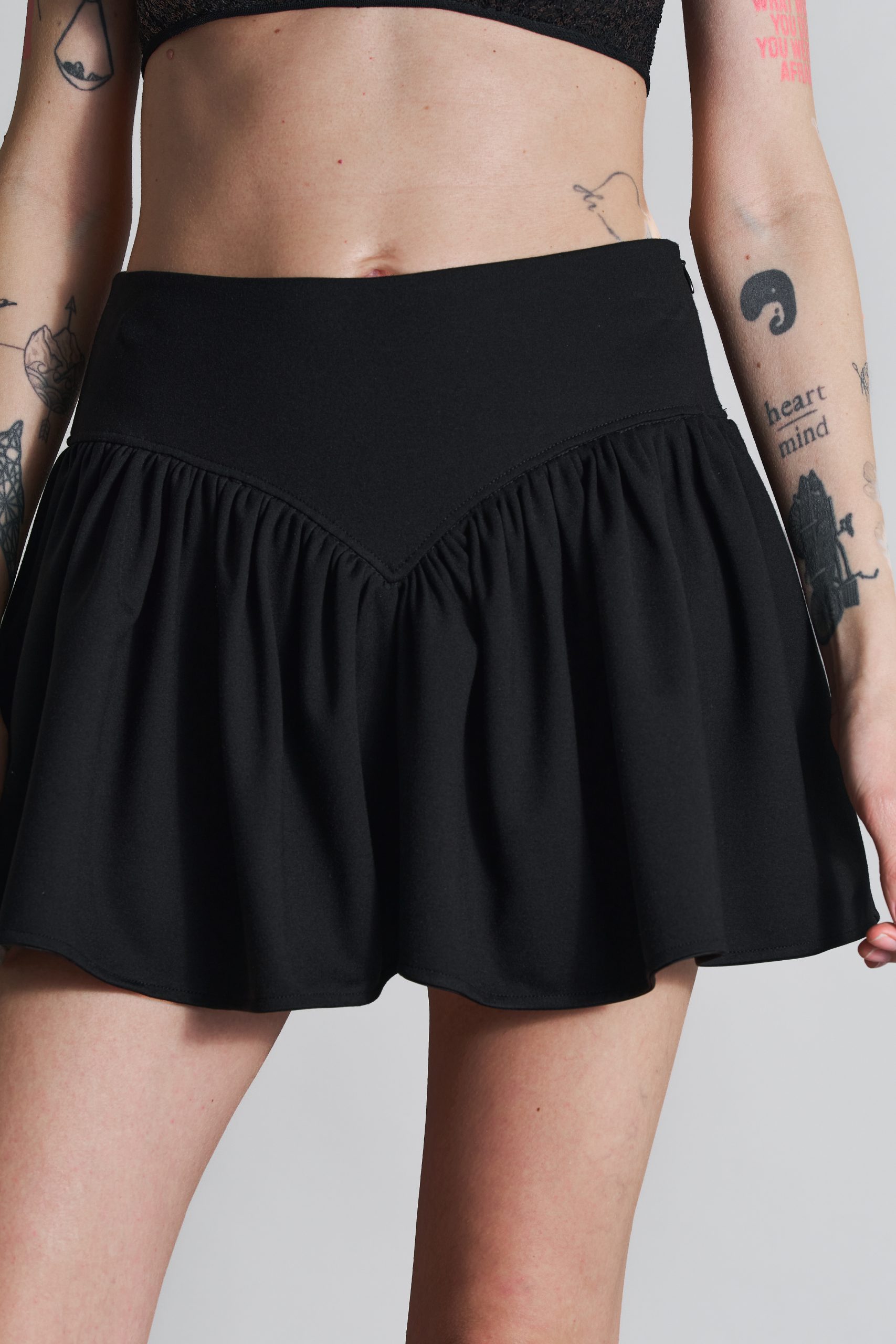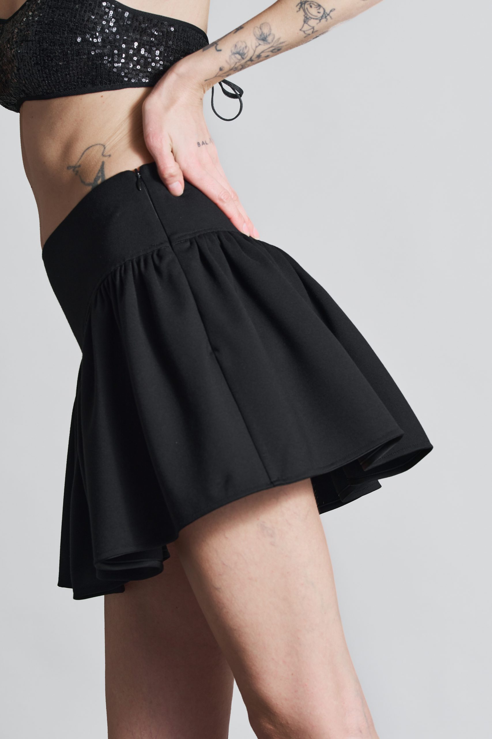 Fustă mini încrețită, cu basc și fermoar lateral ascuns.