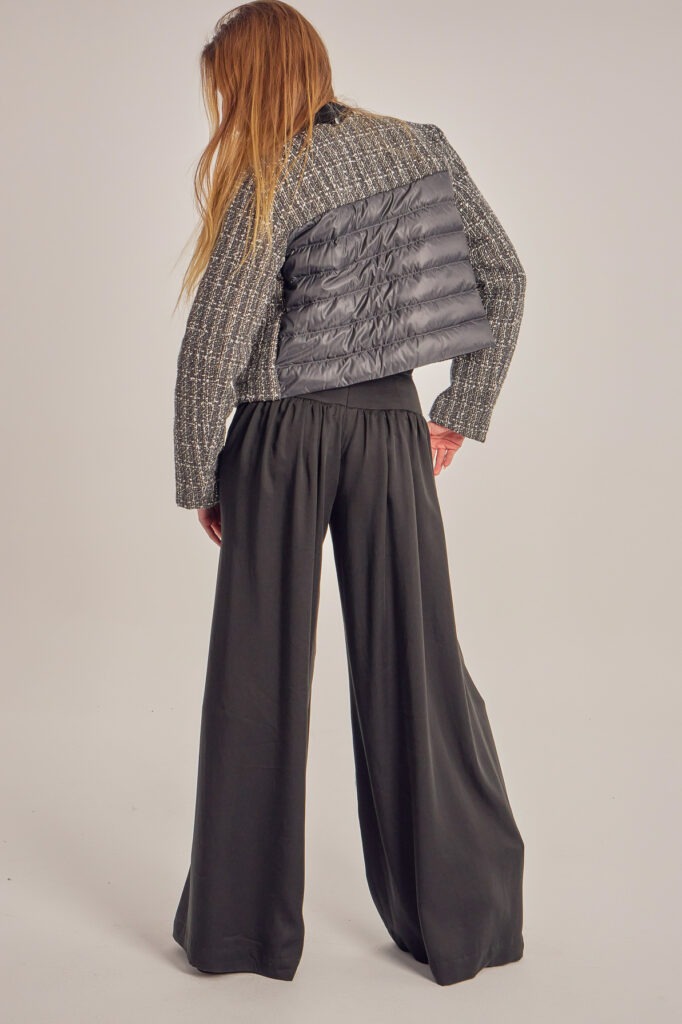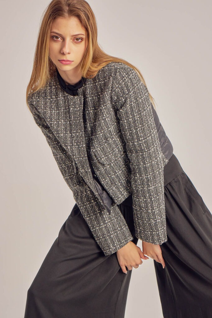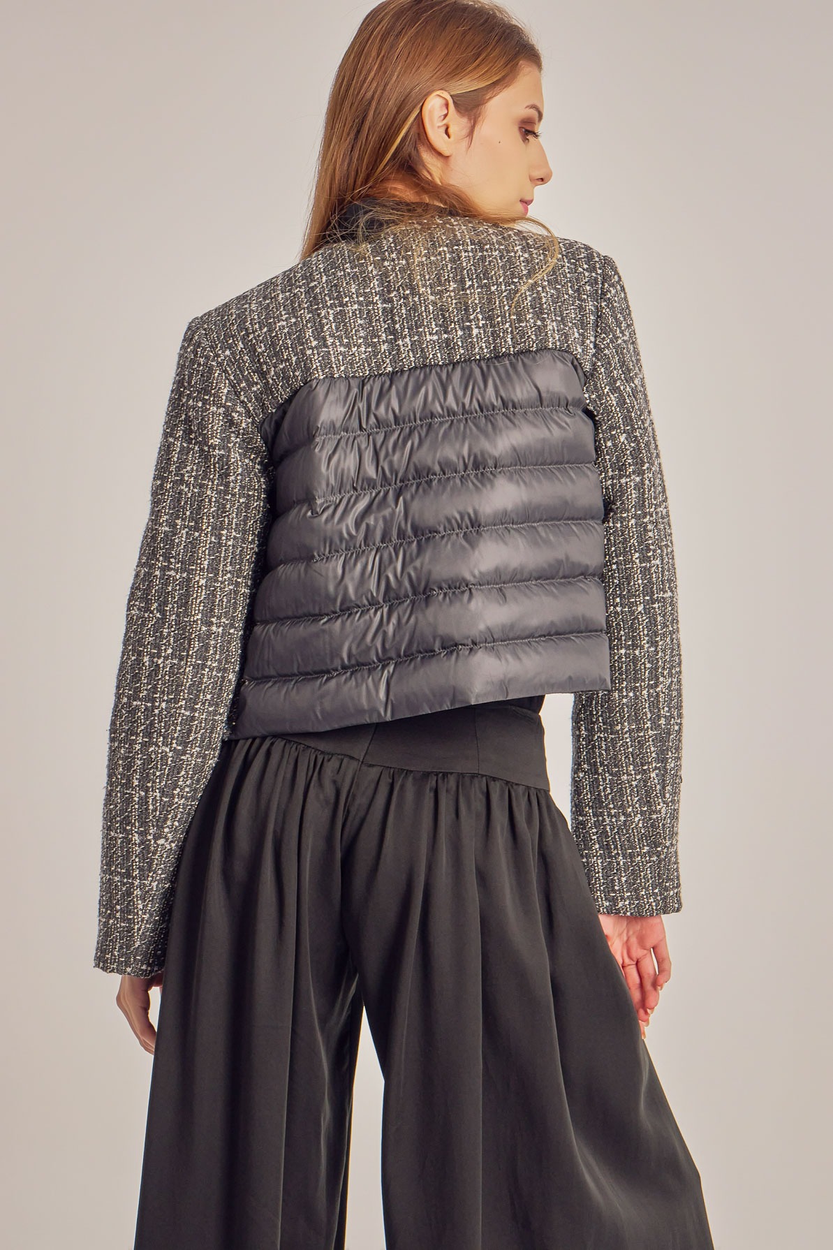 Jachetă din stofă, matlasată, cu puf natural la interior.