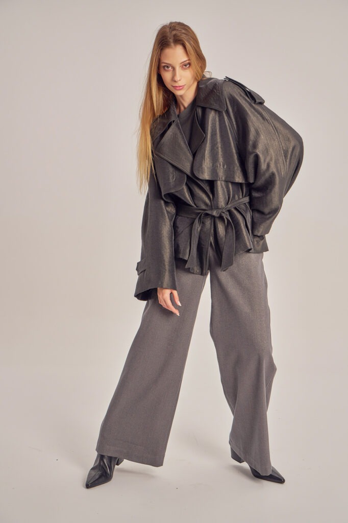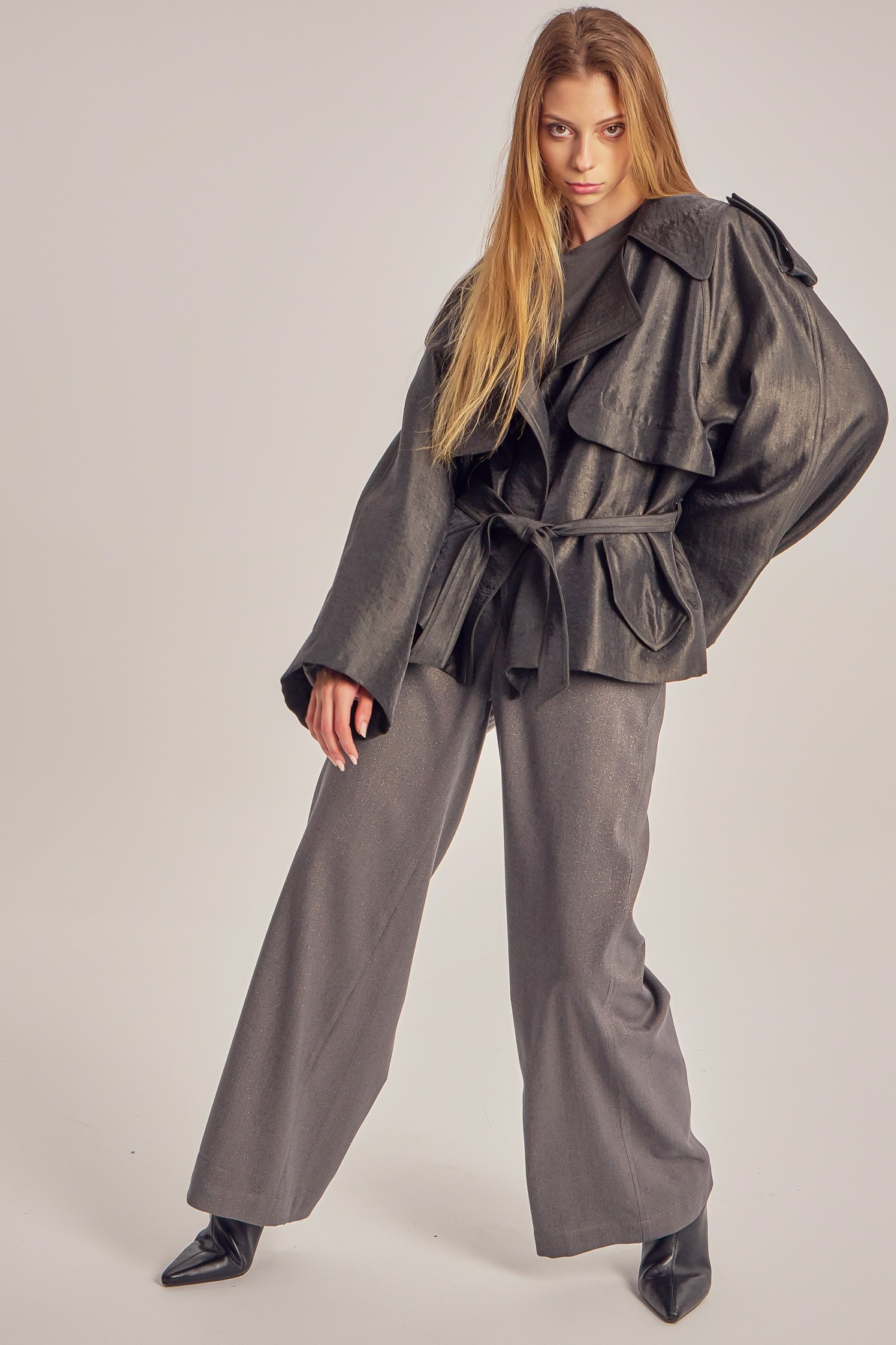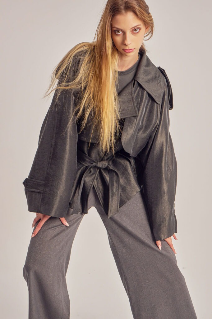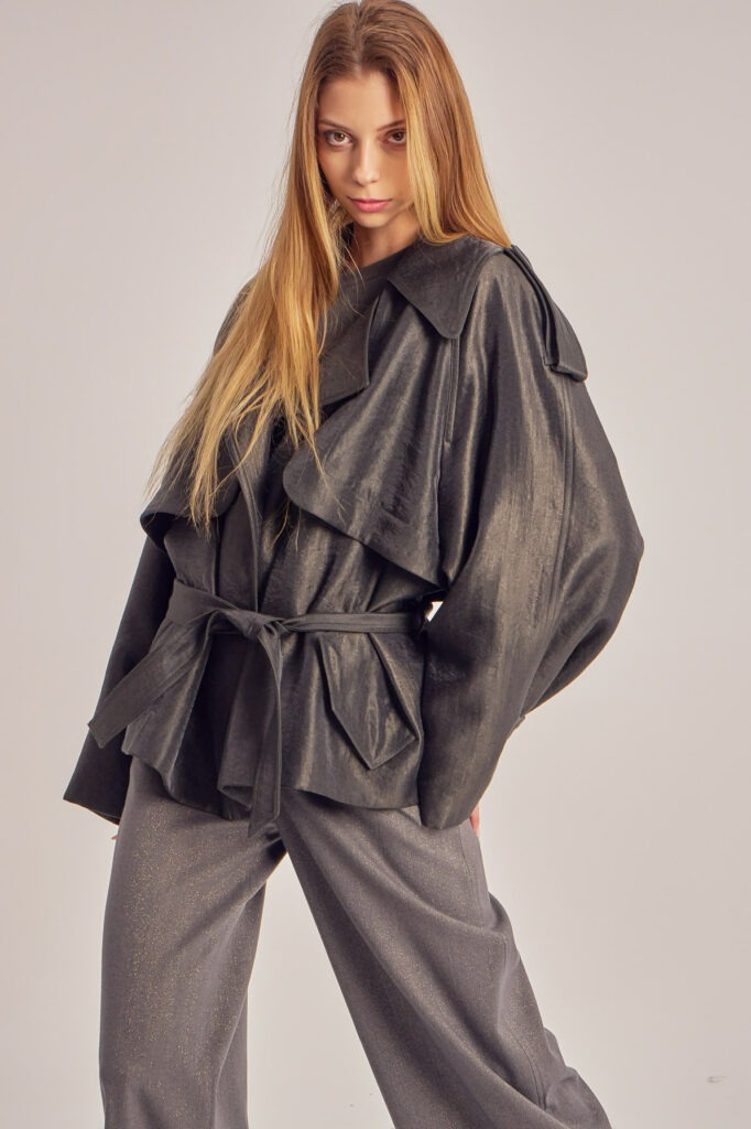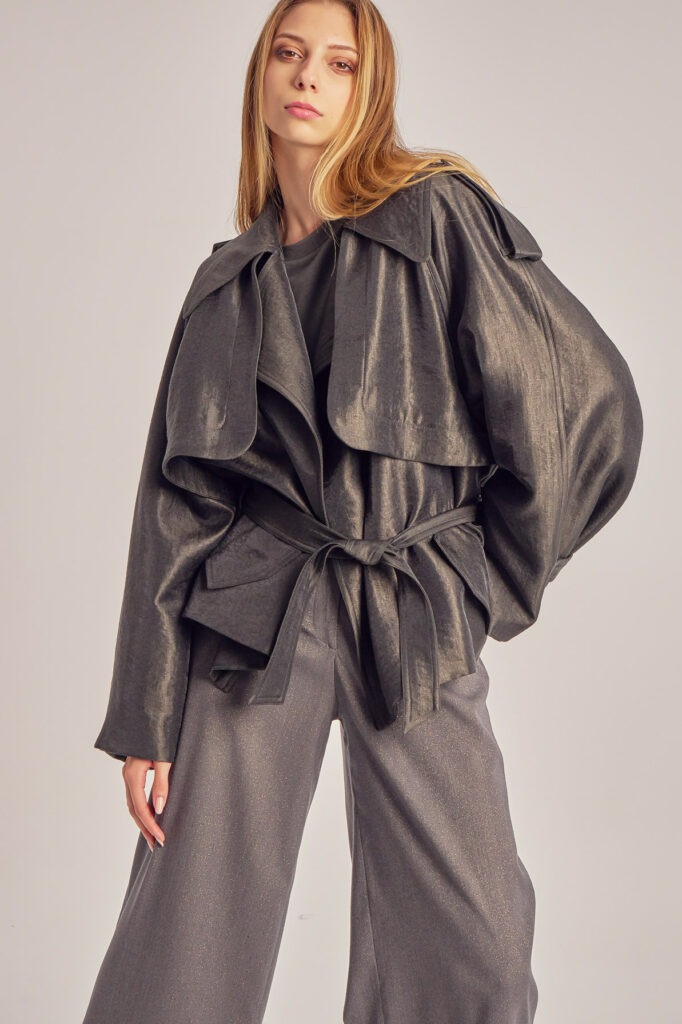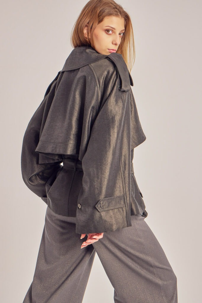 Jachetă largă cu detalii tip trench-coat, din material cu aspect metalizat.