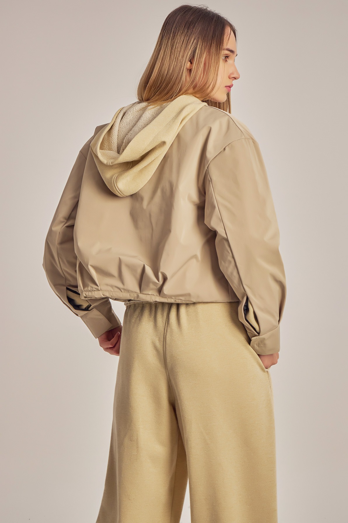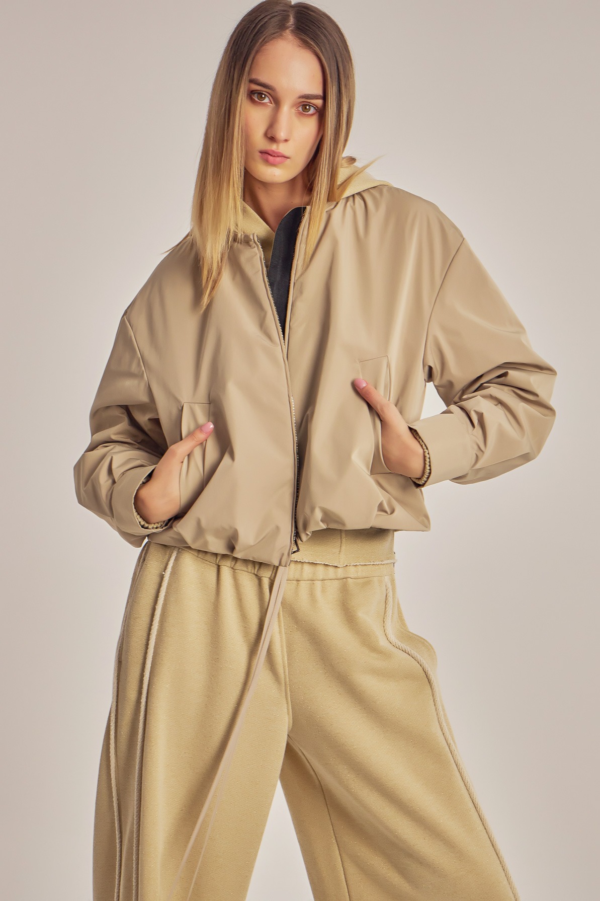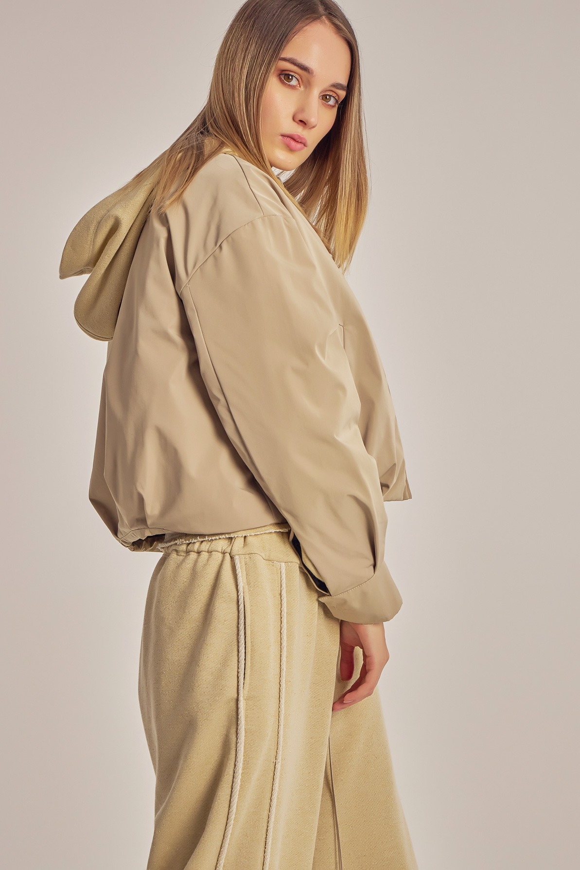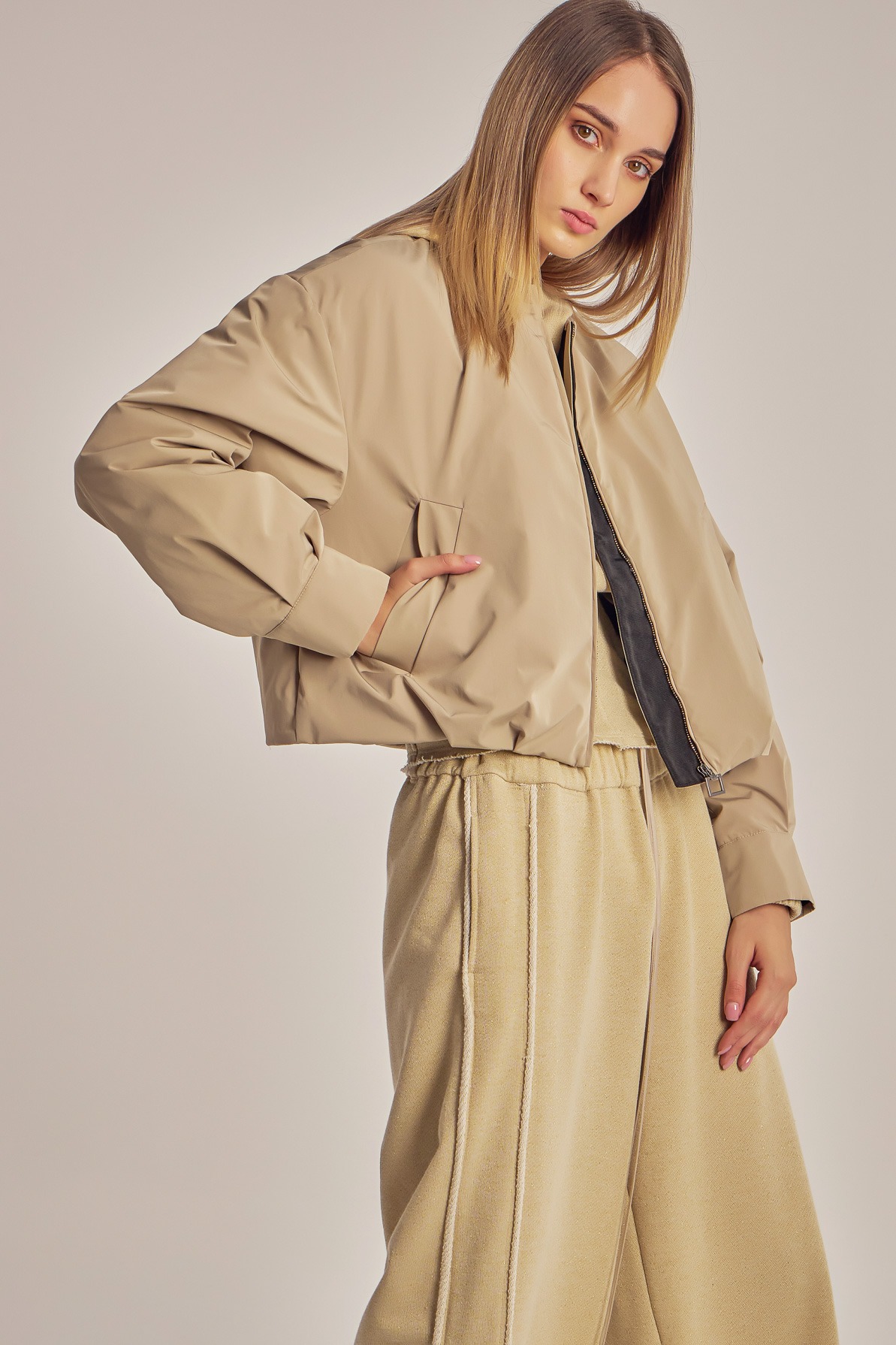 Jachetă scurtă matlasată, cu puf natural, croială lejeră, închidere cu fermoar și mâneci lungi cu umeri căzuți.