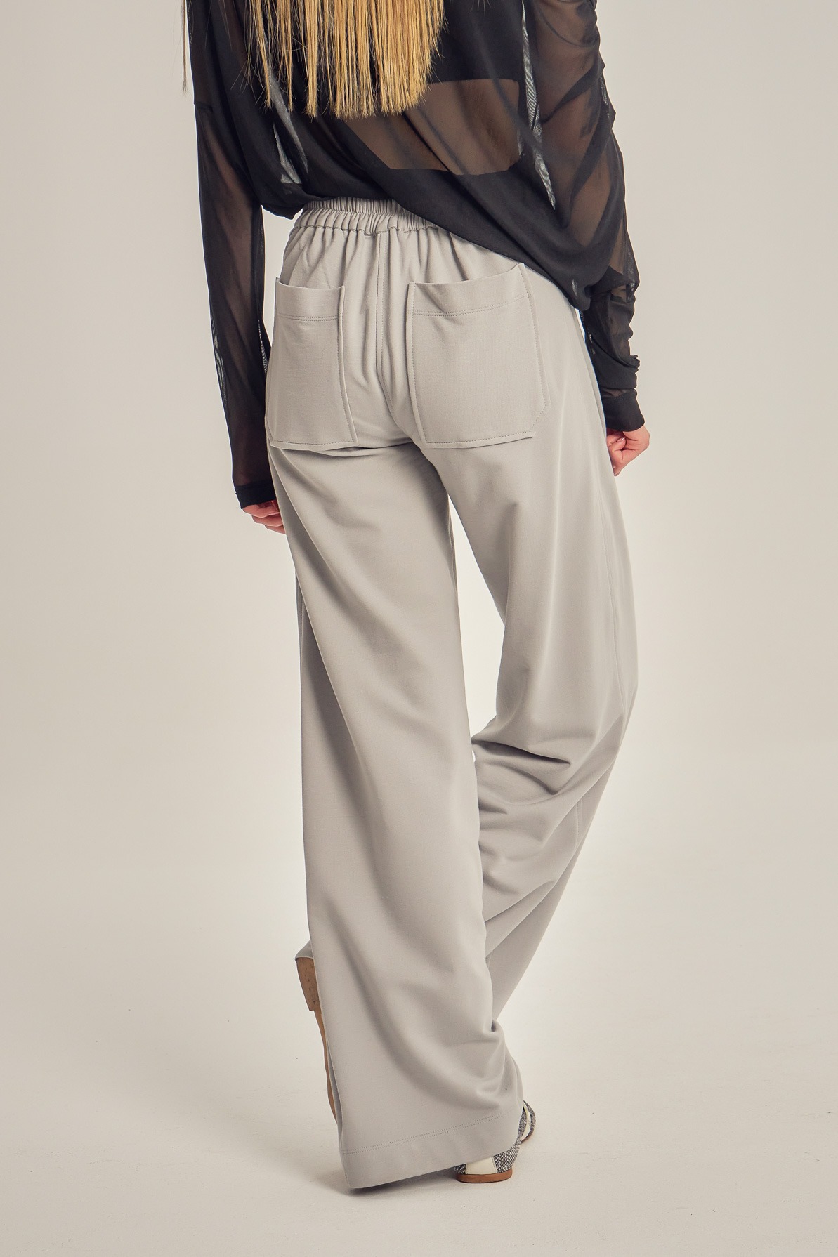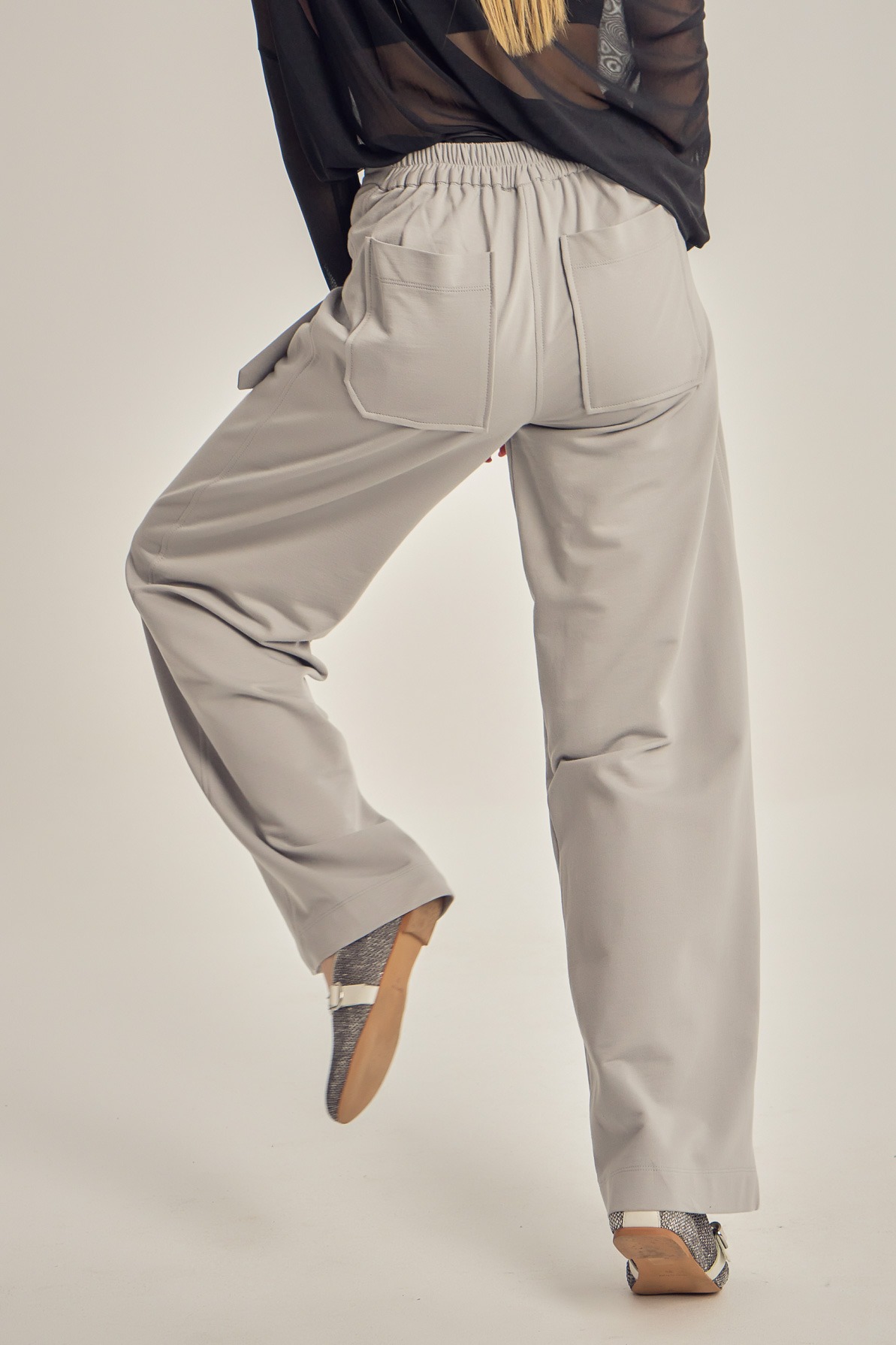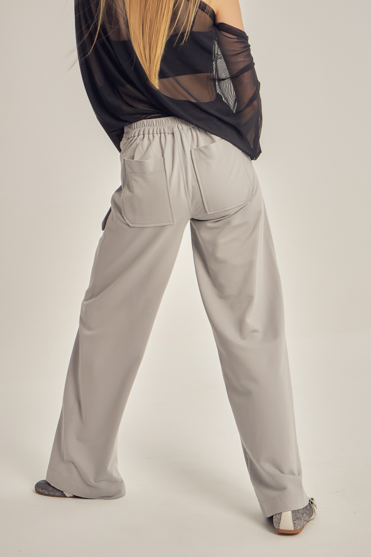 Pantaloni realizați din jerse de bumbac, cu cădere fluidă și croi lejer, gândiți pentru confort și libertate de mișcare. Talia este evidențiată printr-un cordon integrat, care permite ajustarea siluetei fără rigiditate.