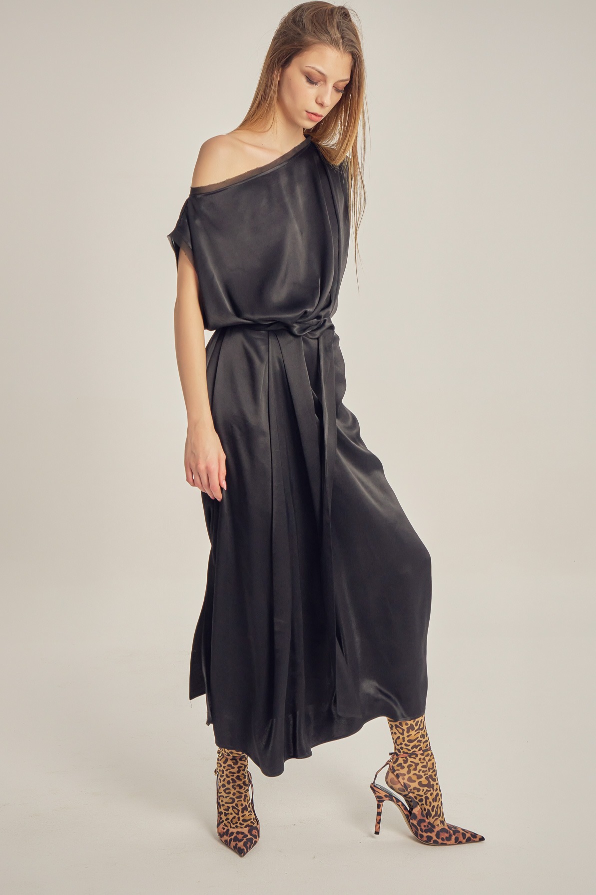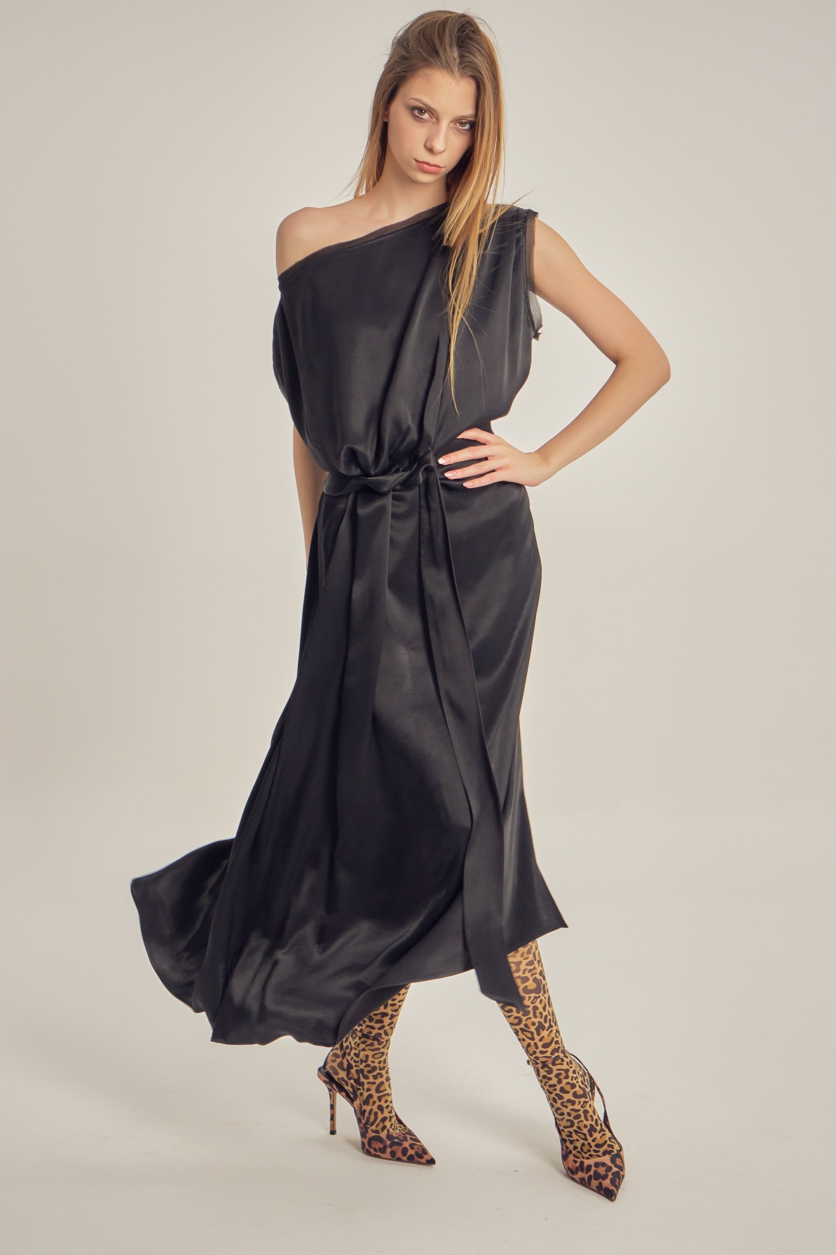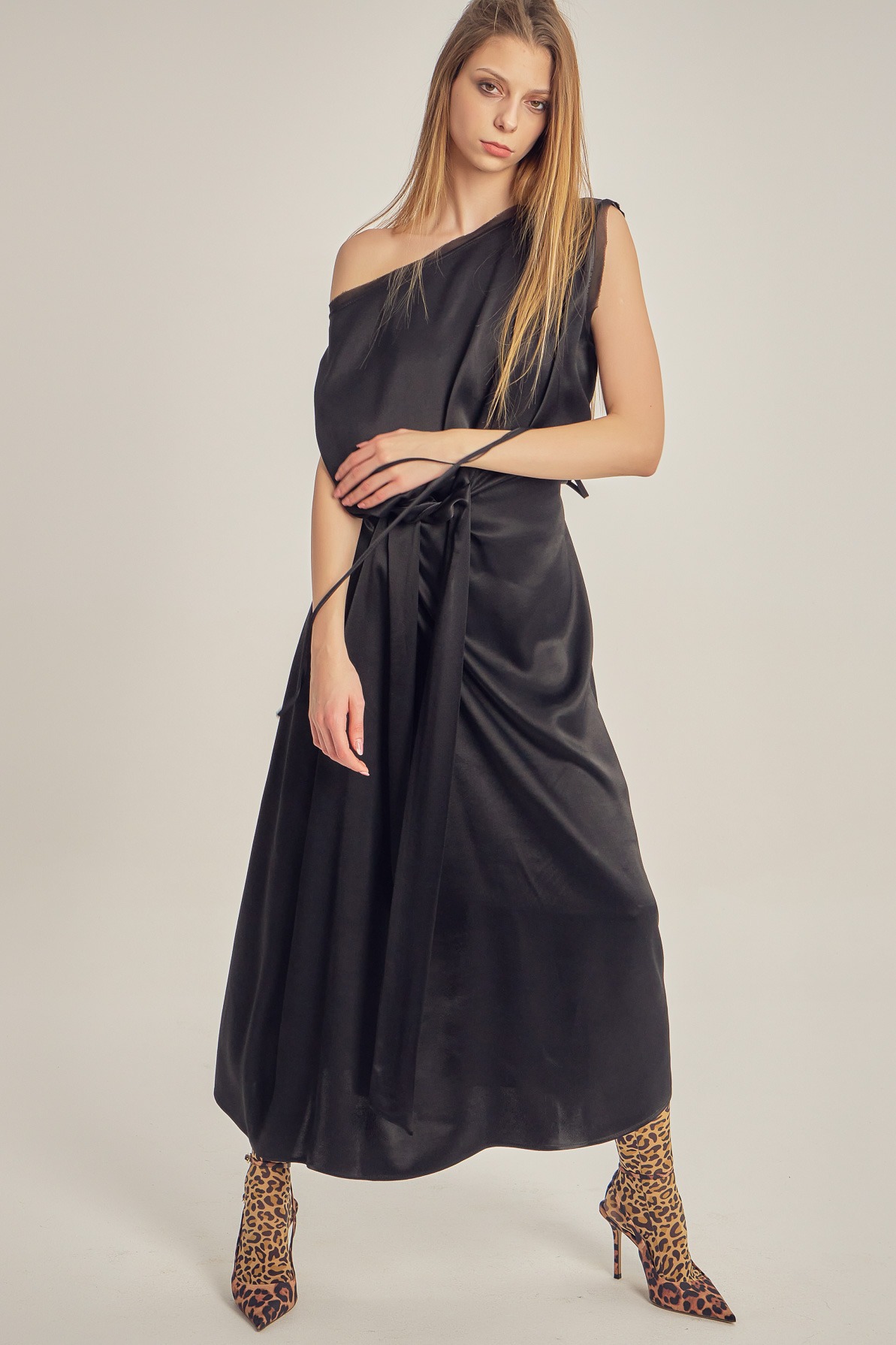 Rochie din vâscoză satinată, cu drapaj fluid și luciu delicat. Designul asimetric, cu umăr descoperit și detaliu de nod în talie, conturează elegant silueta și oferă un aer sofisticat, modern.