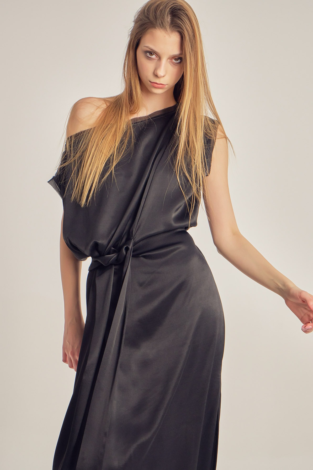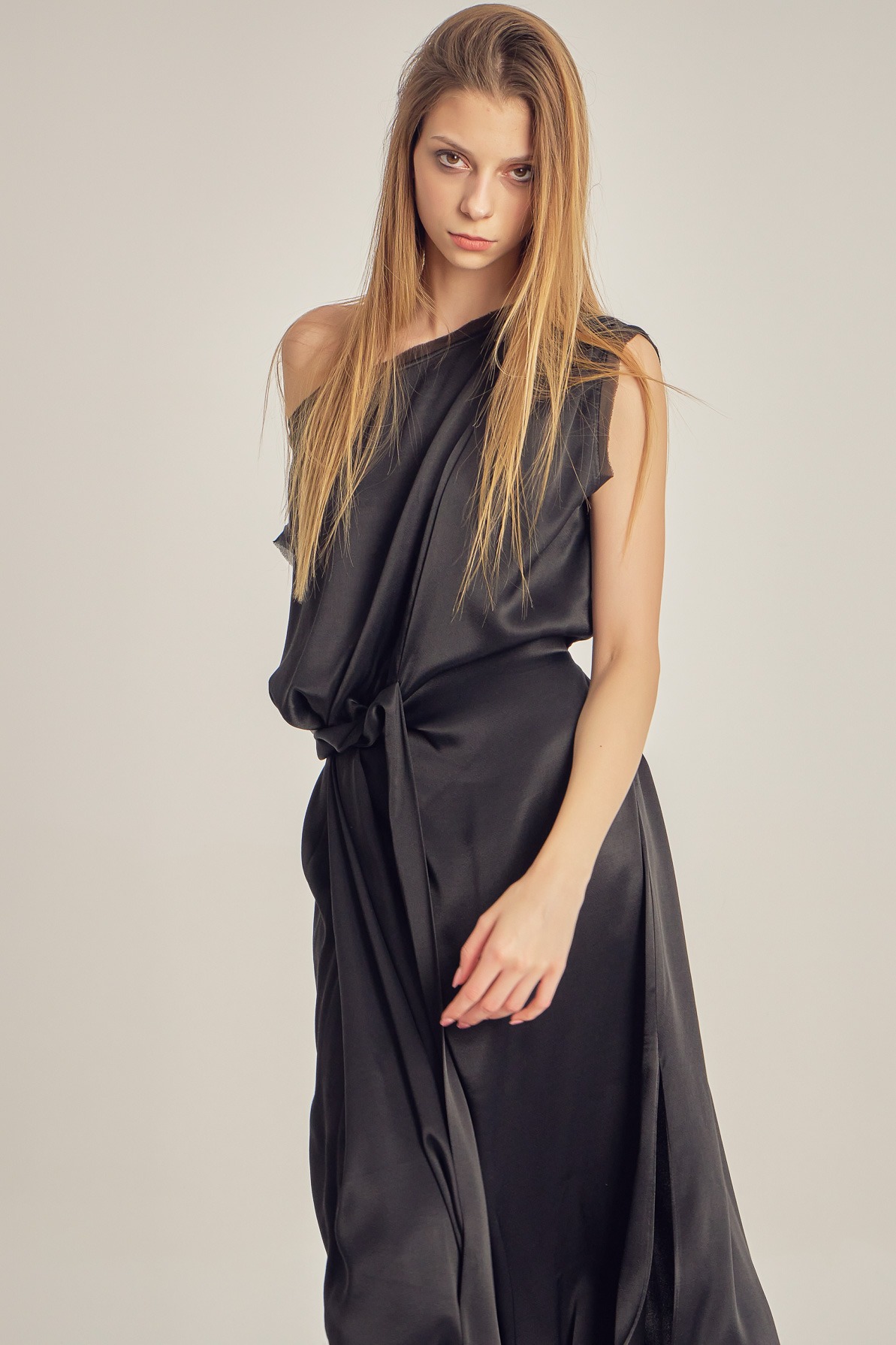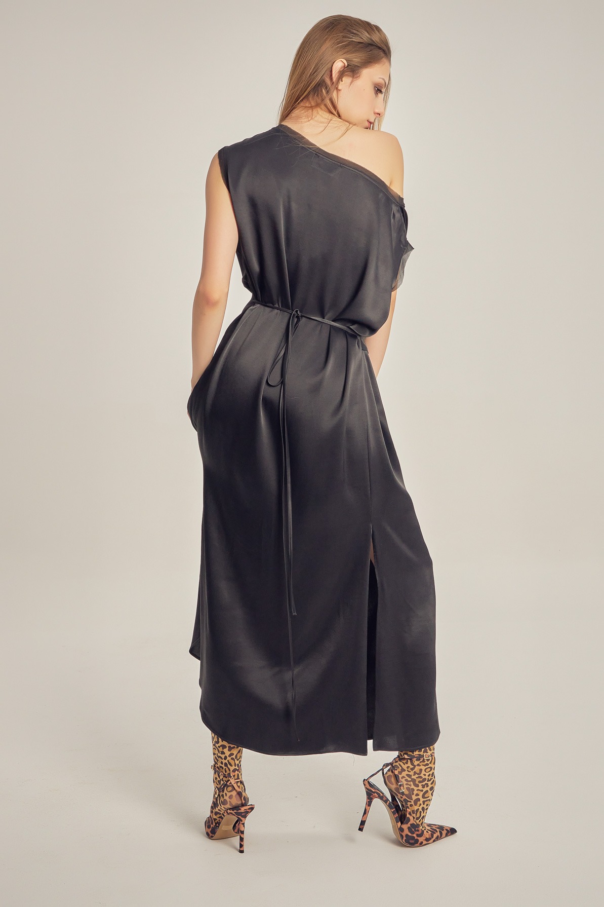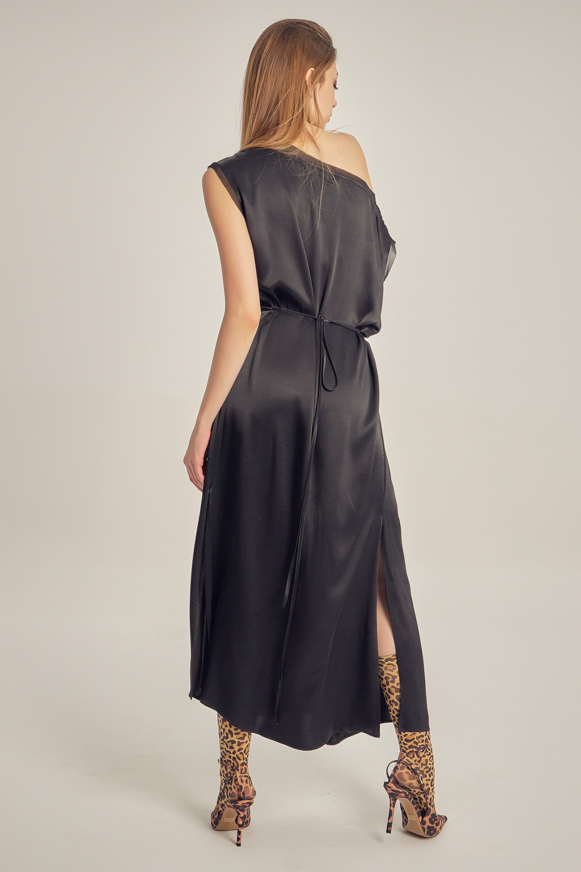 Rochie din vâscoză satinată, cu drapaj fluid și luciu delicat. Designul asimetric, cu umăr descoperit și detaliu de nod în talie, conturează elegant silueta și oferă un aer sofisticat, modern.