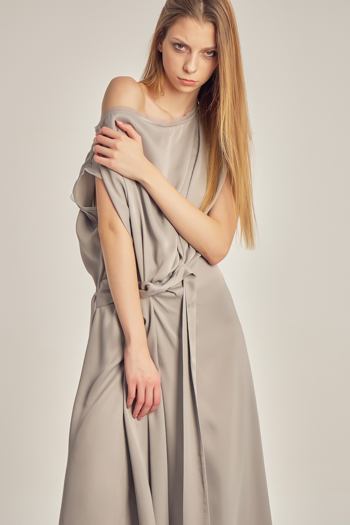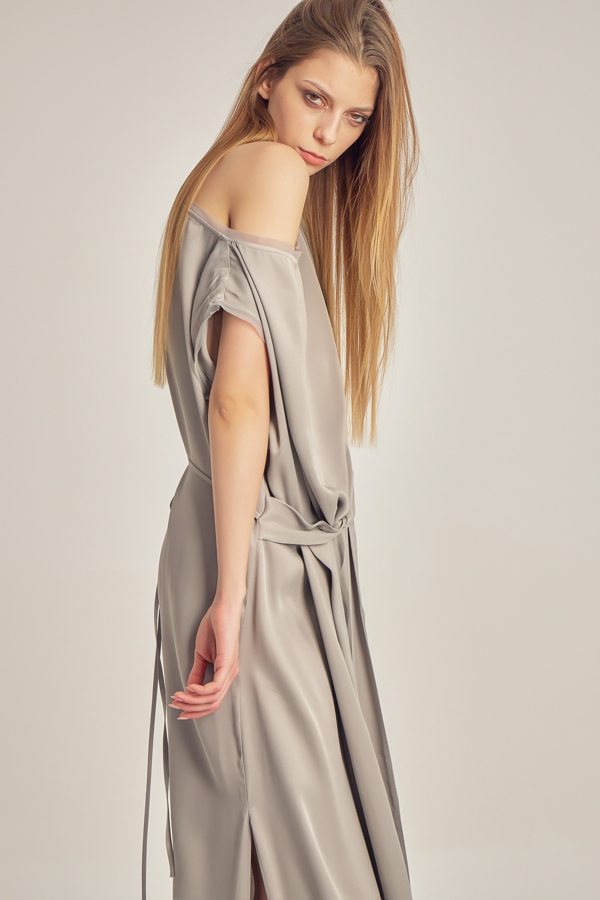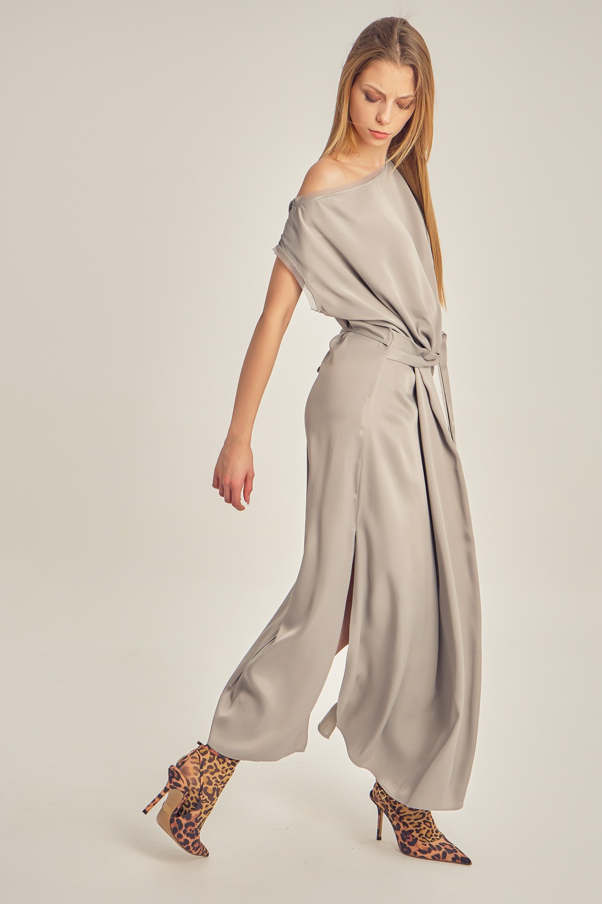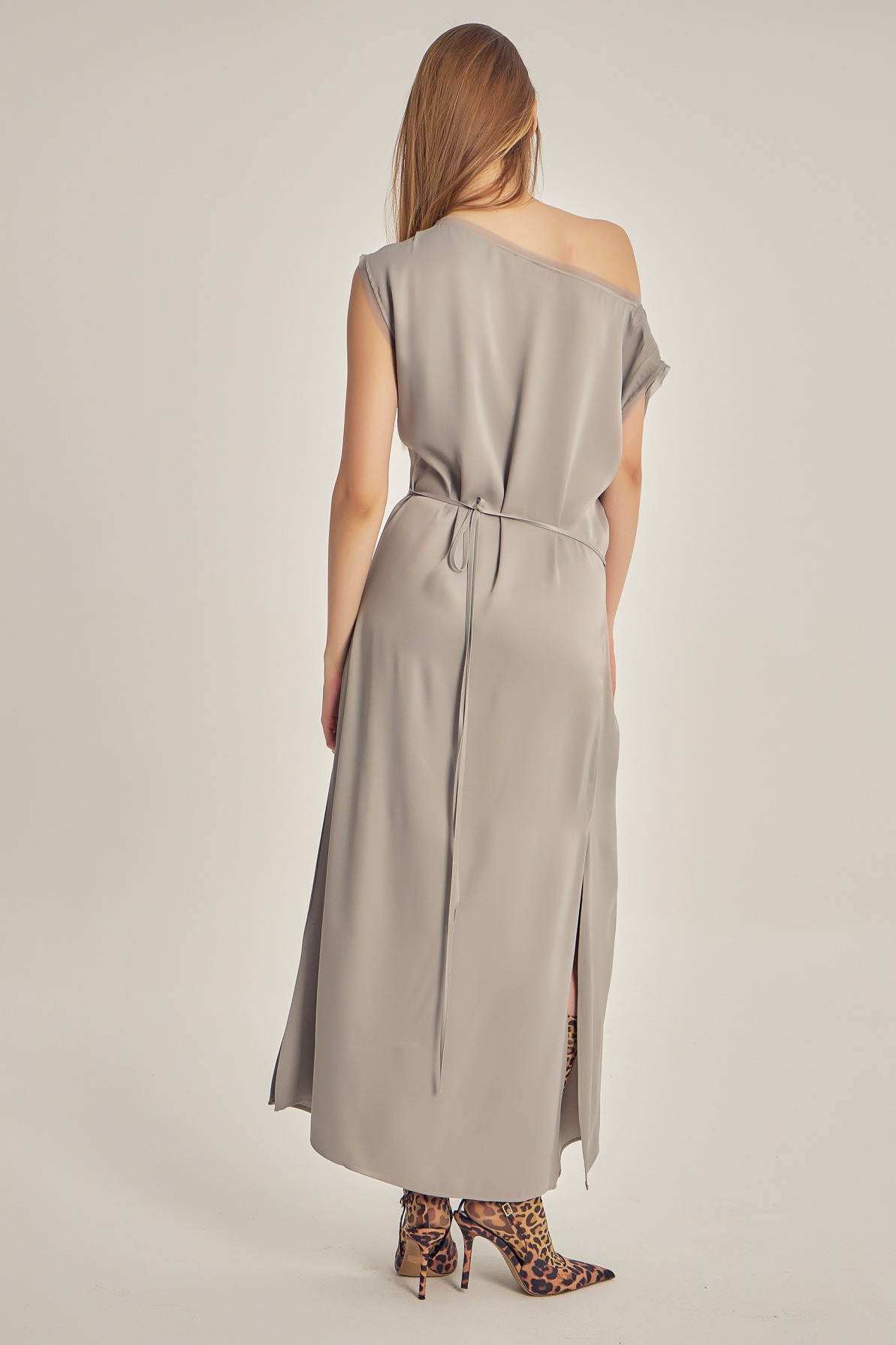 Rochie din vâscoză satinată, cu drapaj fluid și luciu delicat. Designul asimetric, cu umăr descoperit și detaliu de nod în talie, conturează elegant silueta și oferă un aer sofisticat, modern.