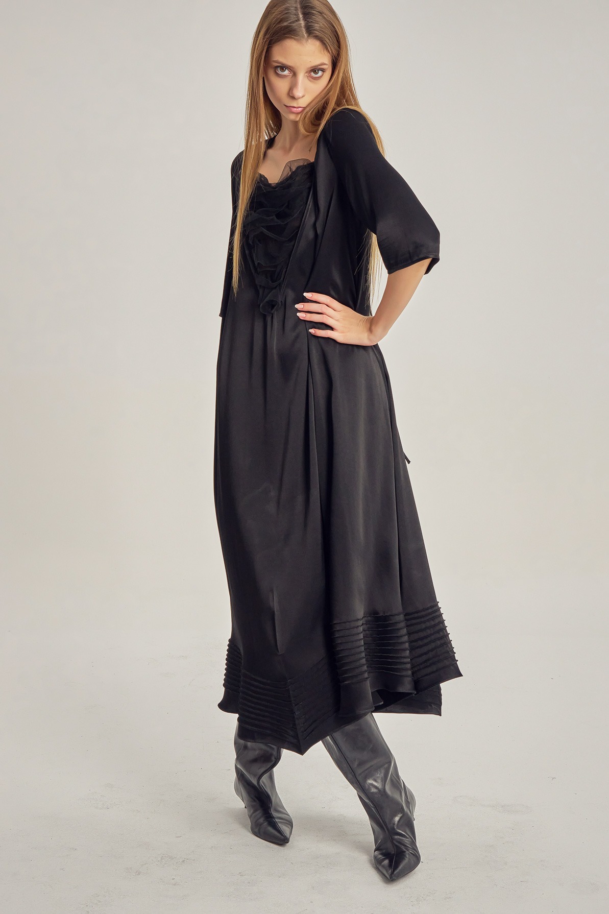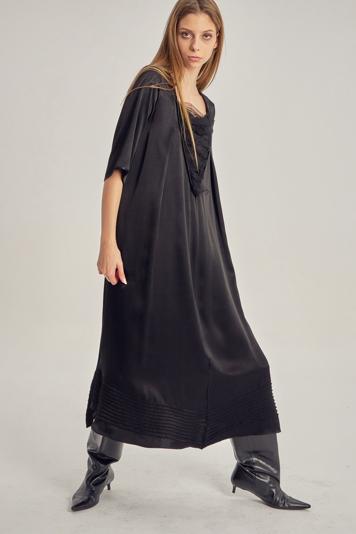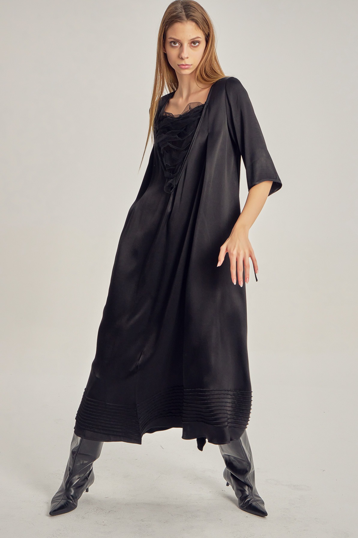 Rochie amplă din vâscoză, cu o siluetă fluidă și proporții atent echilibrate. Croiul lejer este definit de un fronseu discret în zona bustului, care adaugă profunzime vizuală fără a rigidiza linia. Partea inferioară este accentuată de un finisaj texturat, ce conferă structură și o greutate controlată mișcării.