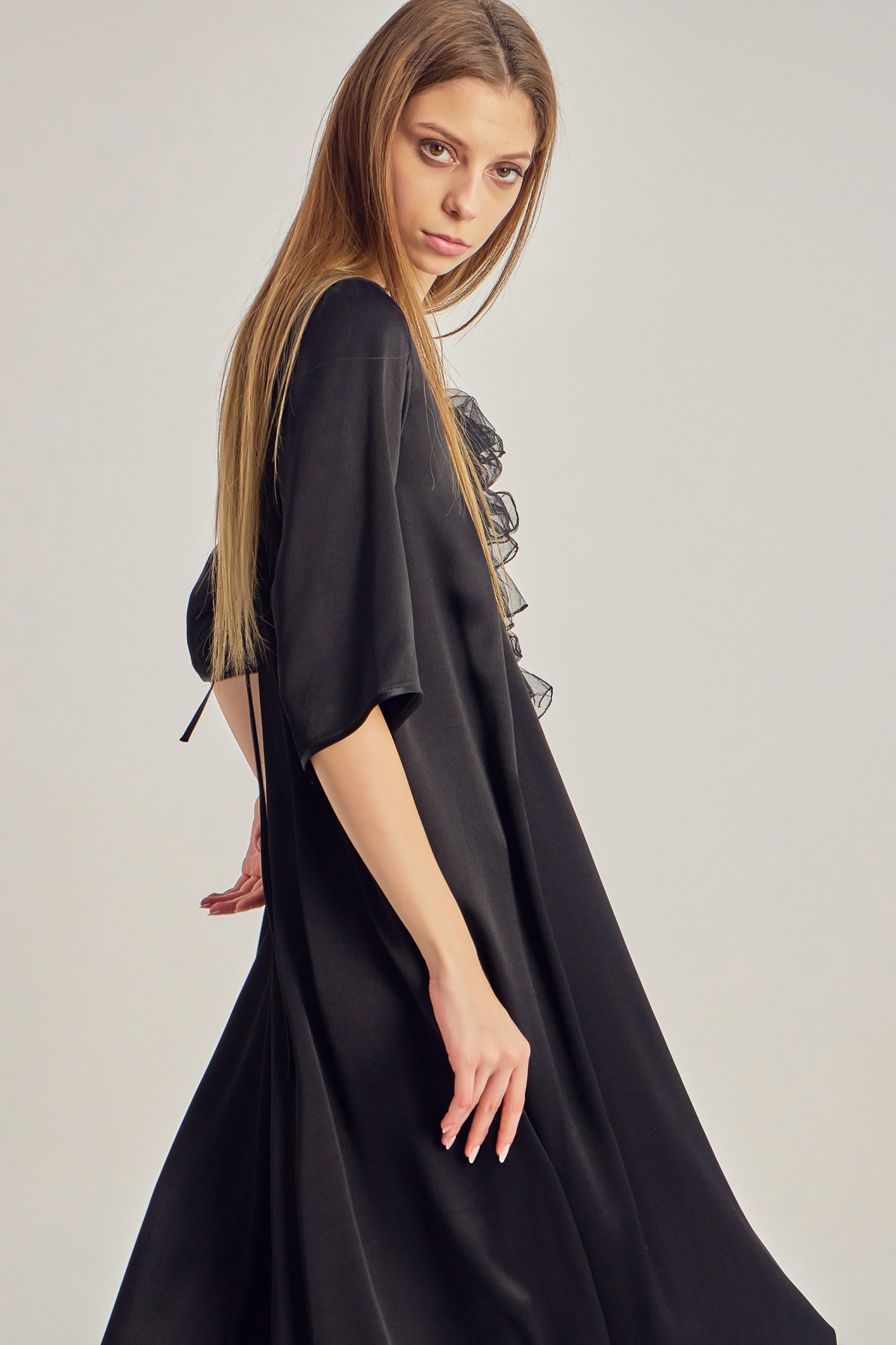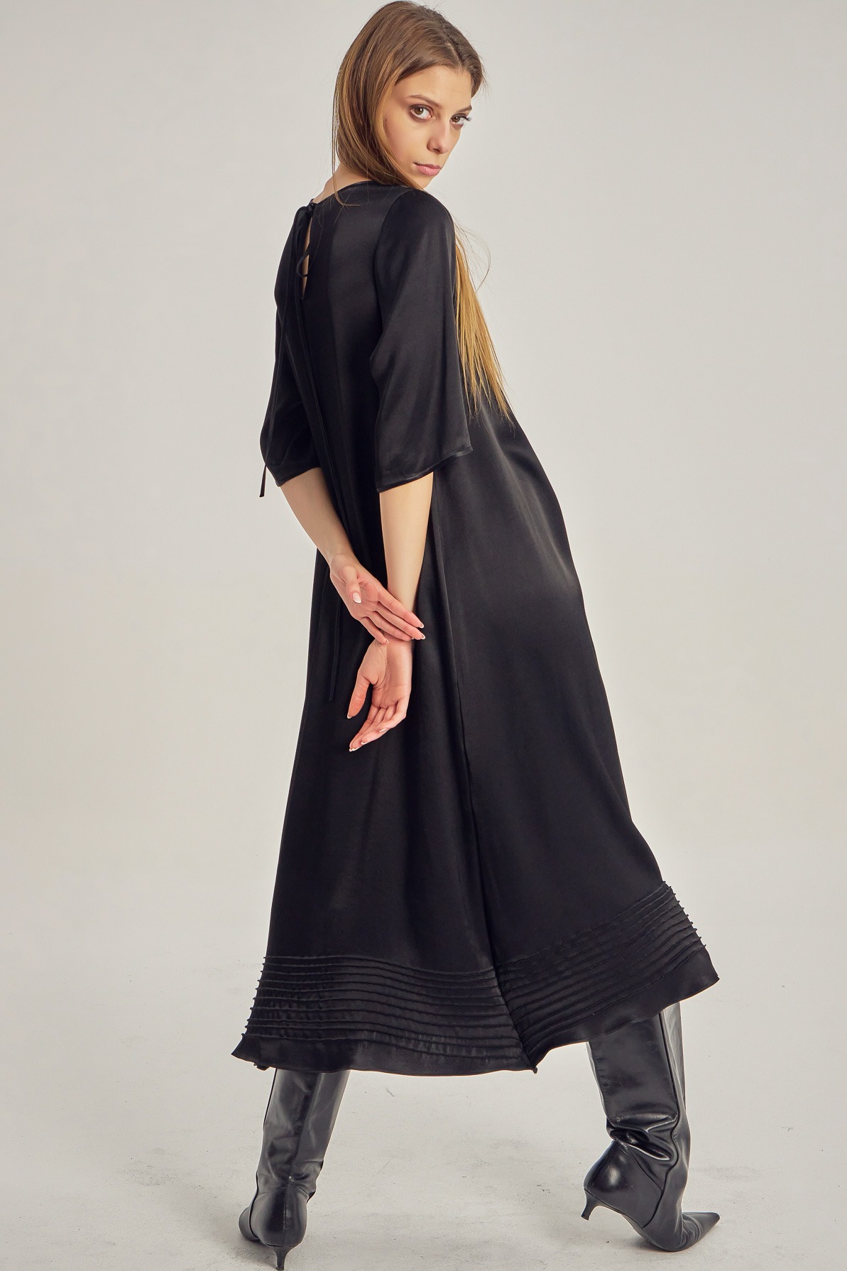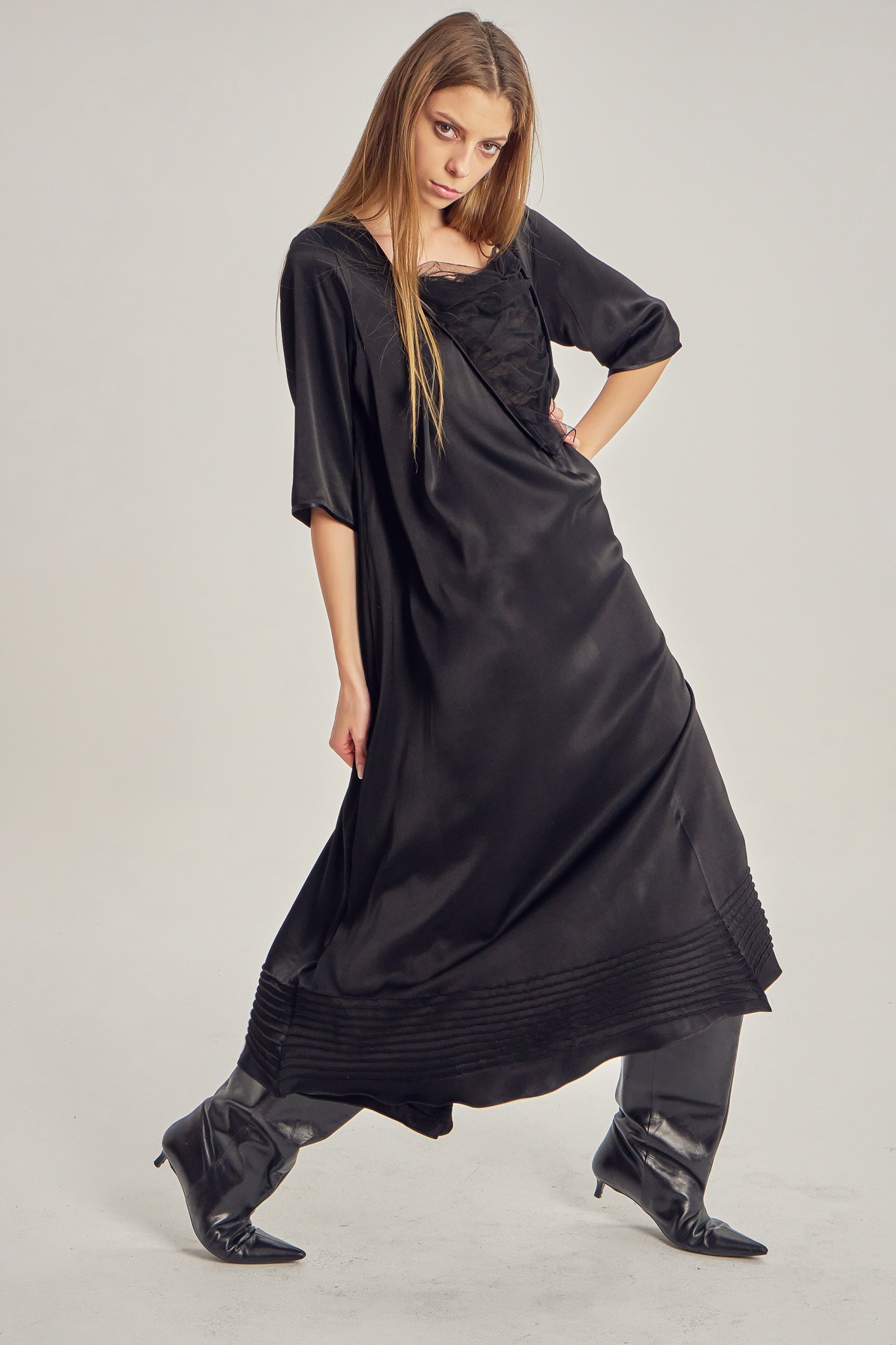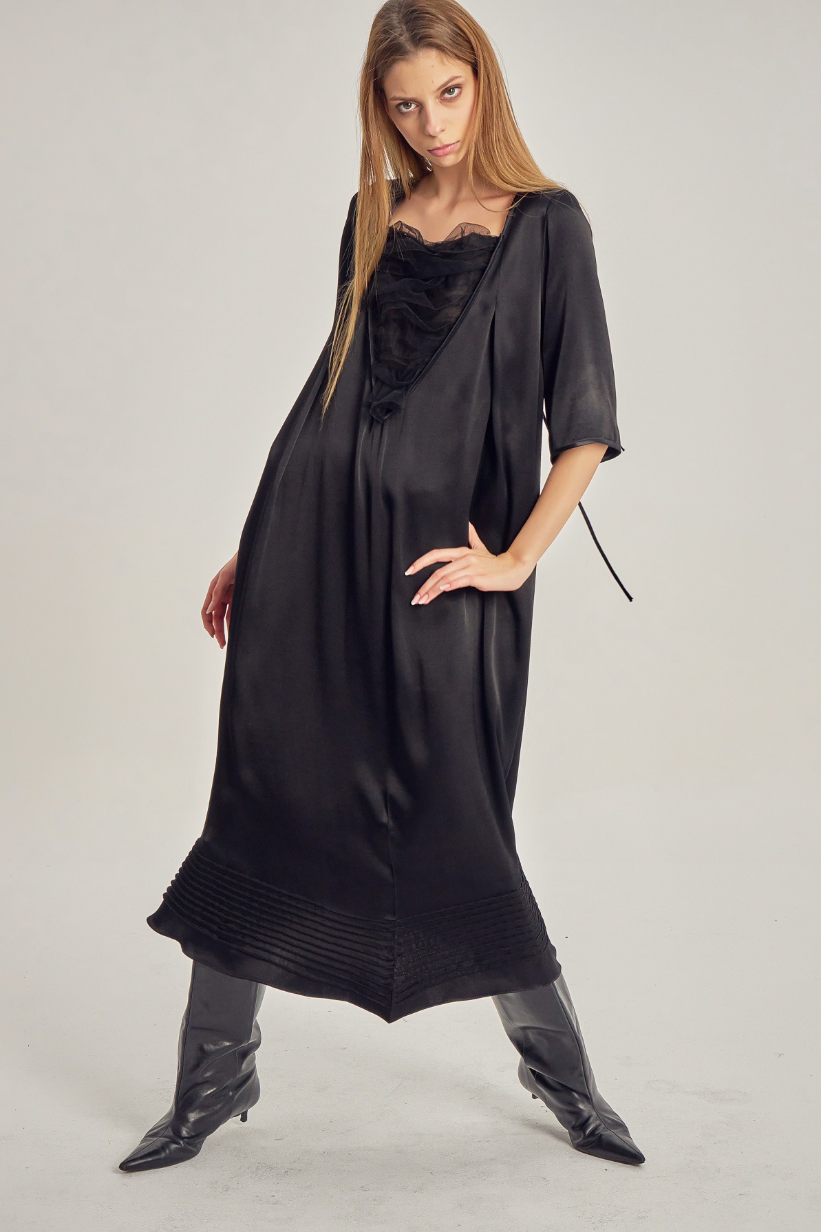 Rochie amplă din vâscoză, cu o siluetă fluidă și proporții atent echilibrate. Croiul lejer este definit de un fronseu discret în zona bustului, care adaugă profunzime vizuală fără a rigidiza linia. Partea inferioară este accentuată de un finisaj texturat, ce conferă structură și o greutate controlată mișcării.
