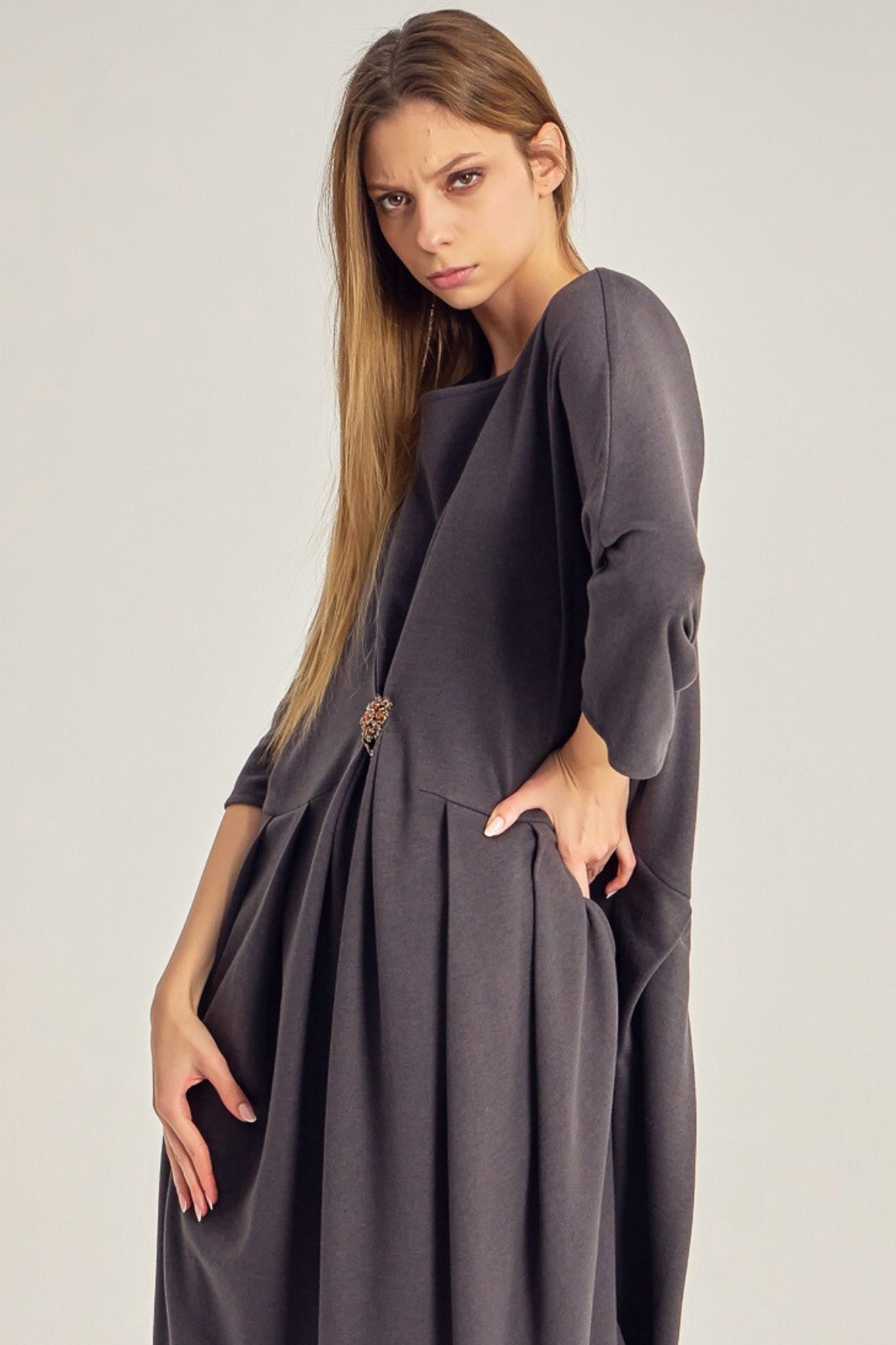 Rochie midi cu siluetă lejeră, realizată dintr-un material moale, cu un drapaj central fixat printr-un detaliu decorativ metalic. Mânecile 3/4 și croiala fluidă oferă libertate de mișcare și o estetică structurată, dar relaxată. O piesă versatilă, potrivită pentru zi și pentru momente casual-elegante.