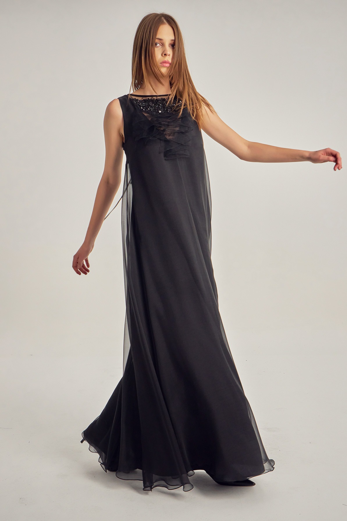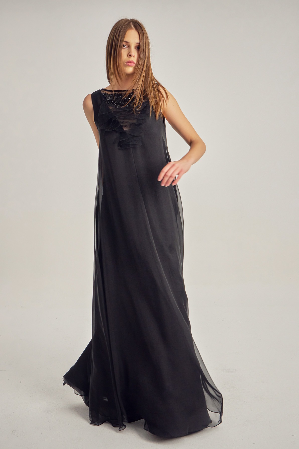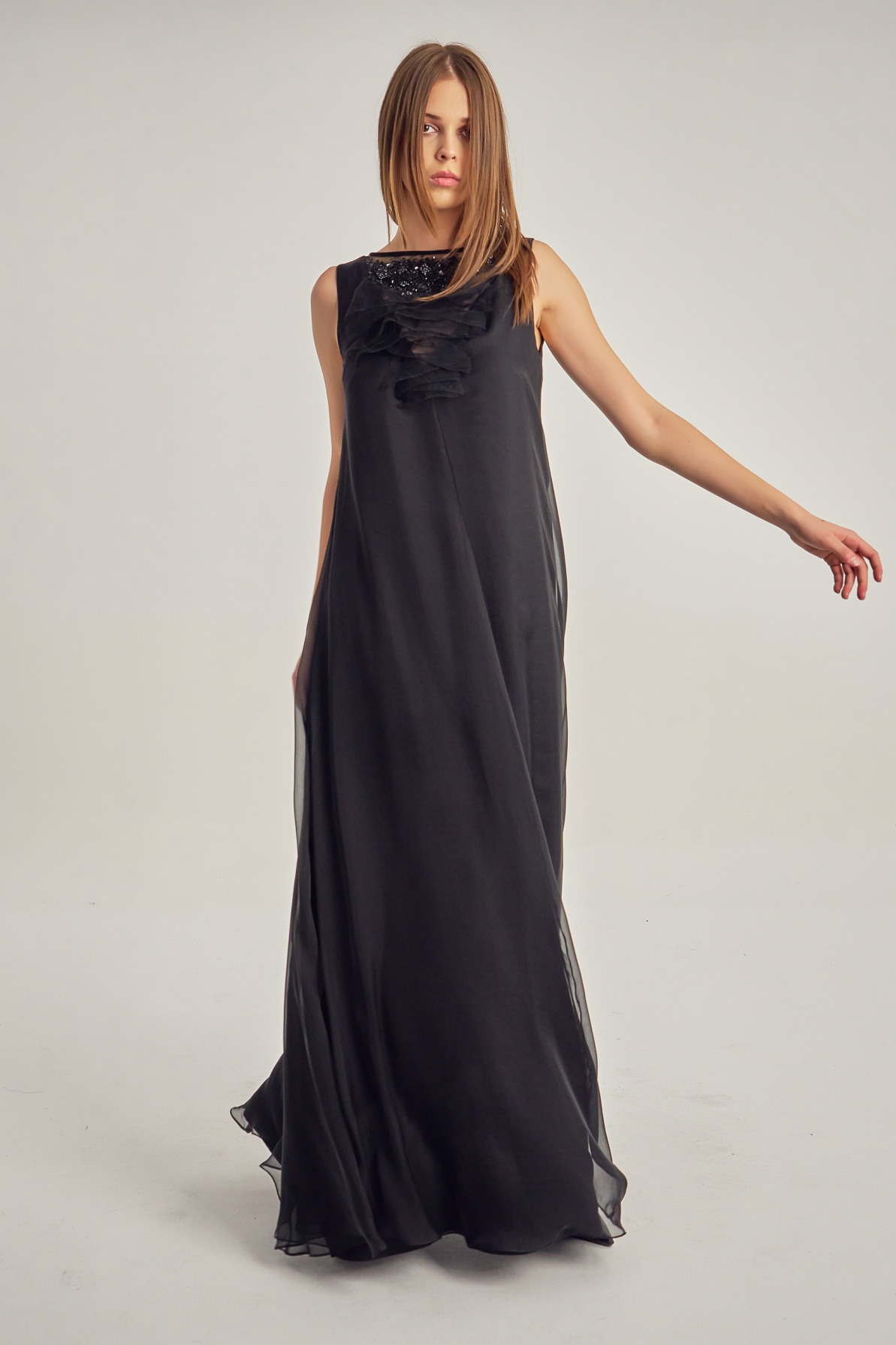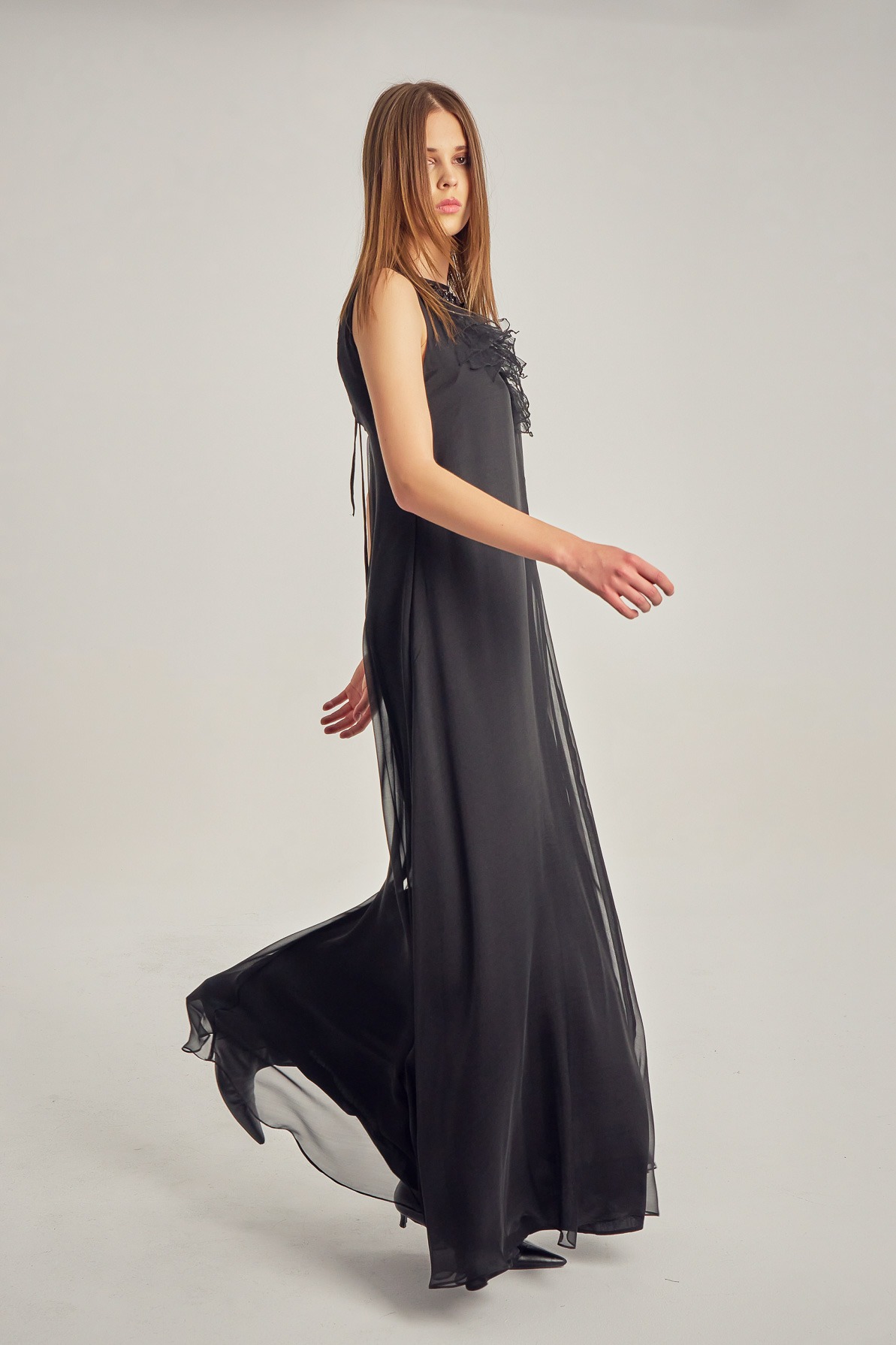 Rochie elegantă din mătase, cu linie fluidă și detalii subtile care pun accent pe siluetă. Designul fără mâneci este completat de un decupaj delicat în zona bustului, evidențiat de aplicații decorative cu paiete, pentru un contrast rafinat între transparență și opacitate. Căderea ușoară a materialului și suprapunerea fină creează un efect de mișcare naturală, ideal pentru apariții de seară sau evenimente speciale.